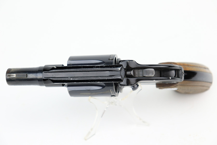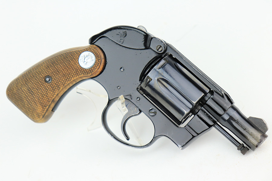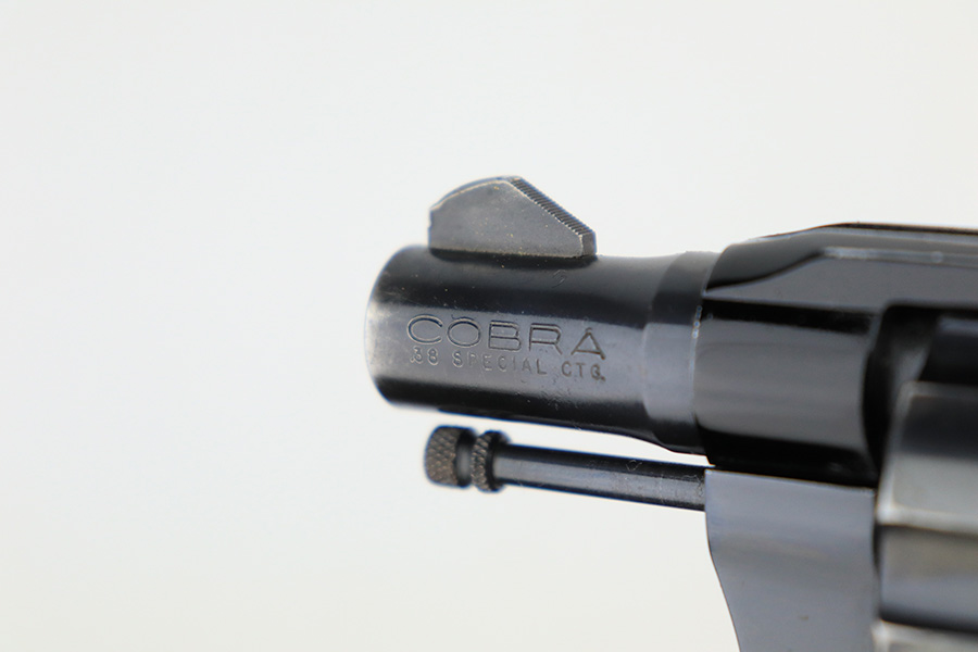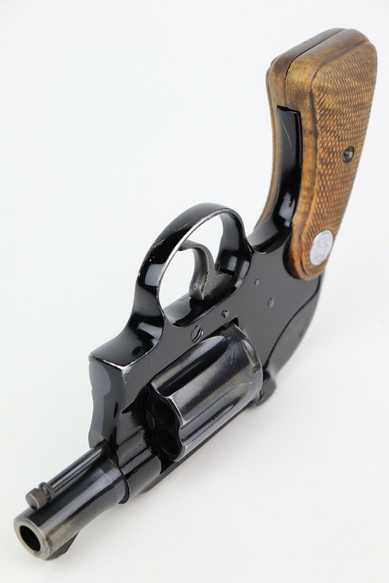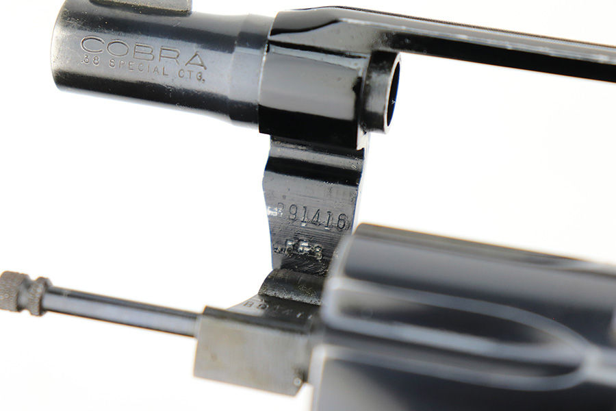 4/26/22 – This is a nice example of a 2″ Colt Cobra Revolver manufactured in 1972. The gun is all matching, has a lightweight aluminum frame, and comes equipped with a Colt hammer guard. It has retained about 90-92% of its original finish. Most of the finish loss is on the left side of the frame, but there is noticeable finish loss and some oxidation around the muzzle. Some light scratches on the underside of the trigger guard and on the grip straps. On the cylinder – hints of wear on the high edges and a very light roll mark. The cylinder is tight, and the action is smooth. Comes with excellent wood grips. Mint bore.