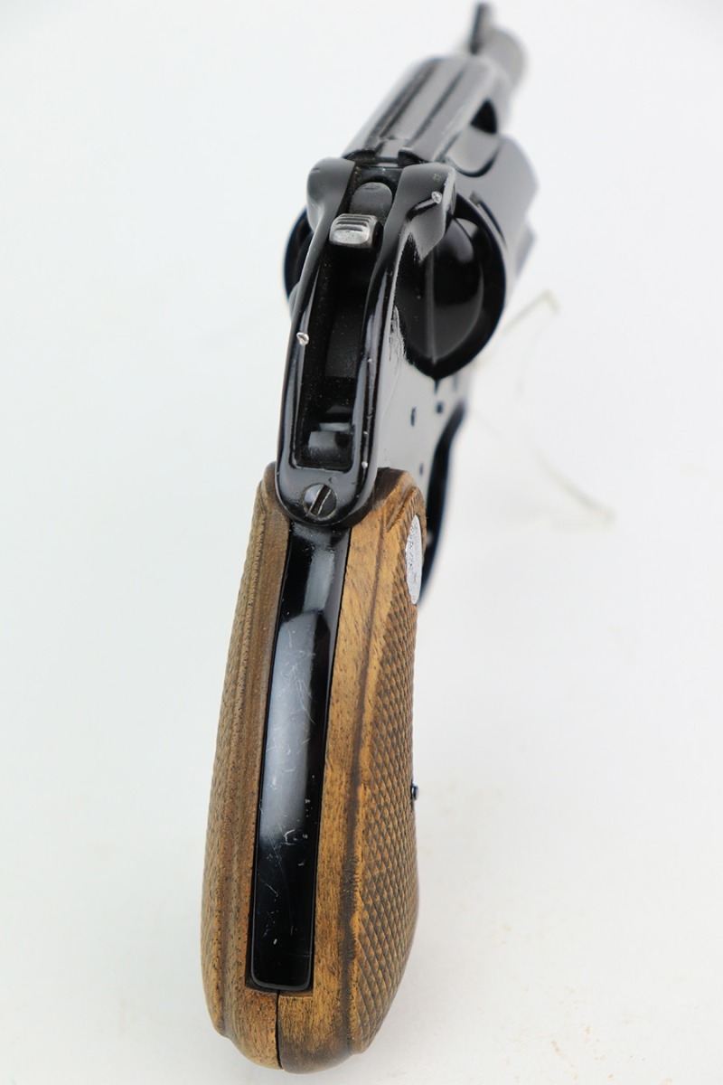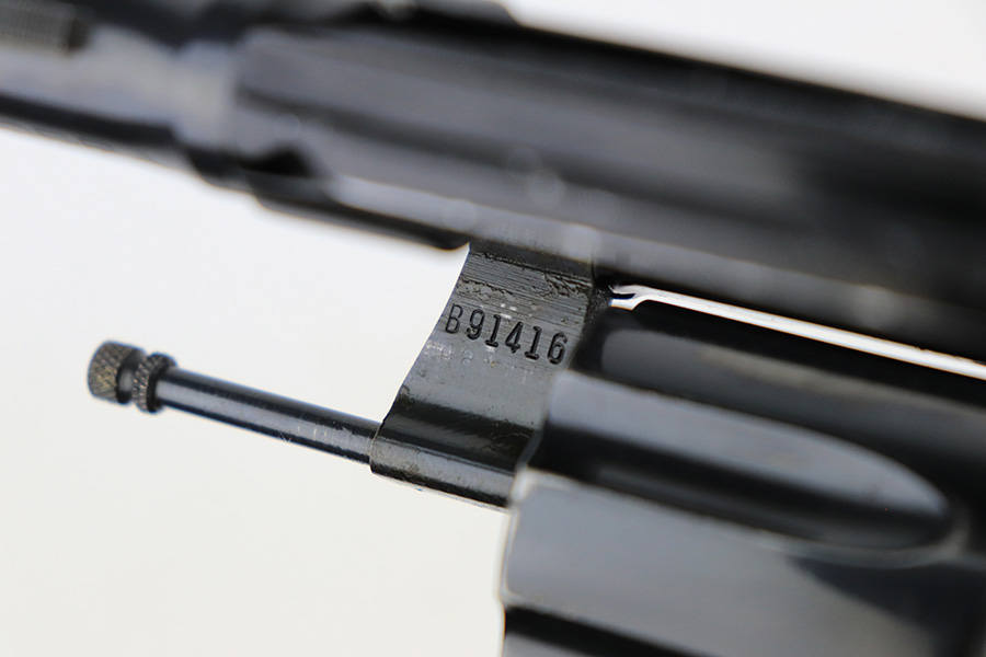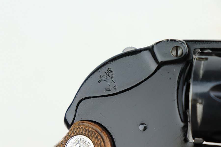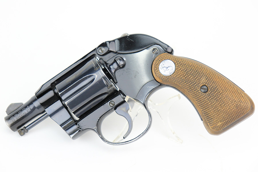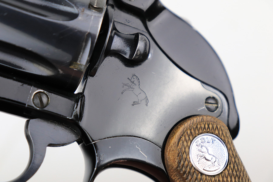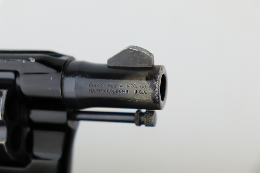 4/26/22 – This is a nice example of a 2″ Colt Cobra Revolver manufactured in 1972. The gun is all matching, has a lightweight aluminum frame, and comes equipped with a Colt hammer guard. It has retained about 90-92% of its original finish. Most of the finish loss is on the left side of the frame, but there is noticeable finish loss and some oxidation around the muzzle. Some light scratches on the underside of the trigger guard and on the grip straps. On the cylinder – hints of wear on the high edges and a very light roll mark. The cylinder is tight, and the action is smooth. Comes with excellent wood grips. Mint bore.