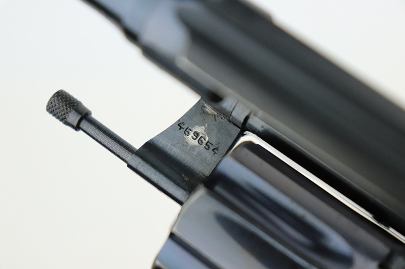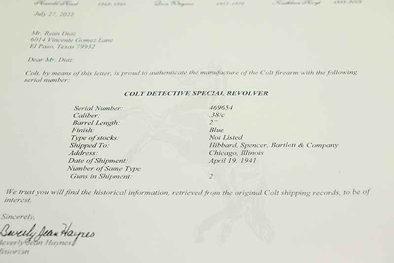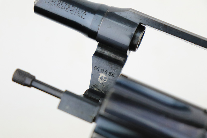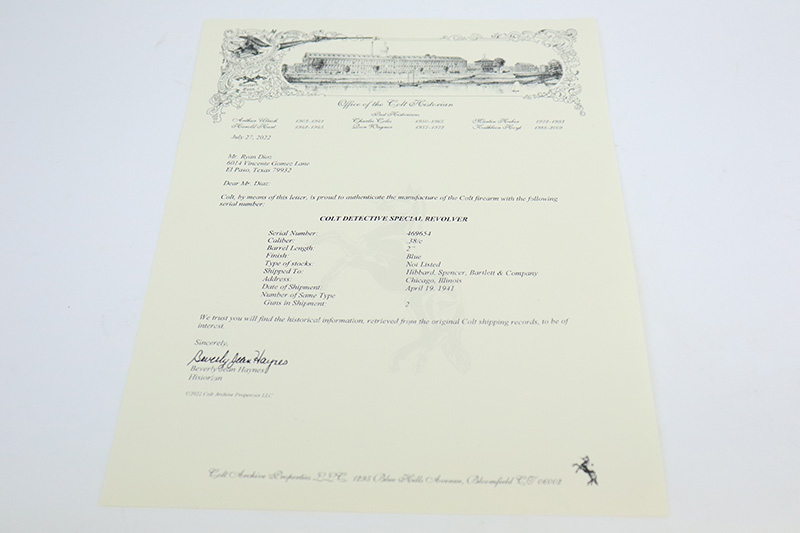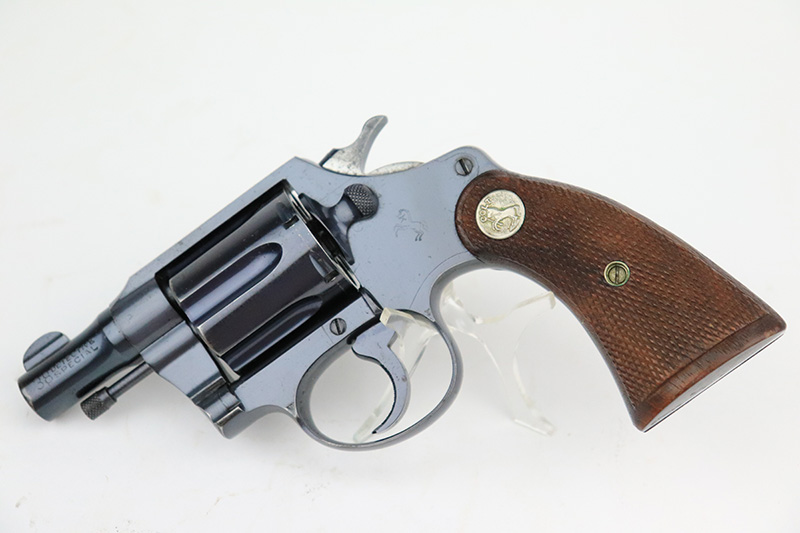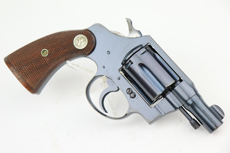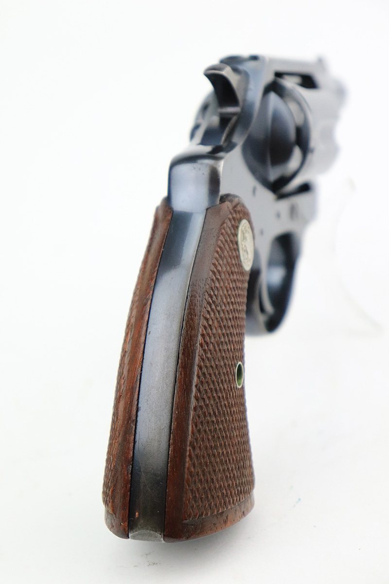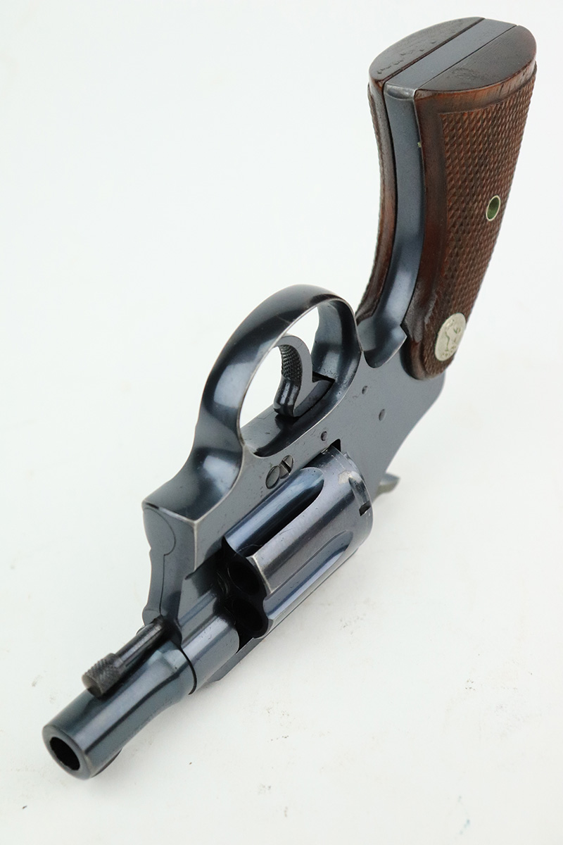 8/15/22 – This is a very nice example of an early, first series Colt Detective Special from 1941. The first series revolvers used a narrower frame, with a shorter ejector rod, checkered hammer spur, half-moon front sight, and a square butt in some instances. It comes with a Colt archive letter stating it was shipped in April of that year to a retailer/sporting goods store. The original blue rates at about 93-95%, with minor wear around the muzzle, on the edges of the square butt, and a little more on the cylinder. Minty bore. Nice grips with sharp wood checkering.