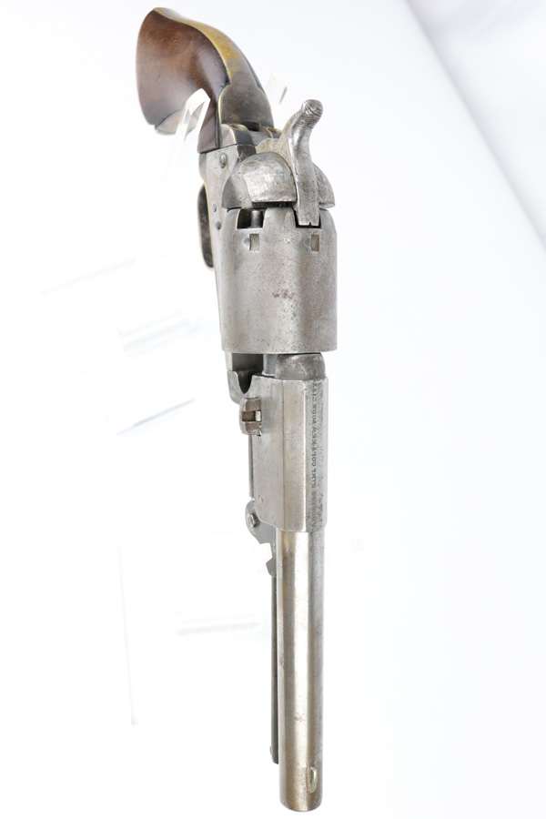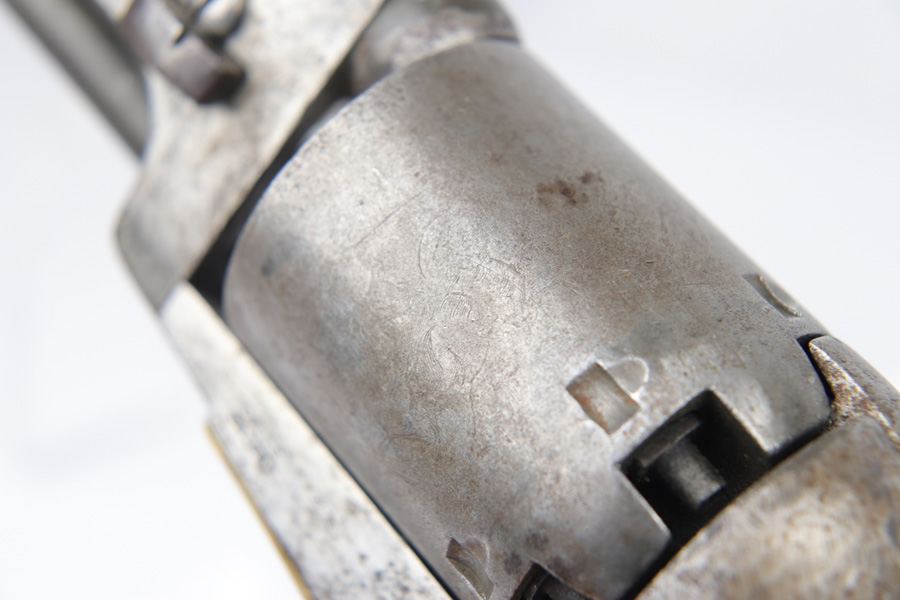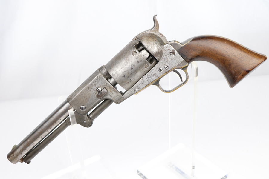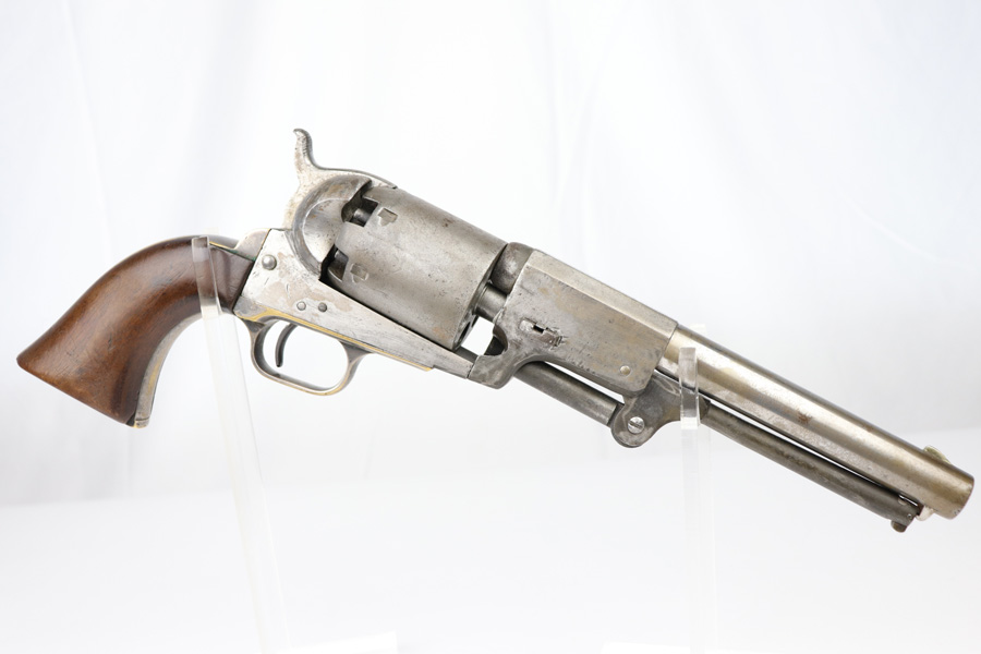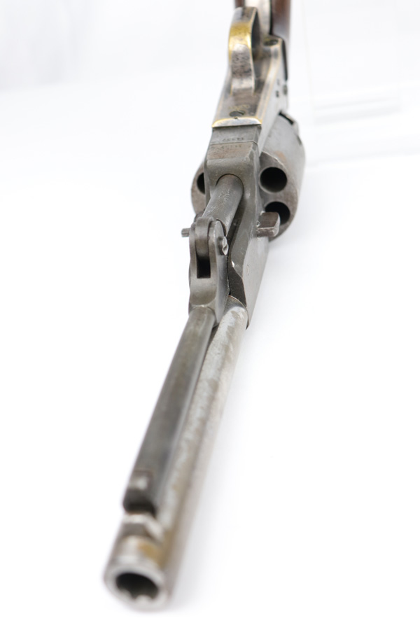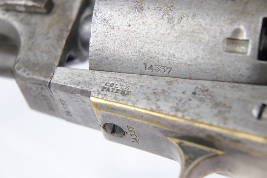 11/6/18 – This is an original Colt Dragoon from the 1850s in all original condition. The pistol has a faint cylinder scene that’s barely visible but the outline are still apparent. The bronze colored finish on the straps and trigger guard is mostly worn off, but there’s still some finish in tact. The frame and barrel have patine and dark spotting throughout, as shown in photos. The revolver is completely matching, including the internal wedge. The mechanics are perfect, with good timing and the revolver seems fully functional. Excellent original wood grips. The bore is surprisingly nice with rifling in tact and dark discoloration / patina throughout. There’s no major rust or pitting in the bore though, which is surprising given this item’s age. A great commercial example Dragoon, guaranteed all matching, original and authentic.