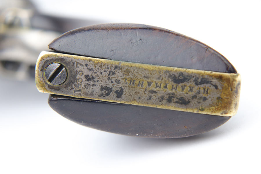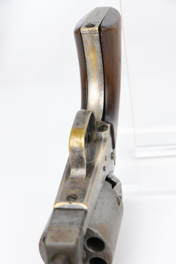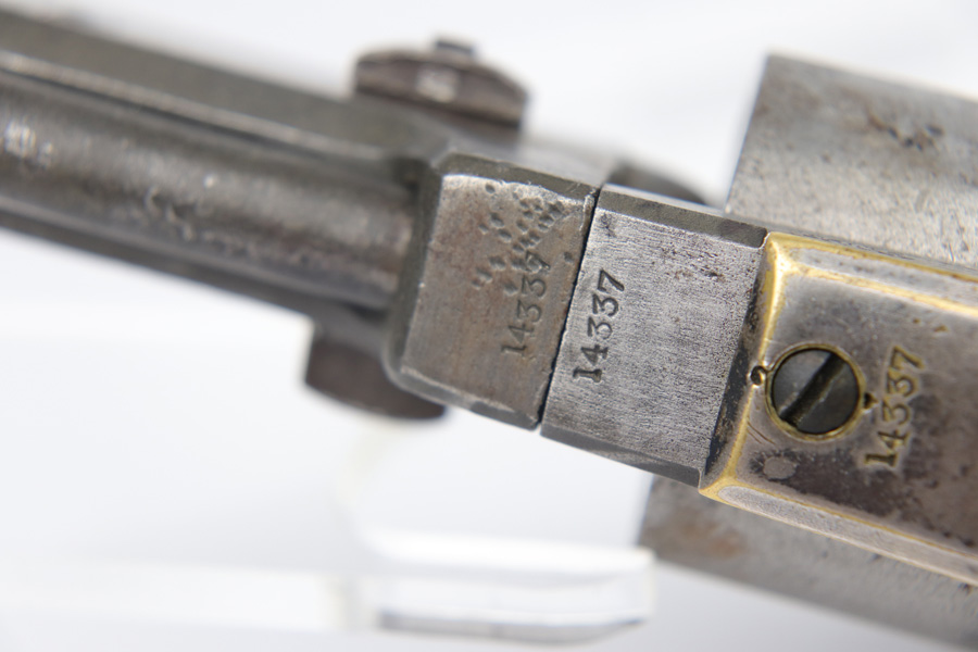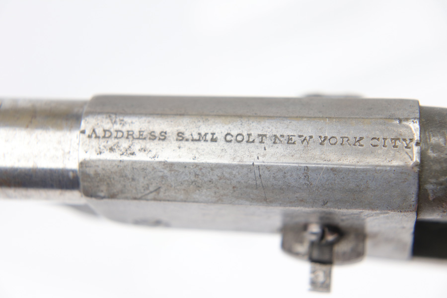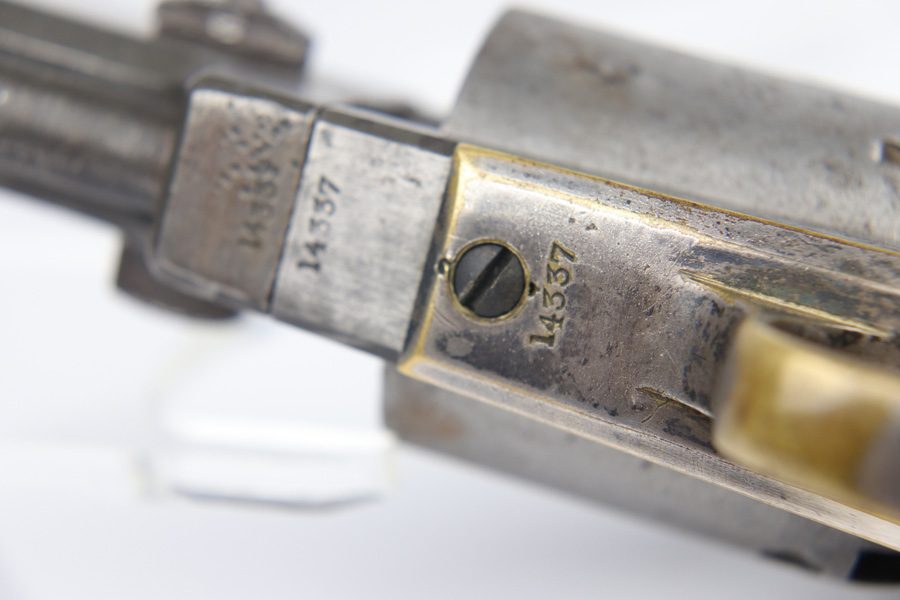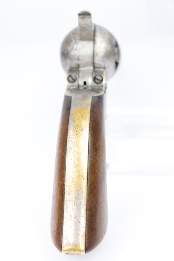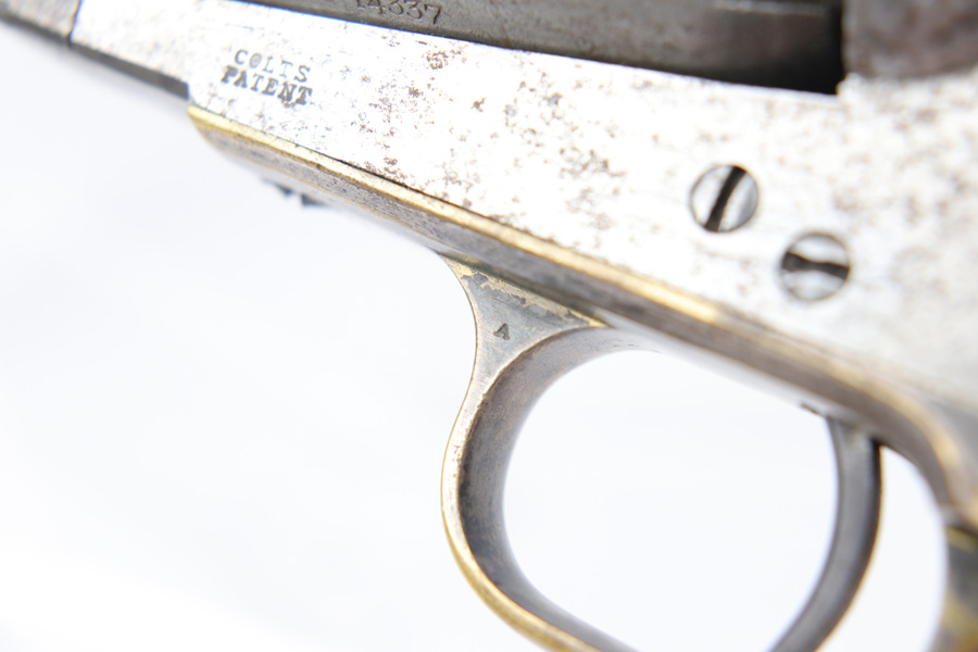 11/6/18 – This is an original Colt Dragoon from the 1850s in all original condition. The pistol has a faint cylinder scene that’s barely visible but the outline are still apparent. The bronze colored finish on the straps and trigger guard is mostly worn off, but there’s still some finish in tact. The frame and barrel have patine and dark spotting throughout, as shown in photos. The revolver is completely matching, including the internal wedge. The mechanics are perfect, with good timing and the revolver seems fully functional. Excellent original wood grips. The bore is surprisingly nice with rifling in tact and dark discoloration / patina throughout. There’s no major rust or pitting in the bore though, which is surprising given this item’s age. A great commercial example Dragoon, guaranteed all matching, original and authentic.