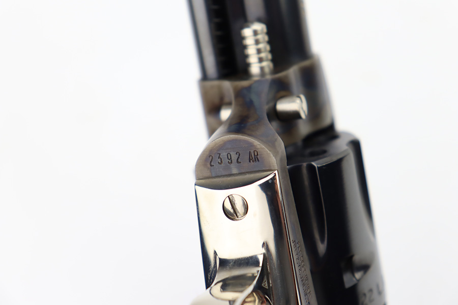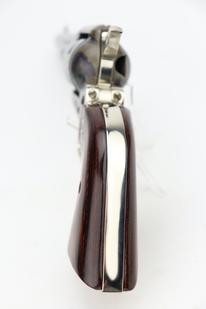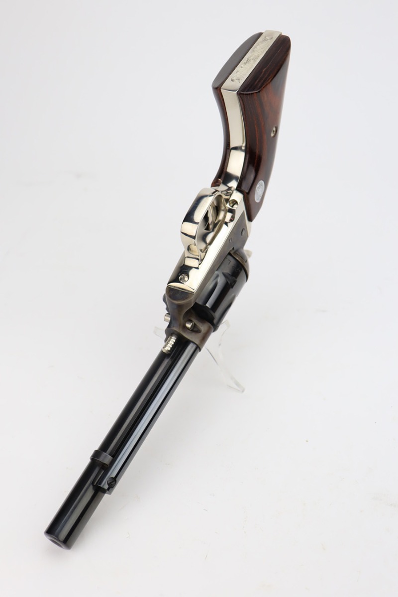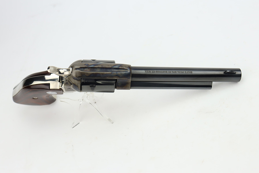 11/29/23 – This is a mint Colt Frontier Scout revolver that was made as an Arizona Ranger commemorative. It appears to be in unfired condition with no turn line on the cylinder and a mint bore. 5.5in barrel. Beautiful wood grips and nice case hardening on frame. Comes with the original glass display case.