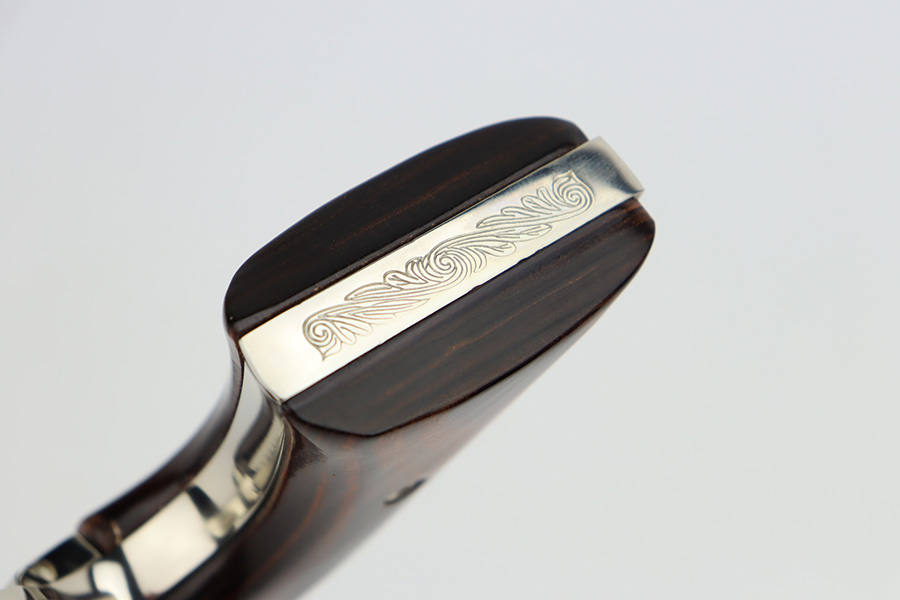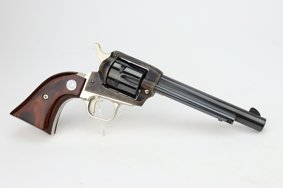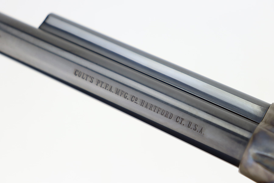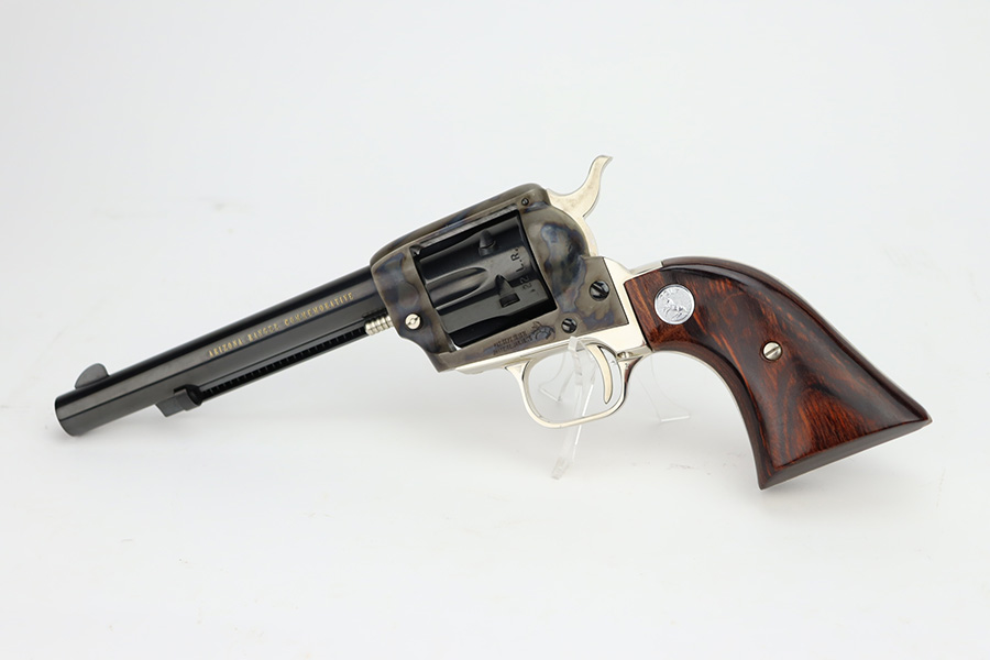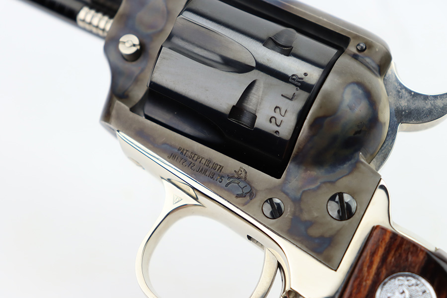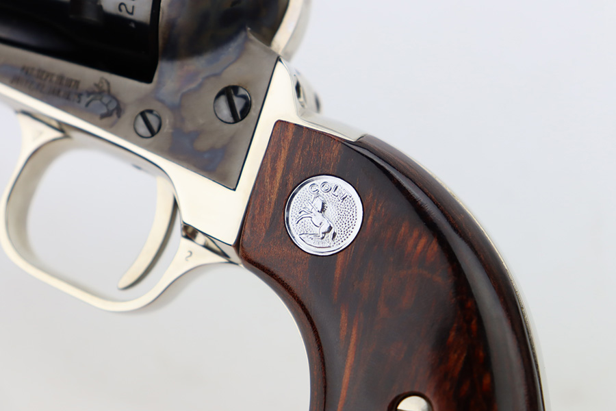 11/29/23 – This is a mint Colt Frontier Scout revolver that was made as an Arizona Ranger commemorative. It appears to be in unfired condition with no turn line on the cylinder and a mint bore. 5.5in barrel. Beautiful wood grips and nice case hardening on frame. Comes with the original glass display case.