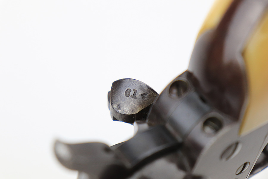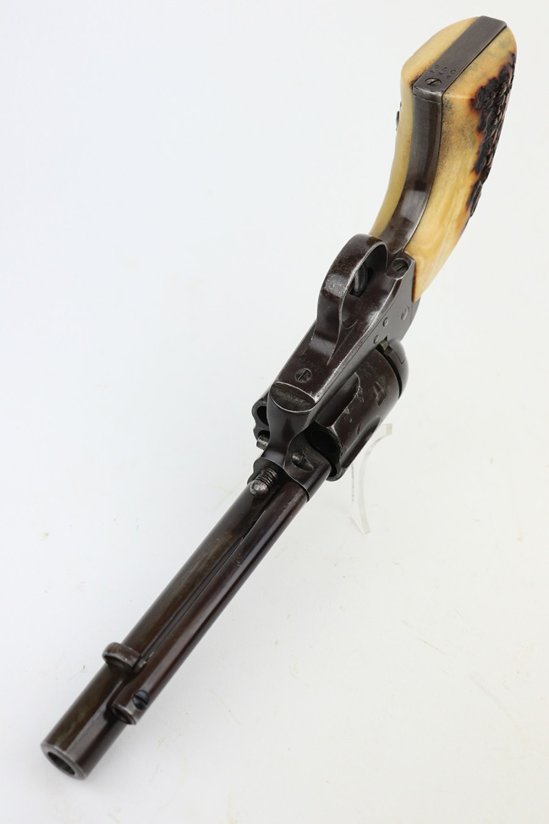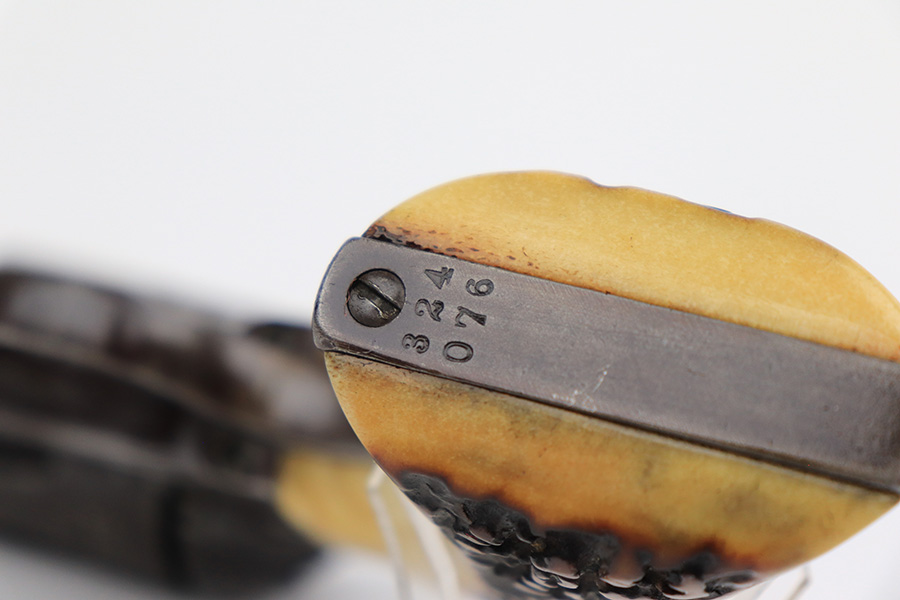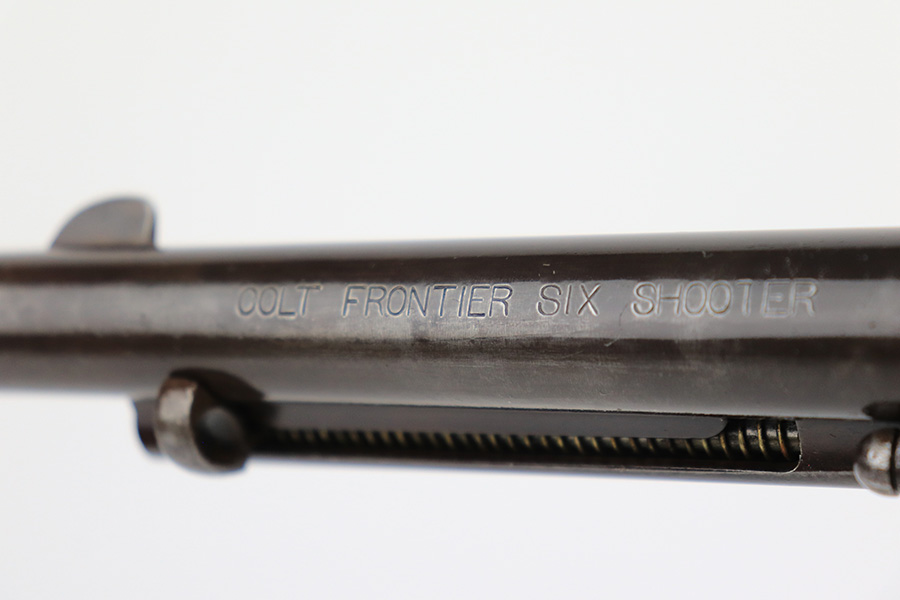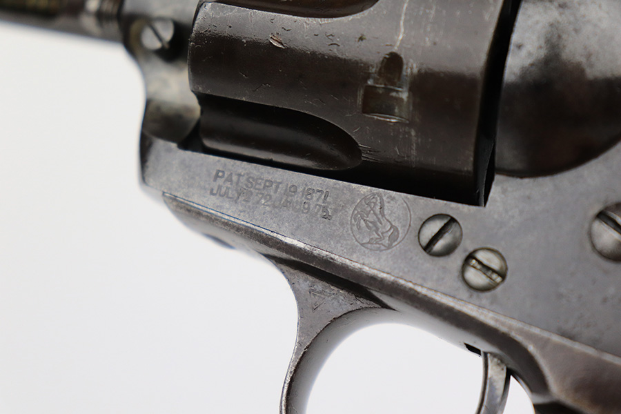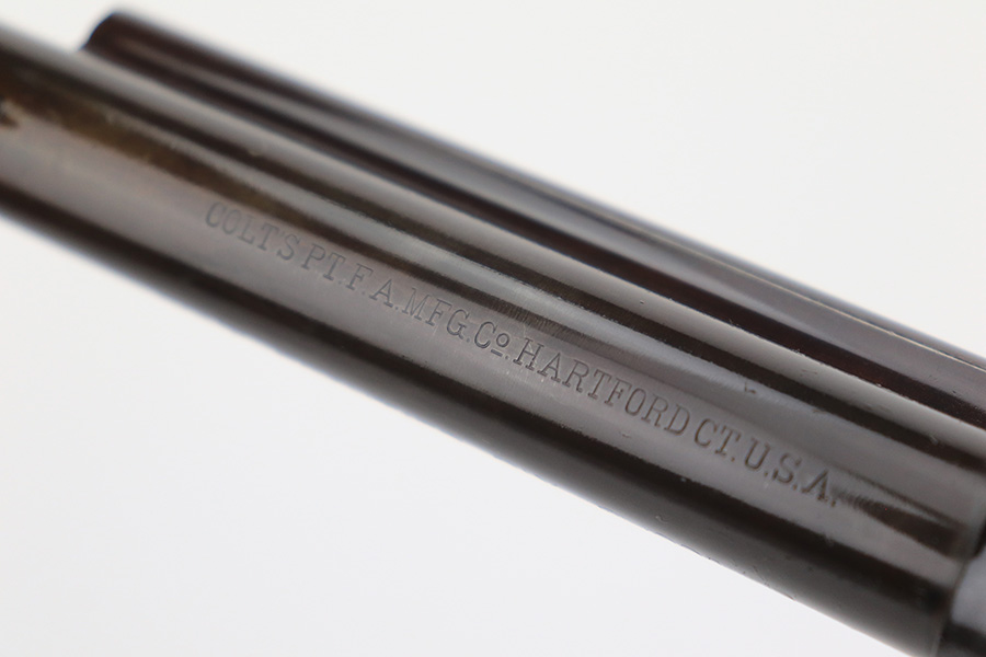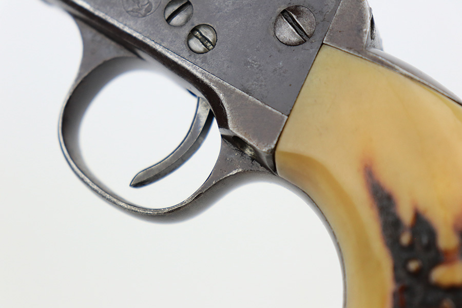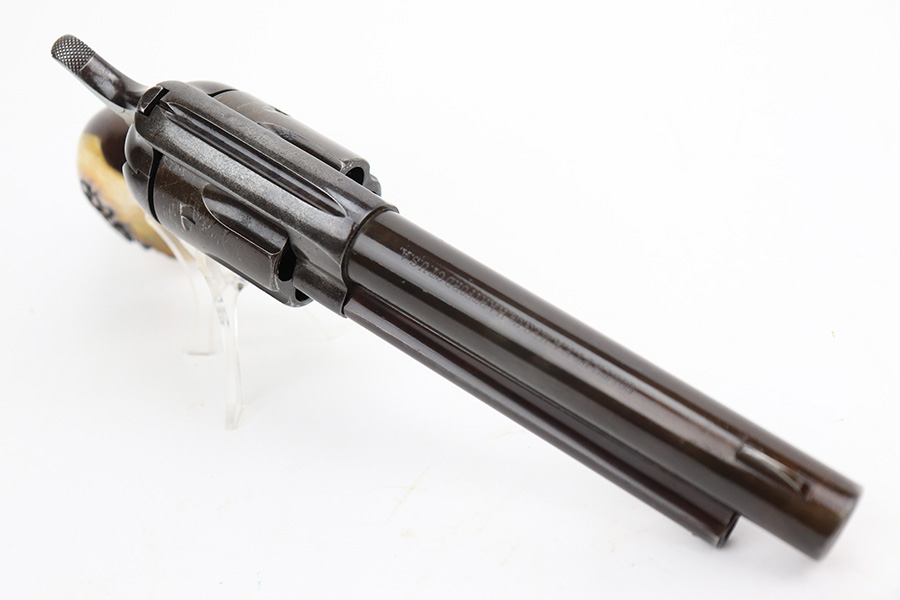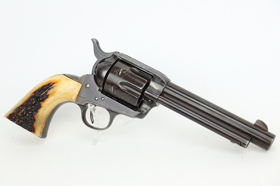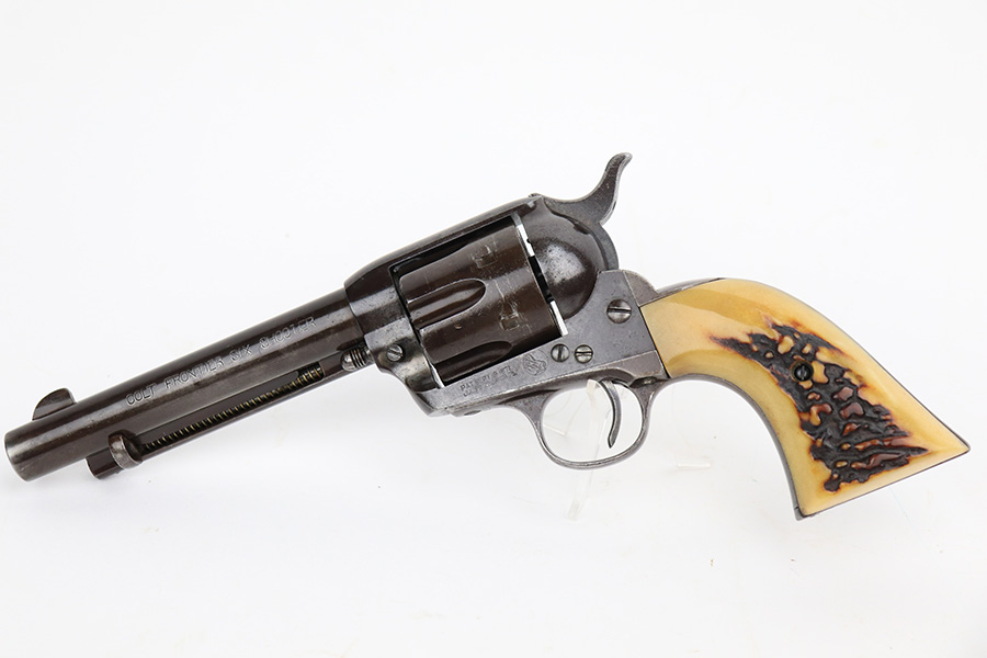 6/12/23 – This is a nice example of a Colt Frontier Six Shooter revolver, manufactured in 1912 and chambered in .45 Colt. It is all matching and has retained roughly 80% of its original finish. While it has retained the majority of its finish, there is obvious brown patina covering almost the whole gun and spotty oxidation throughout. Areas of pin-pricking on the frame. Some small dings in the metal on the cylinder. Fitted with a really nice set of stag antler grips. The bore is shiny with strong rifling. The cylinder is tight, and the action is smooth.