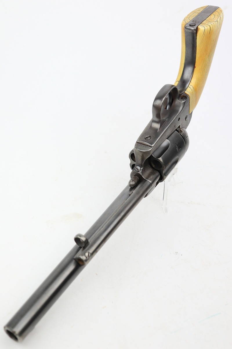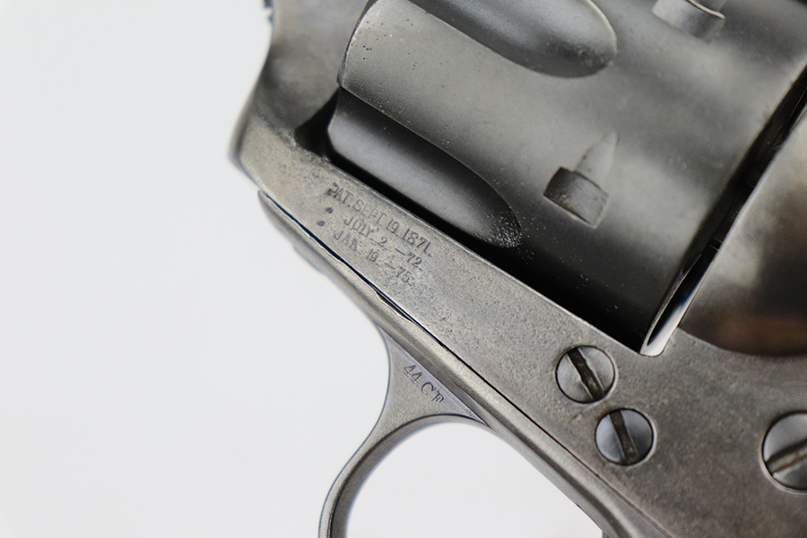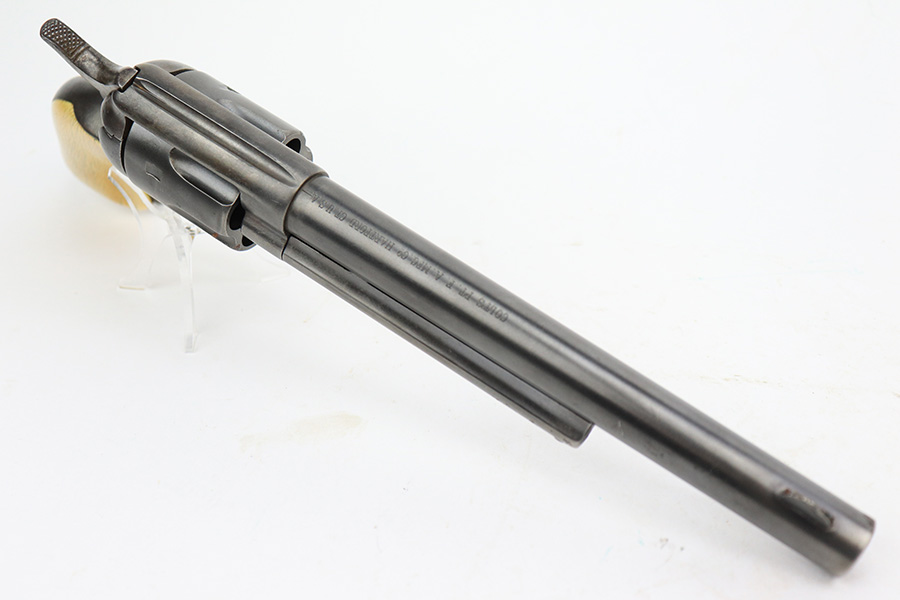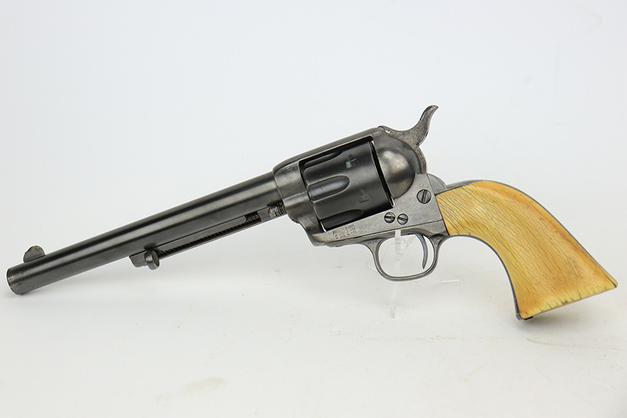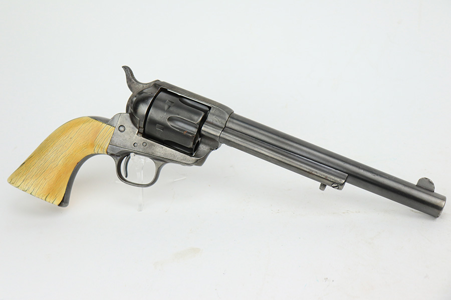 6/13/23 – This is a nice example of a Colt Frontier Six Shooter, manufactured in 1881 and chambered in .44 Caliber. Replaced 7.5″ barrel. The rest of the gun is matching. We believe the gun has been refinished, and it has retained roughly 70% of its bluing. There is fairly even thinning throughout and pin-pricking covering most of the gun. Spotty oxidation on the hammer. Fitted with very nice ivory grips. Excellent bore with strong rifling. The cylinder is tight, and the action is smooth.