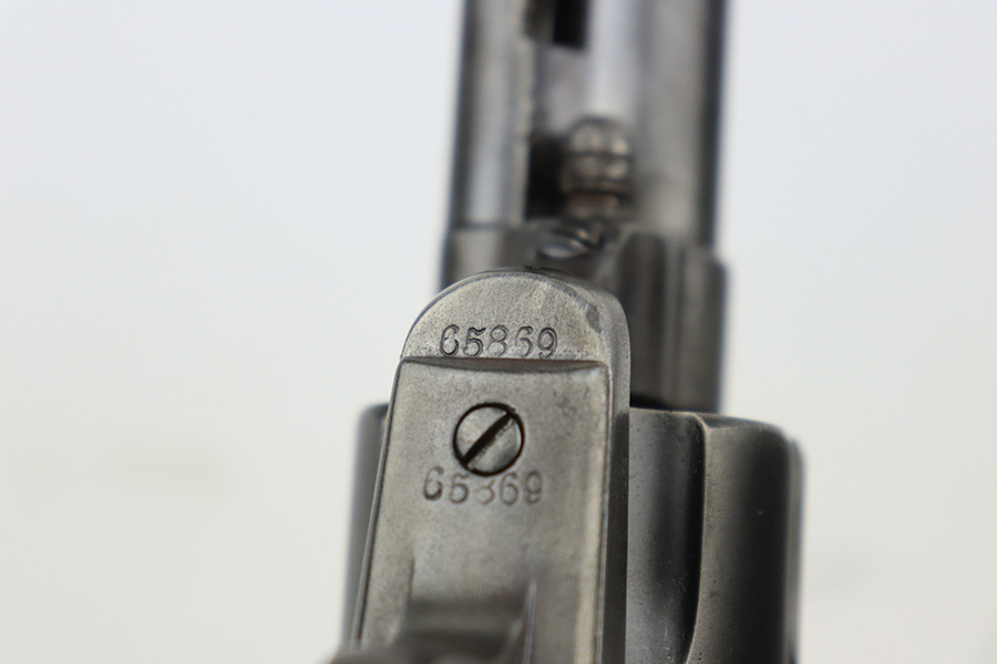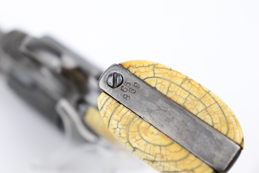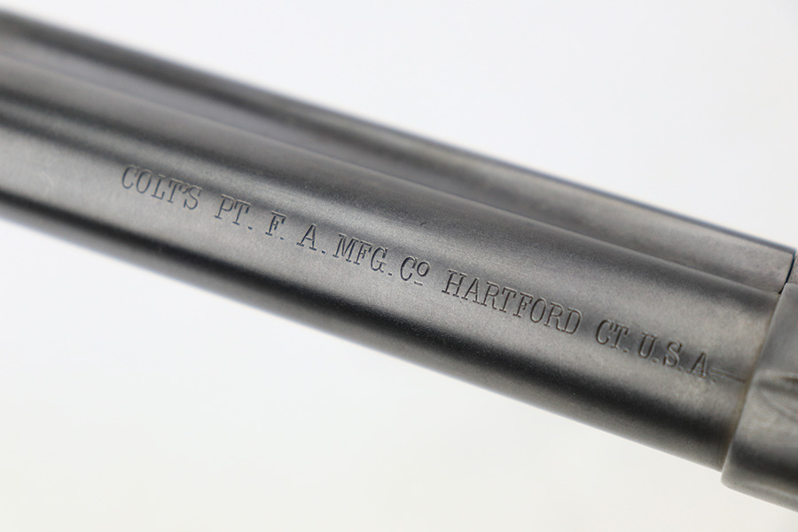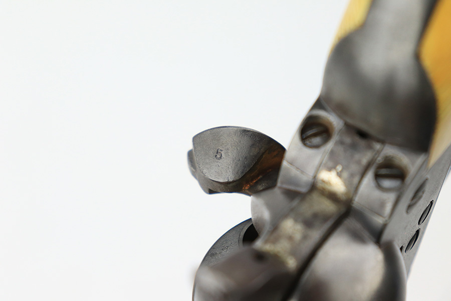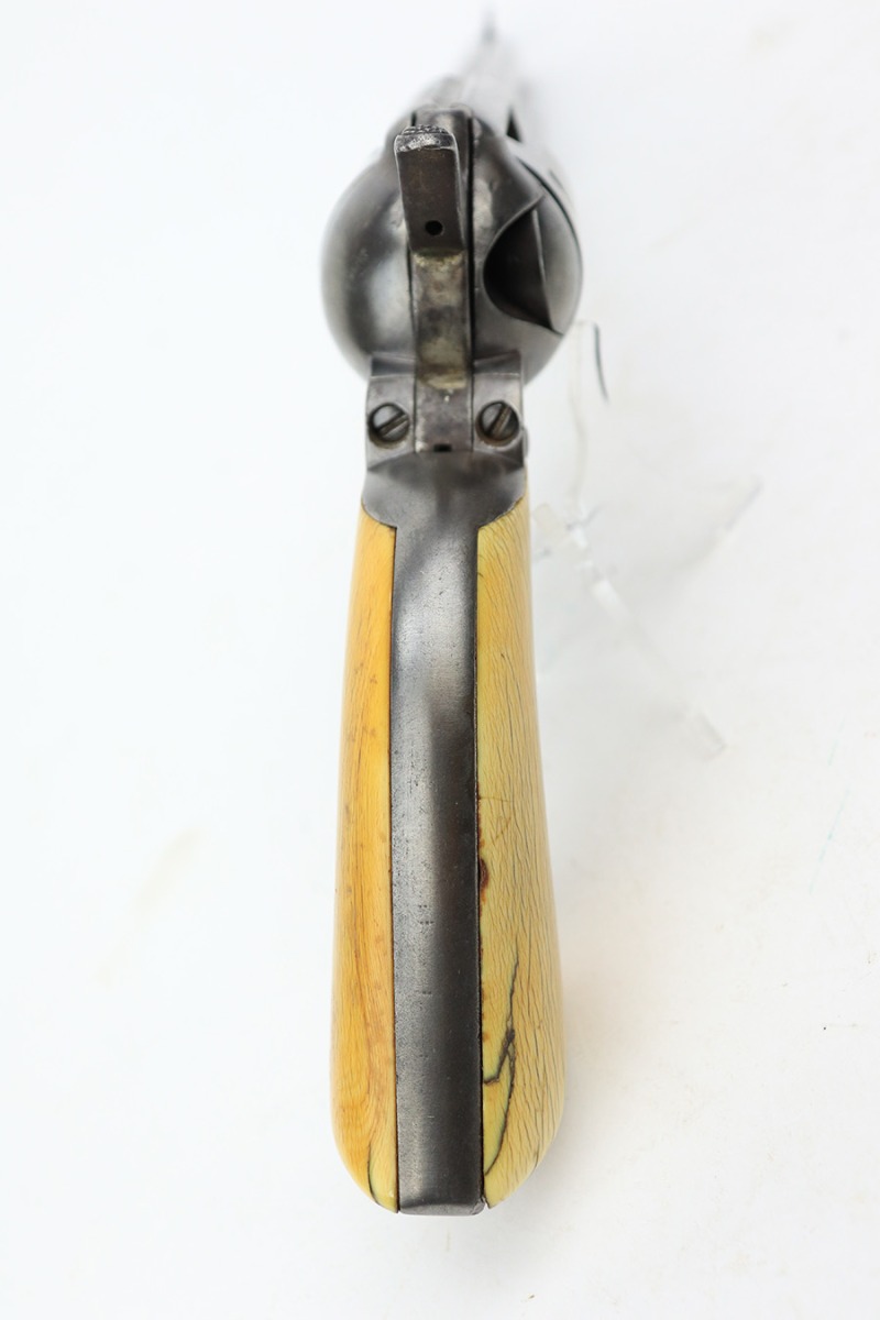6/13/23 – This is a nice example of a Colt Frontier Six Shooter, manufactured in 1881 and chambered in .44 Caliber. Replaced 7.5″ barrel. The rest of the gun is matching. We believe the gun has been refinished, and it has retained roughly 70% of its bluing. There is fairly even thinning throughout and pin-pricking covering most of the gun. Spotty oxidation on the hammer. Fitted with very nice ivory grips. Excellent bore with strong rifling. The cylinder is tight, and the action is smooth.