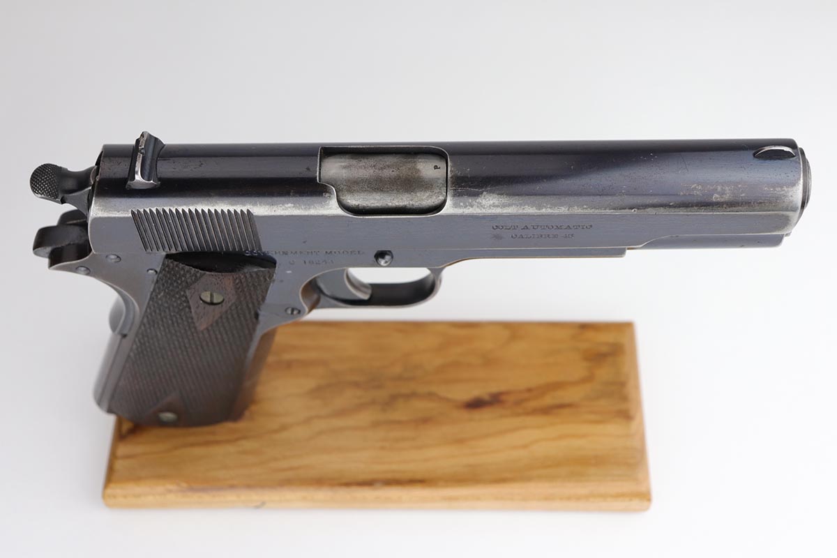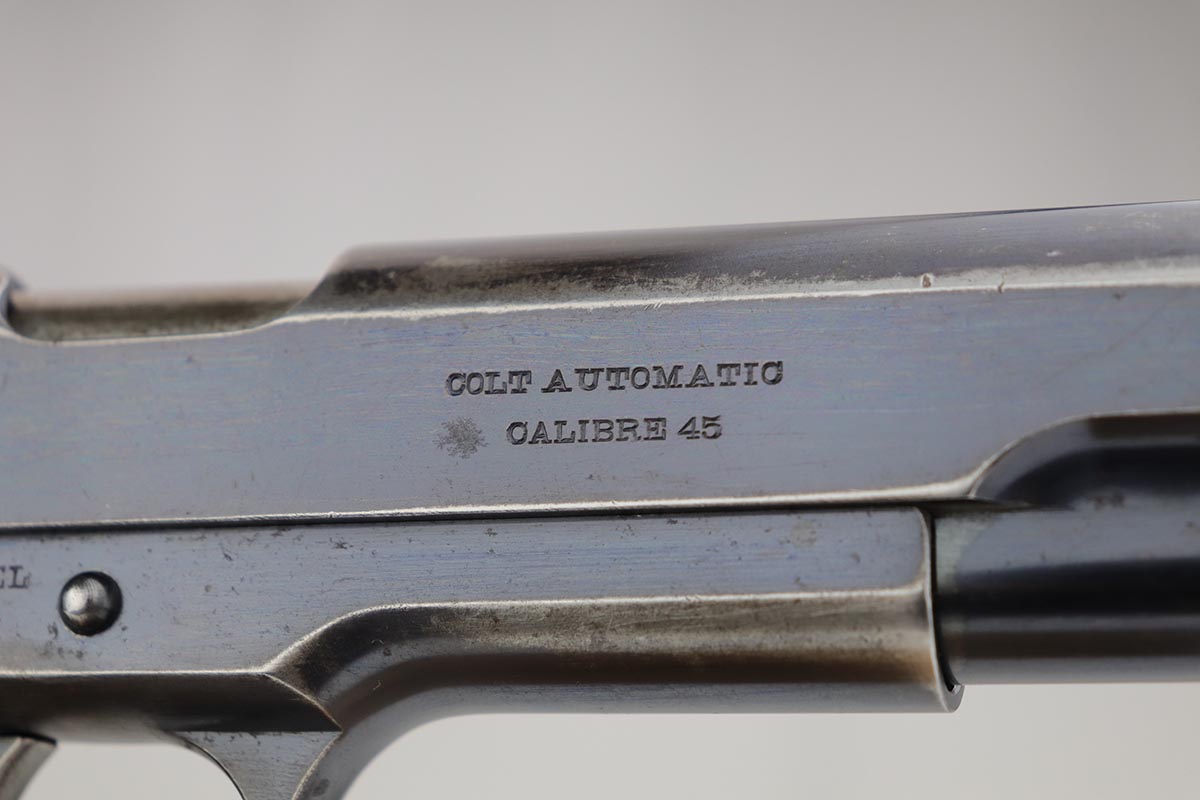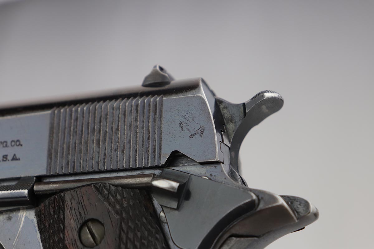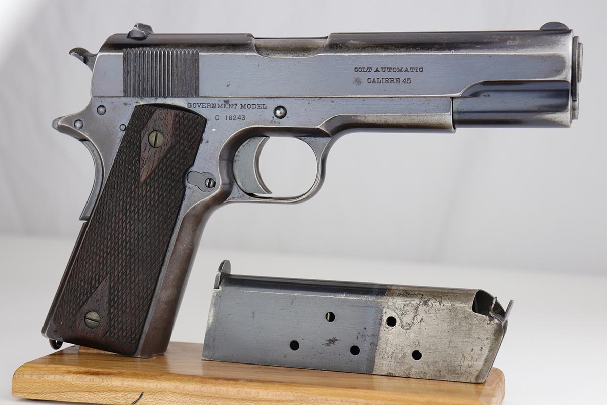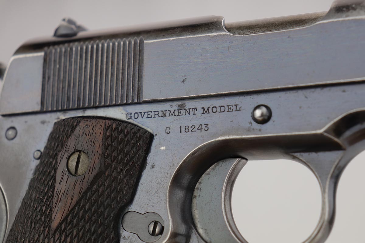 8/21/19 – This is a scarce Government Model Colt 1911 from 1915, when only about 8,000-9,000 were produced. The pistol is all original and correct with about 70% of the Colt brushed blue remaining. It has a nice enough slide, but the bluing on the straps is worn thin. Nice grips with no major defects. Two-tone magazine. Excellent bore with minor signs of use. P proof on barrel is visible via ejection port.