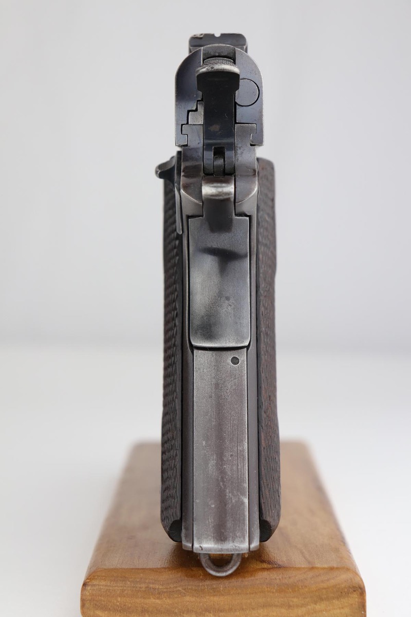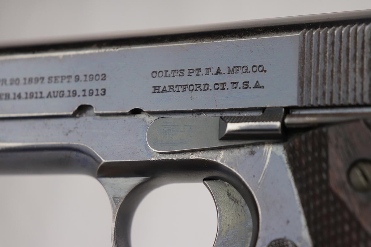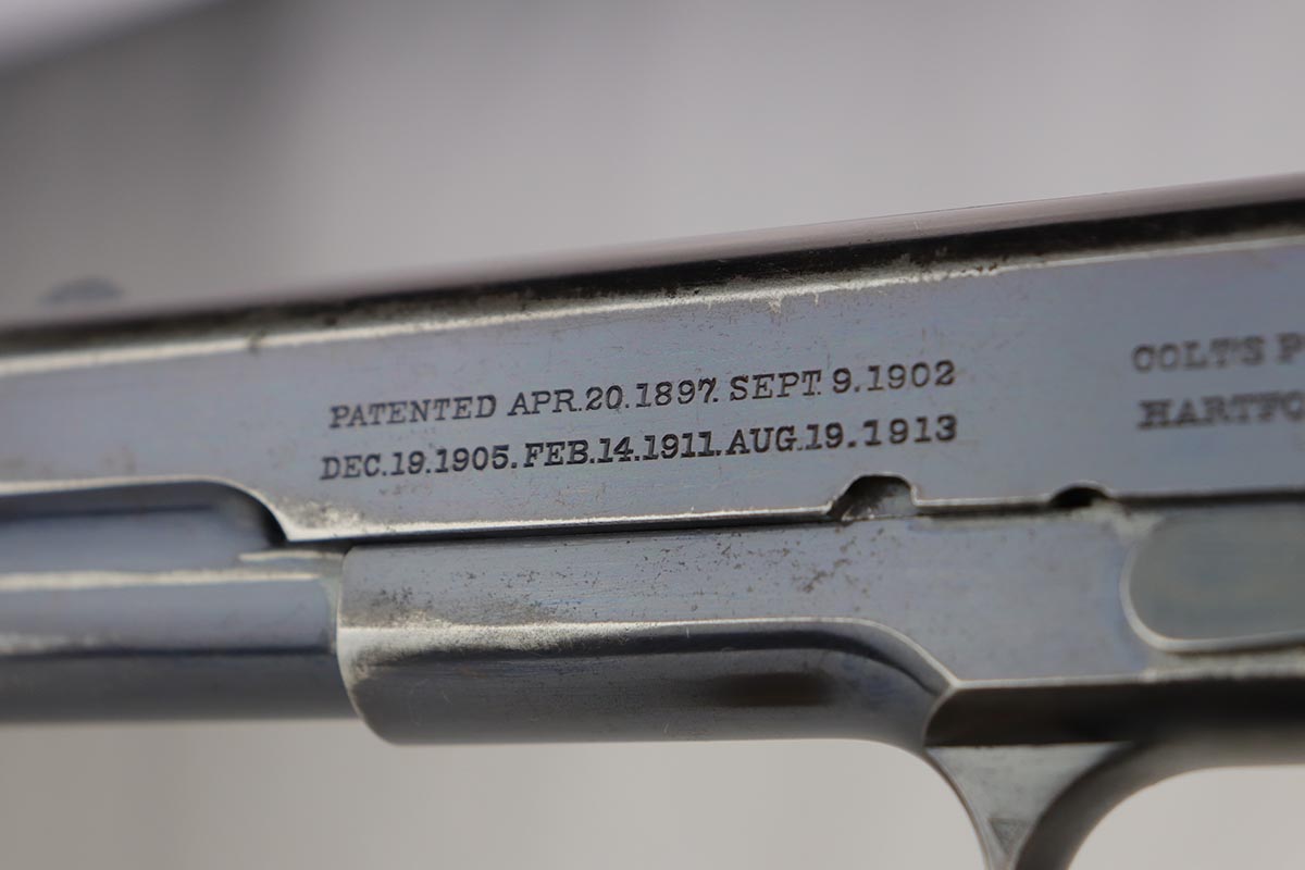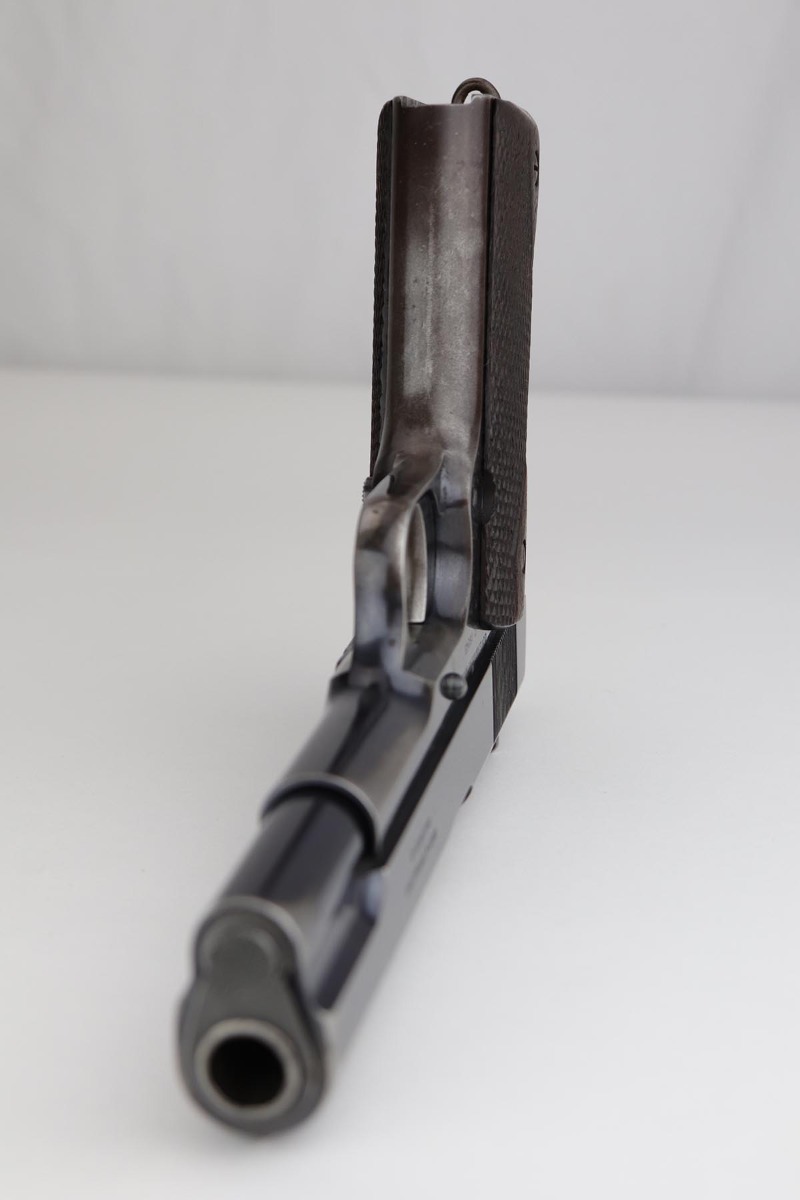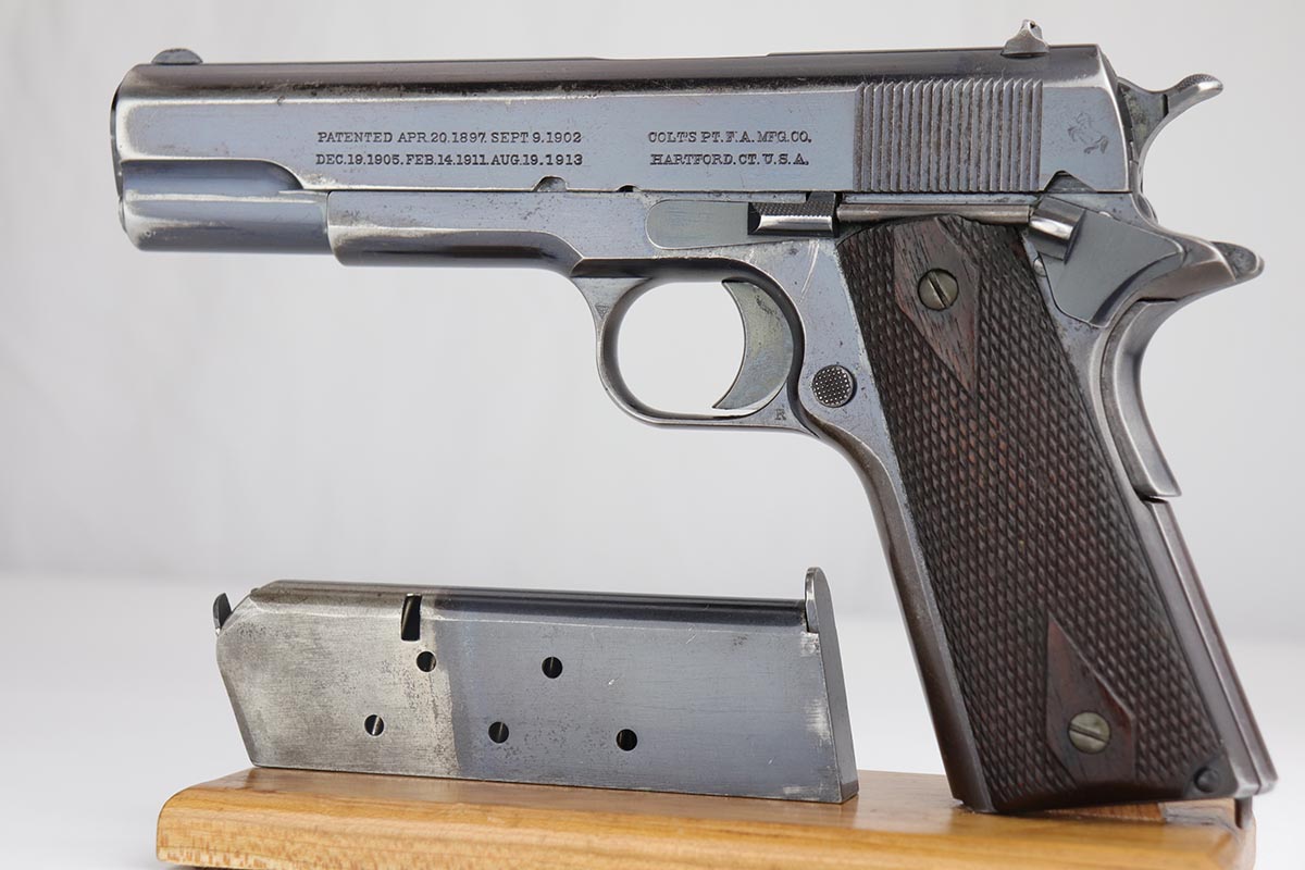 8/21/19 – This is a scarce Government Model Colt 1911 from 1915, when only about 8,000-9,000 were produced. The pistol is all original and correct with about 70% of the Colt brushed blue remaining. It has a nice enough slide, but the bluing on the straps is worn thin. Nice grips with no major defects. Two-tone magazine. Excellent bore with minor signs of use. P proof on barrel is visible via ejection port.
