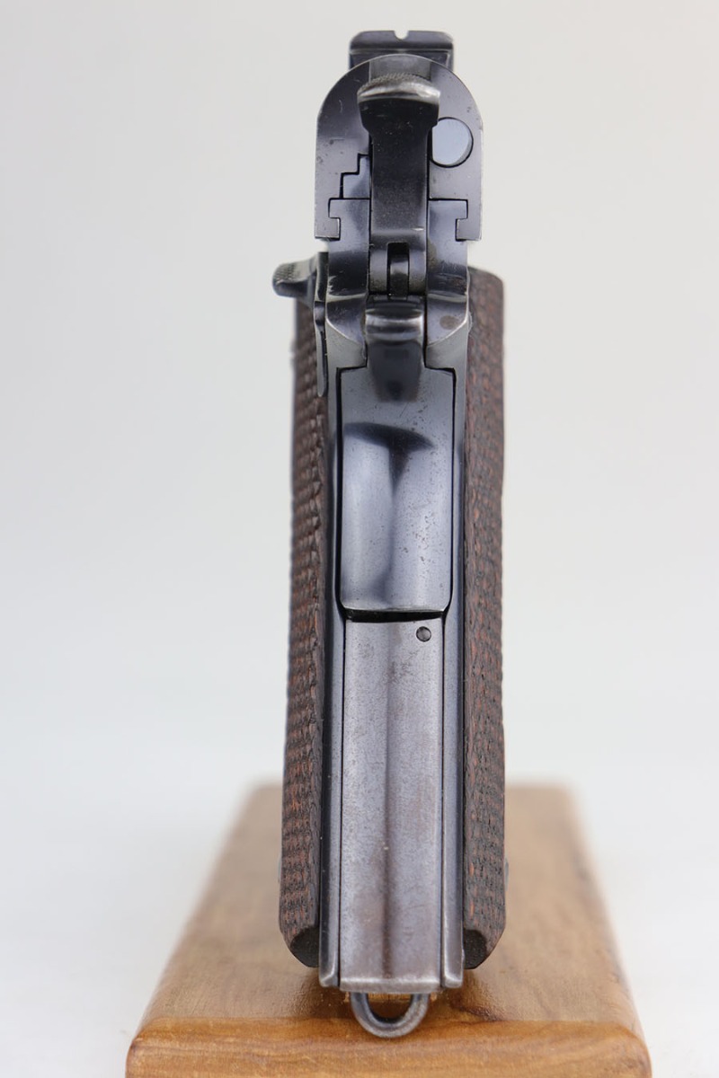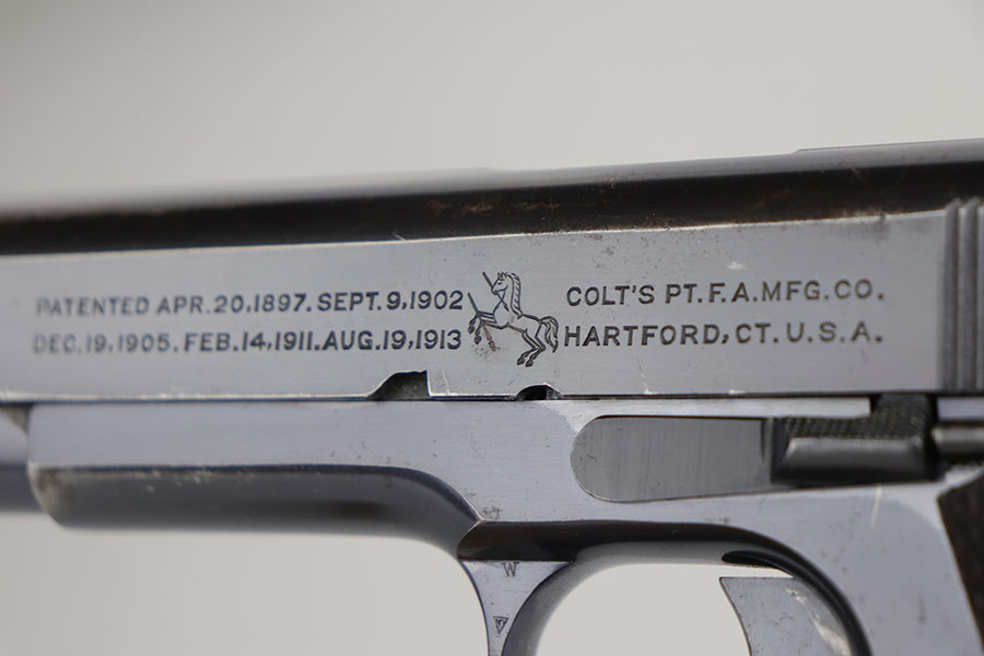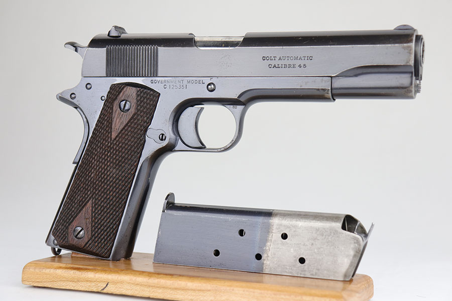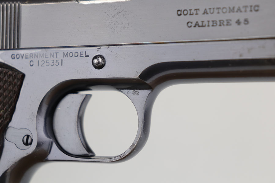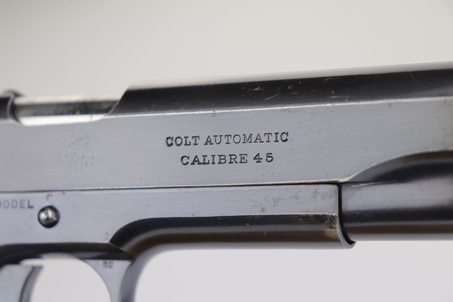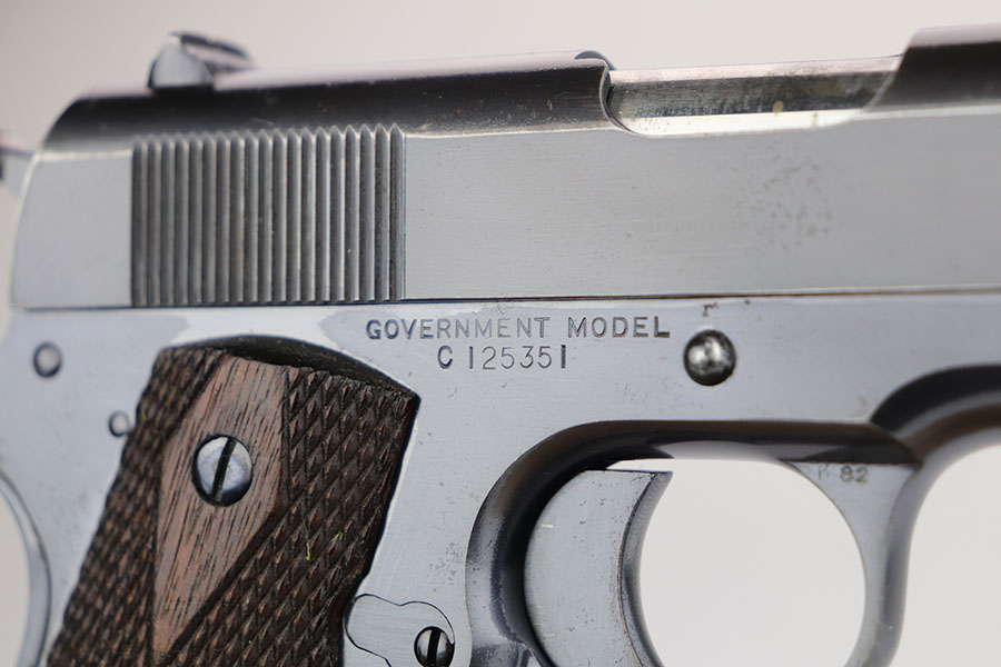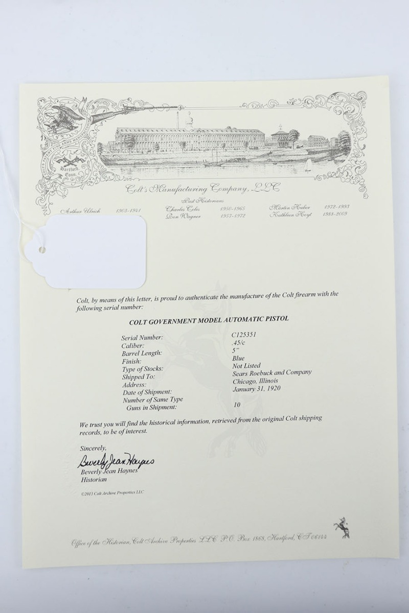 3/27/20 – This is a very nice example of an original Colt Government Model 1911 from 1920. It comes with a Colt factory letter that states it shipped in January of 1920 to Sears Roebuck in Chicago. It has about 92-94% of the original blue with high point wear on the top and underside of the slide, front edge of the frame and bottom of the back strap. Also some surface freckling along the top of the slide and right side of muzzle. Terrific grips and excellent two-tone magazine. Bore is shiny with strong rifling but a little bit of frost.