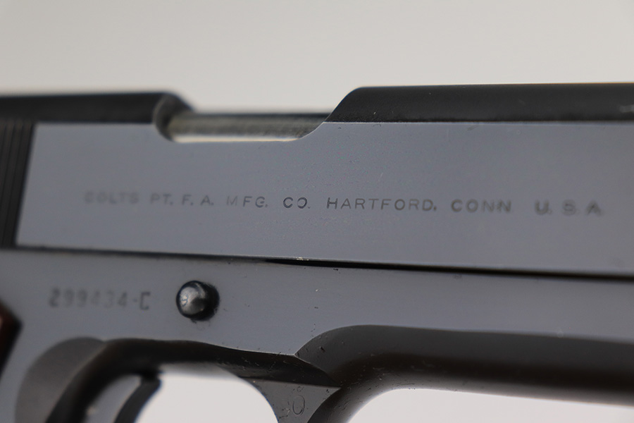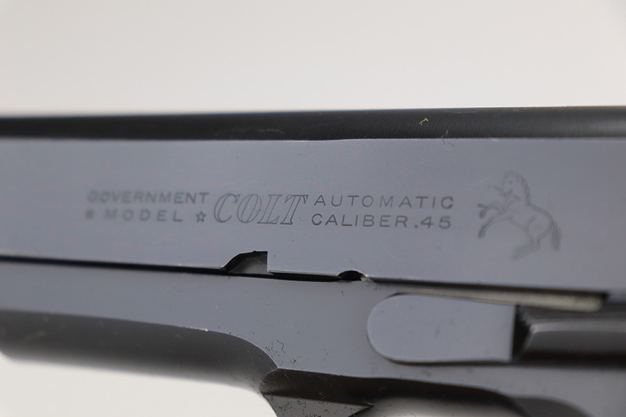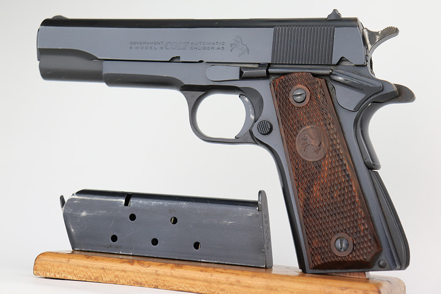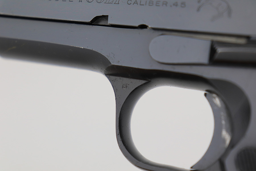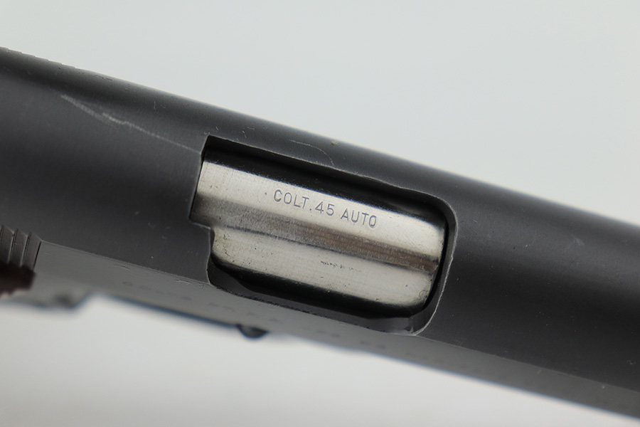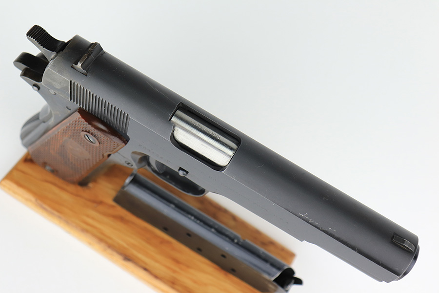 1/18/23 – This is a Colt Government Model 1911 from 1965. The gun would be in near-mint condition but it appears at some point in its life, a liquid got on the rear of the slide and caused some pitting/wear. The grips and bore are minty, so it doesn’t seem like it’s been handled much, and there’s nearly zero finish loss aside from the described area. C&R eligible. Original mag marked ‘COLT .45 AUTO’.