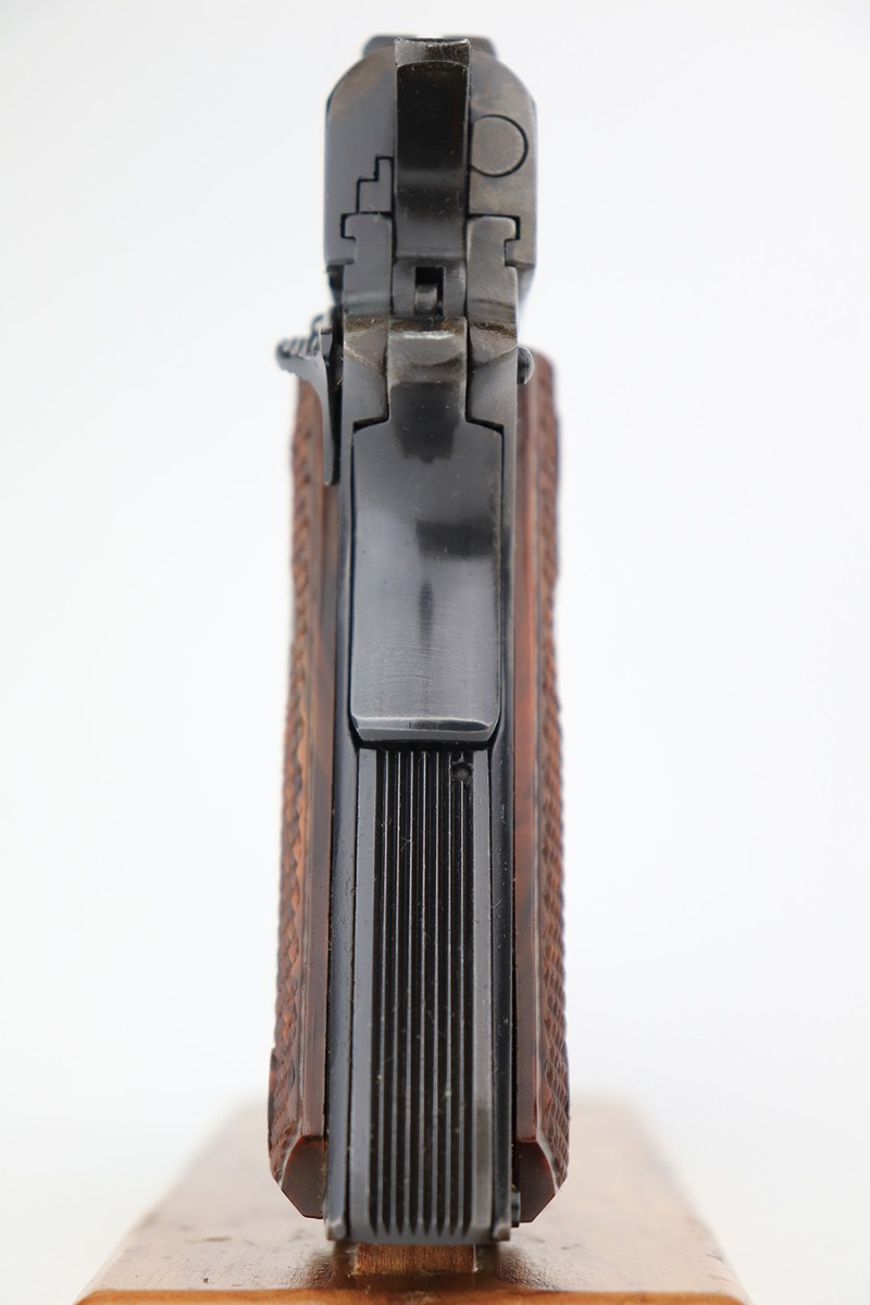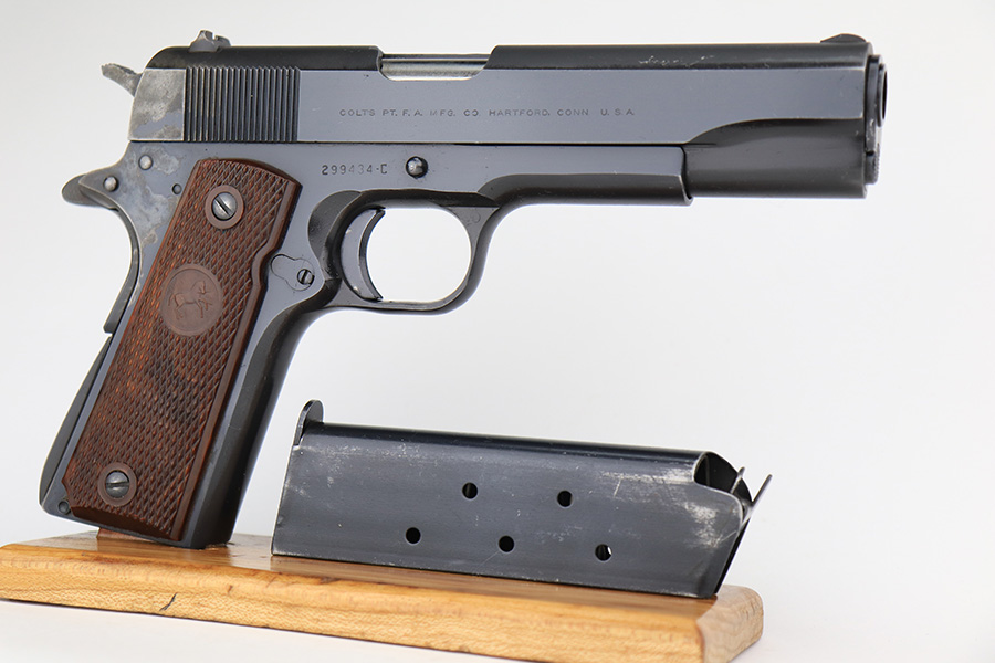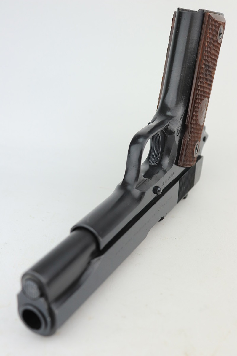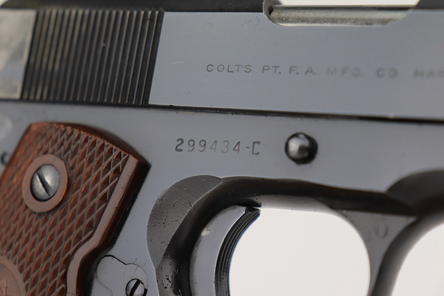 1/18/23 – This is a Colt Government Model 1911 from 1965. The gun would be in near-mint condition but it appears at some point in its life, a liquid got on the rear of the slide and caused some pitting/wear. The grips and bore are minty, so it doesn’t seem like it’s been handled much, and there’s nearly zero finish loss aside from the described area. C&R eligible. Original mag marked ‘COLT .45 AUTO’.
