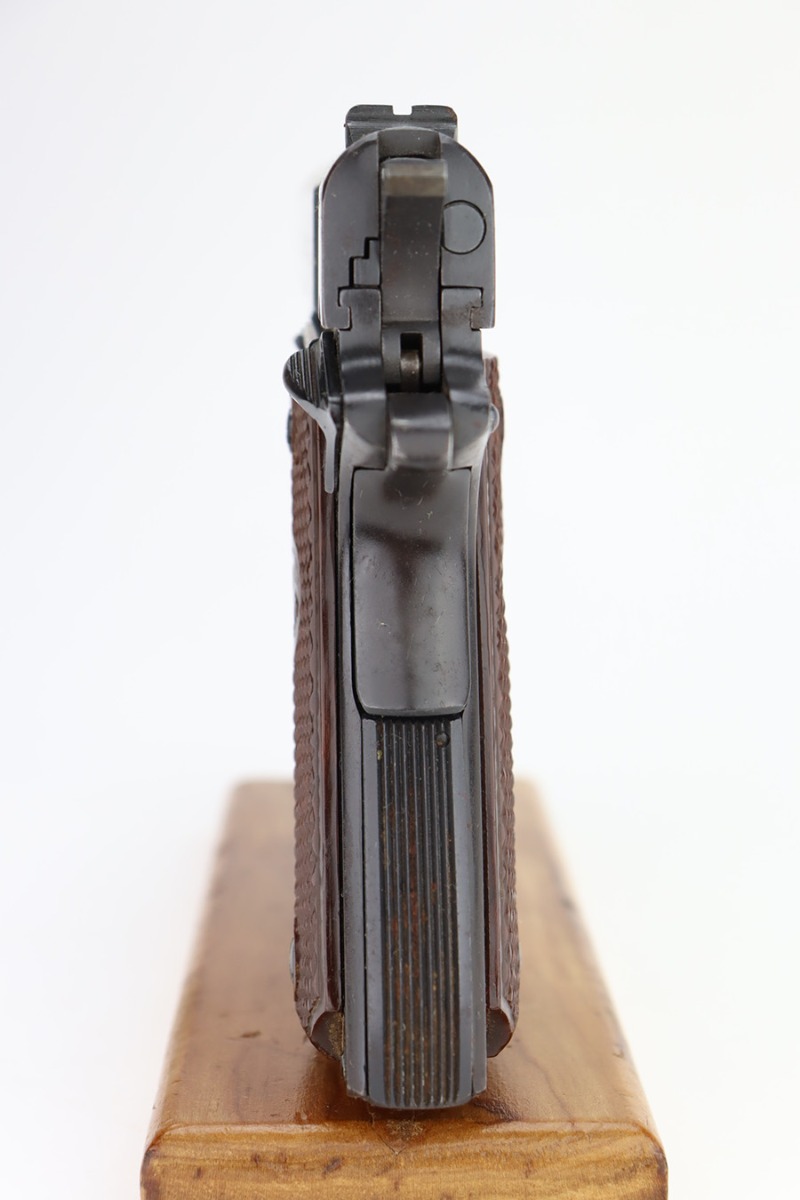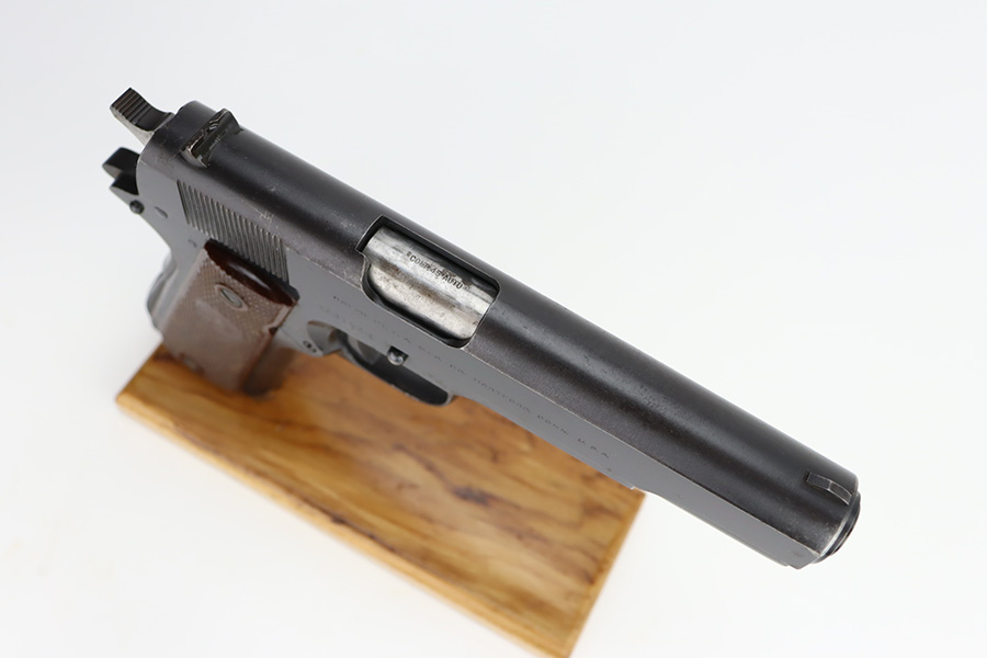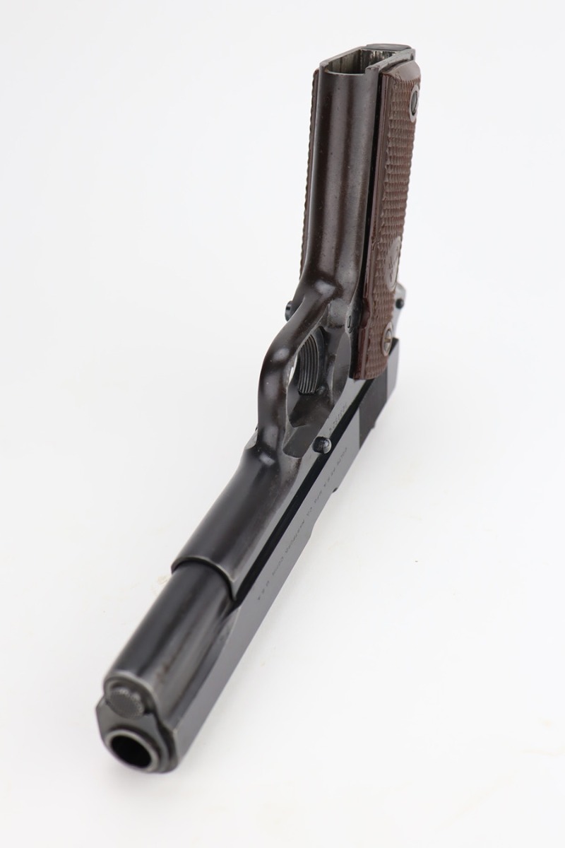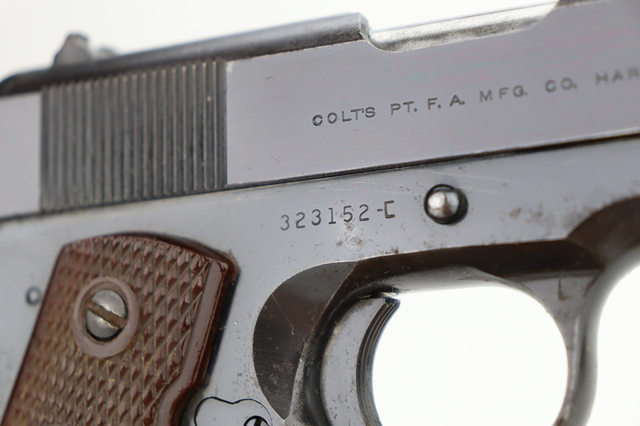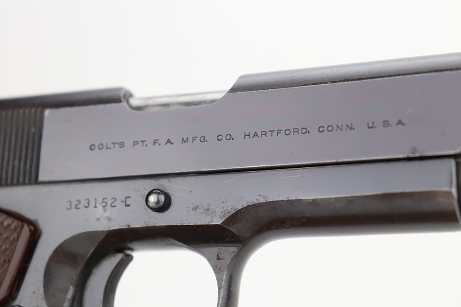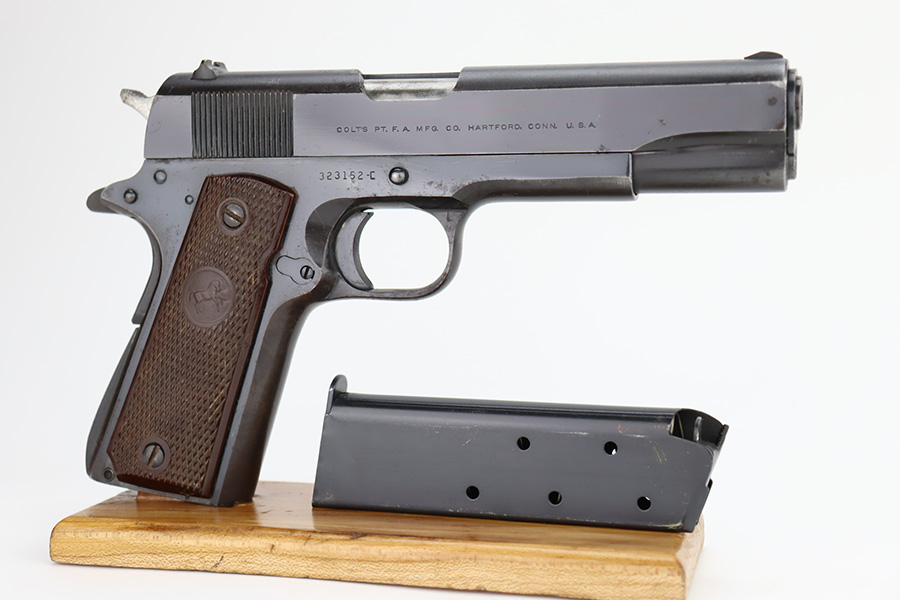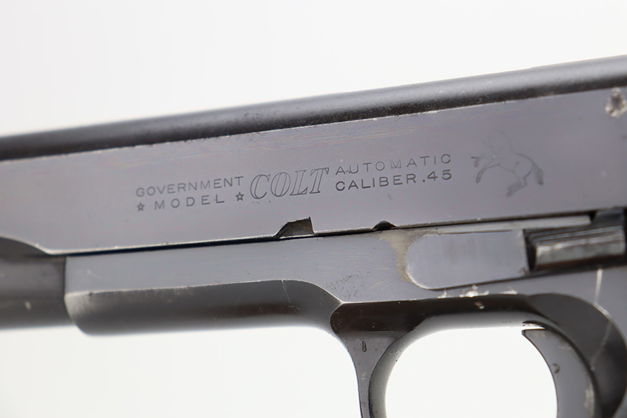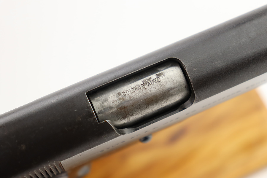 11/30/23 – This is a nice Colt Government Model 1911 that was manufactured in 1968. All original with around 95% of the polished Colt blue remaining. Minor high edge wear around the muzzle and on the front edges of the frame. There’s also a spot of pitting on the left side of the slide, and some general oxidation on the right side of the pistol. Excellent bore. Original grips show some dings and handling wear.