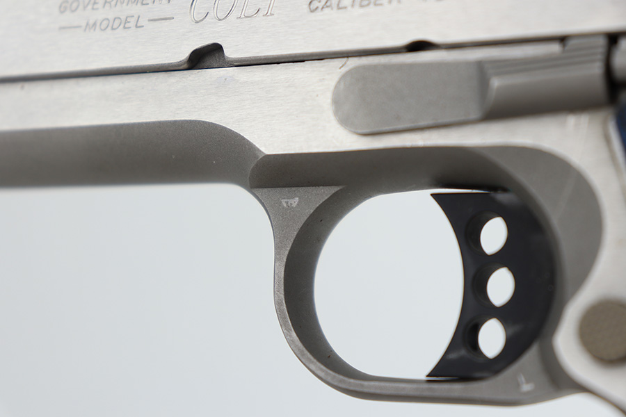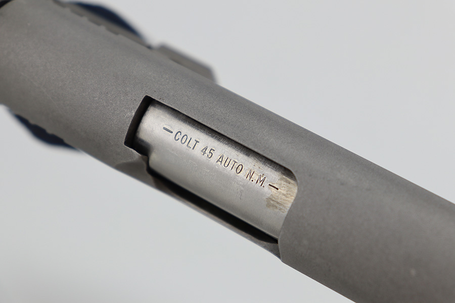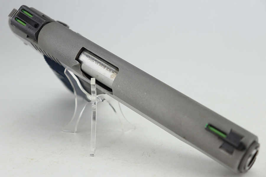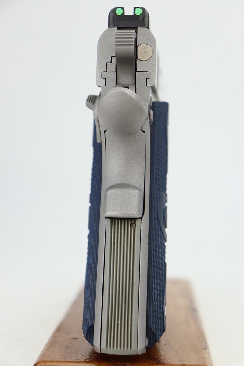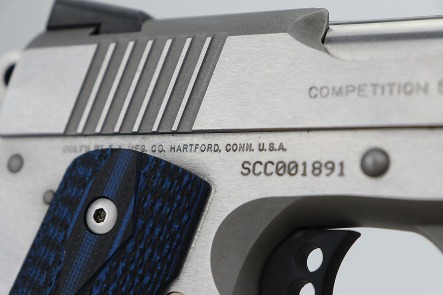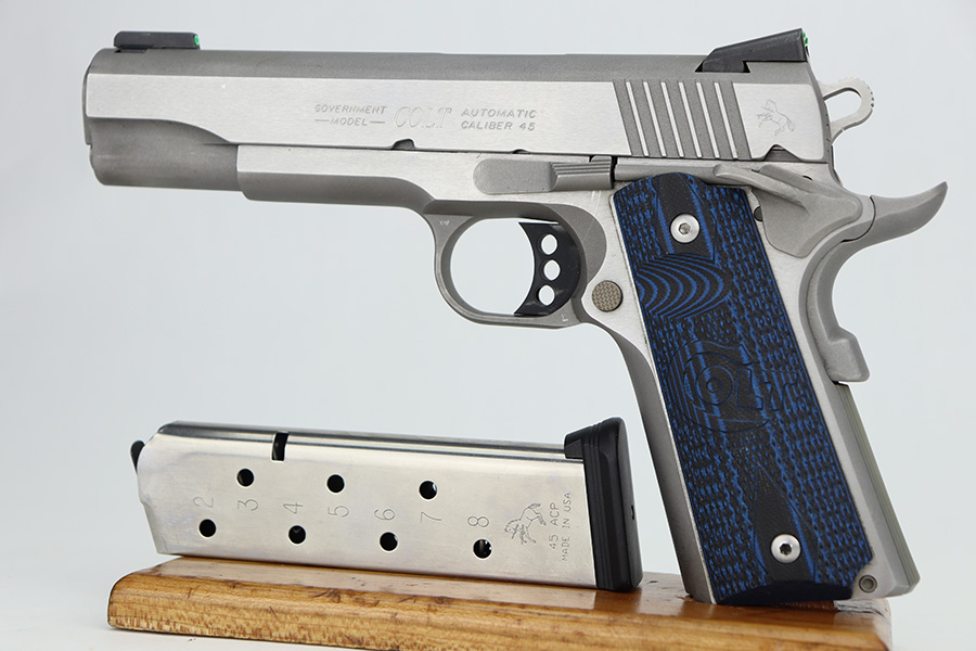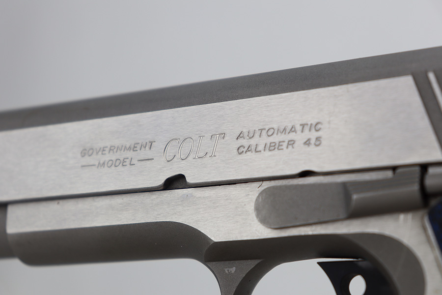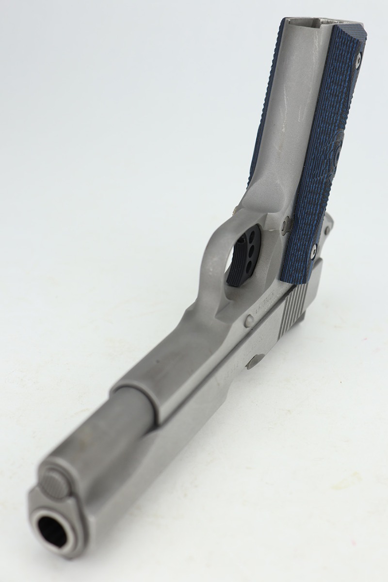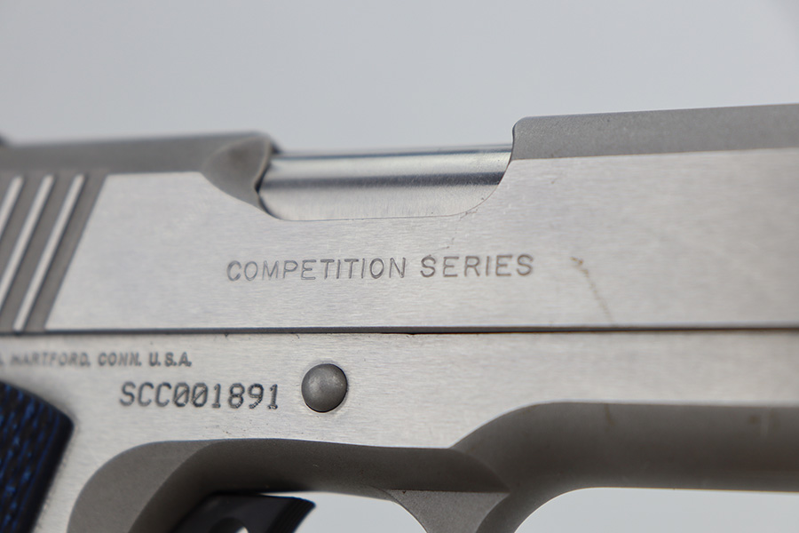 12/27/23 – This is an excellent Colt Government Model 1911 Competition Series, chambered in .45 ACP. It has a really nice stainless finish and is in excellent condition overall. There are just some very light surface scratches here and there. Fitted with blue/black Colt grips and comes with one proper magazine. Minty bore.