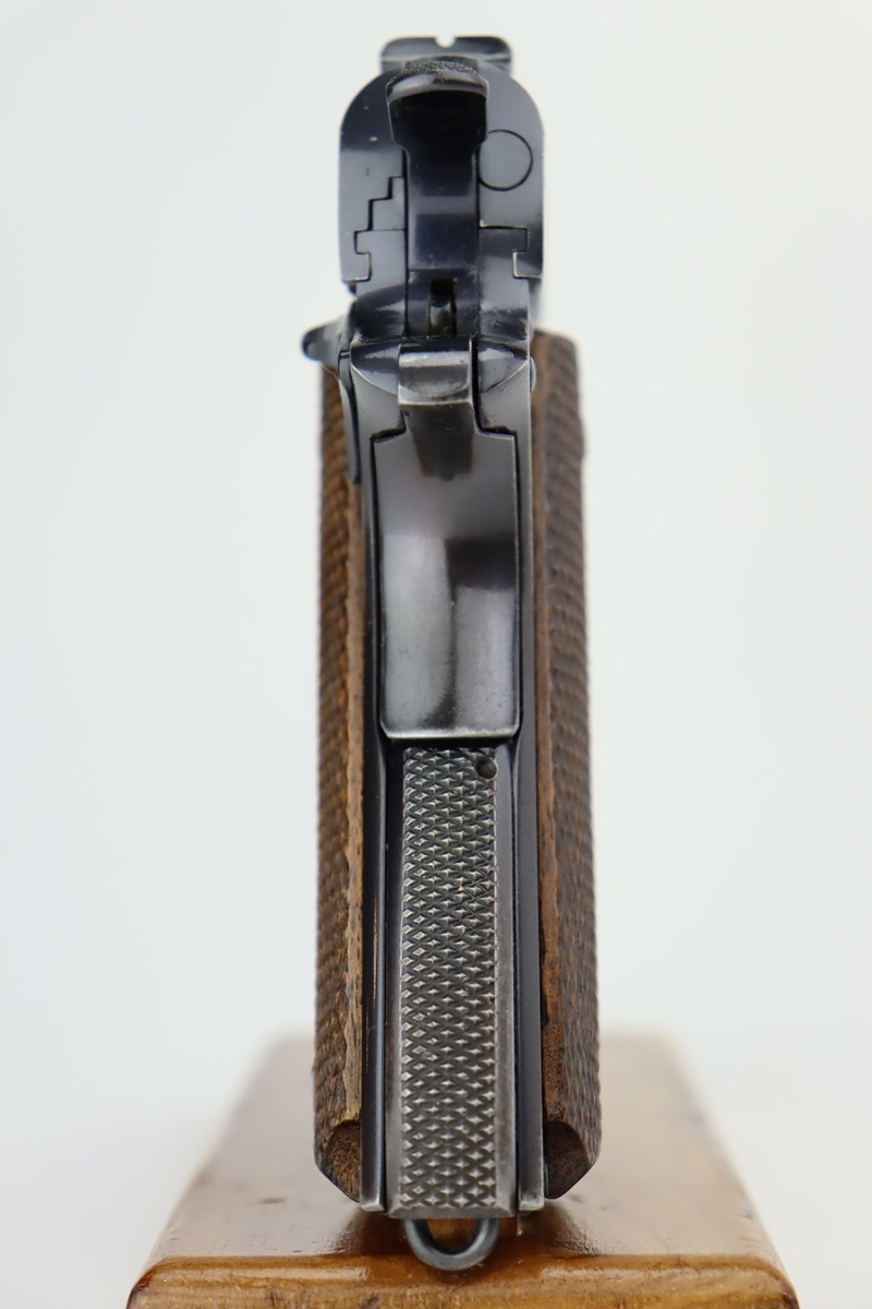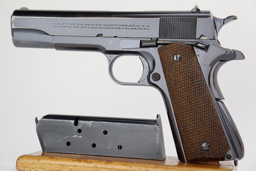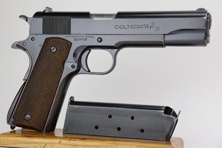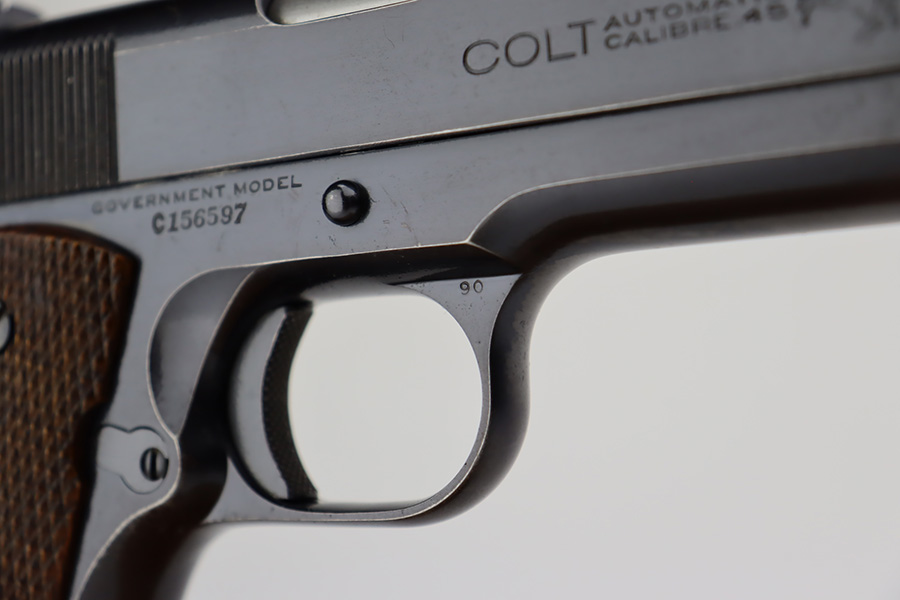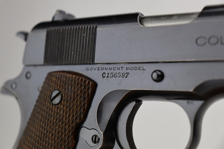 9/6/23 – This is a commercial Colt Government Model 1911A1 from 1929. It has a nice profile but the majority of the finish loss is on the front strap. Original blue rates around 85%. Proper, polished commercial Colt barrel. Slide is serialized to the frame. Excellent wood grips with no defects. Unmarked mag. Bore shows light frost.