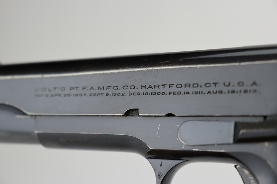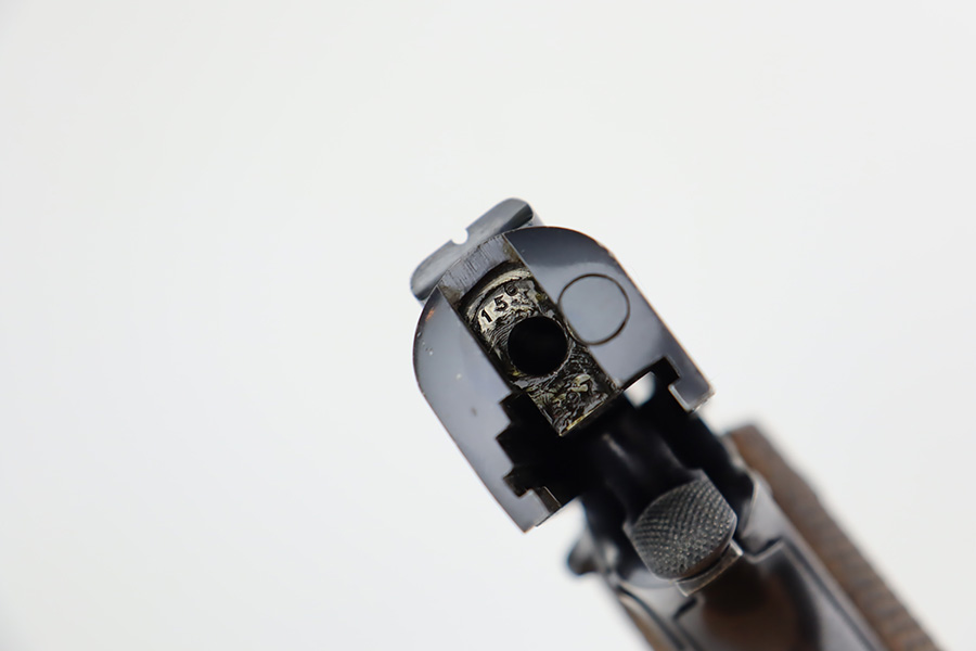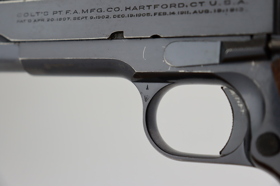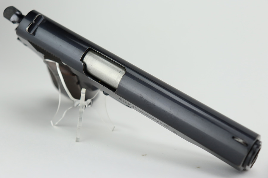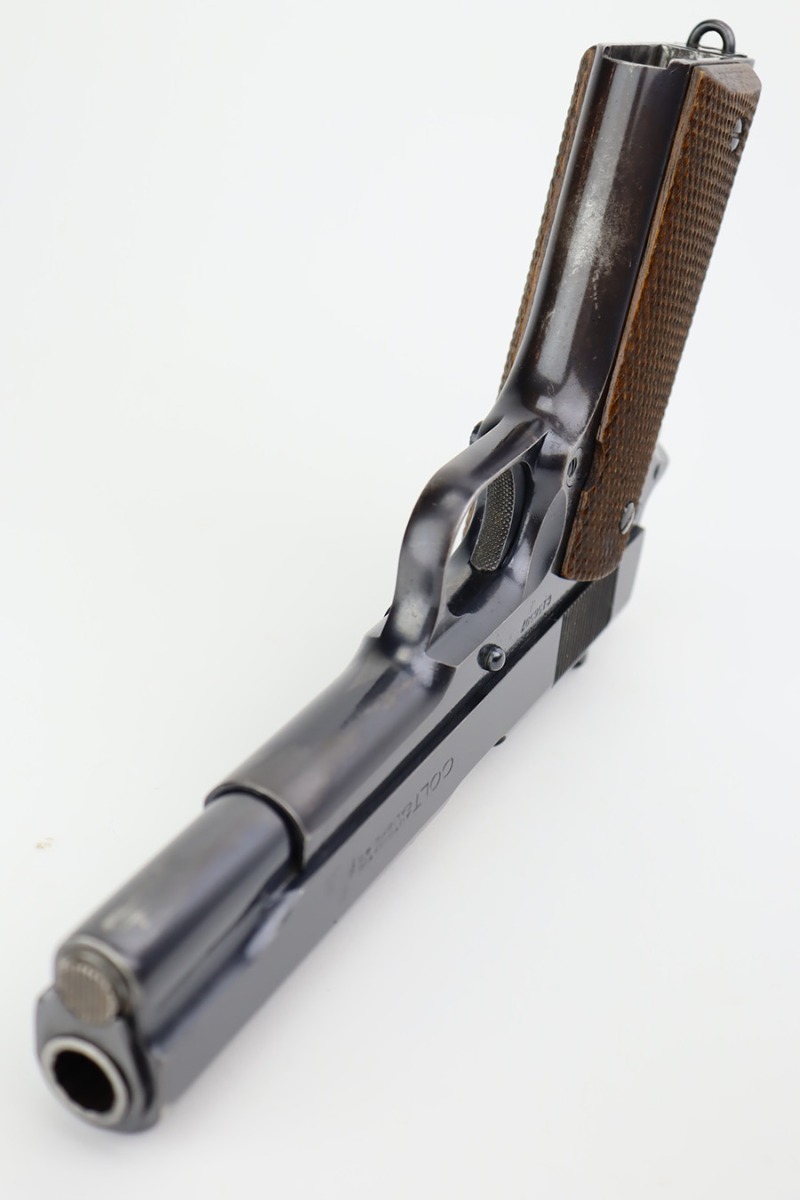 9/6/23 – This is a commercial Colt Government Model 1911A1 from 1929. It has a nice profile but the majority of the finish loss is on the front strap. Original blue rates around 85%. Proper, polished commercial Colt barrel. Slide is serialized to the frame. Excellent wood grips with no defects. Unmarked mag. Bore shows light frost.