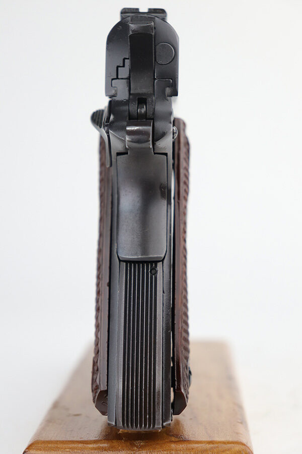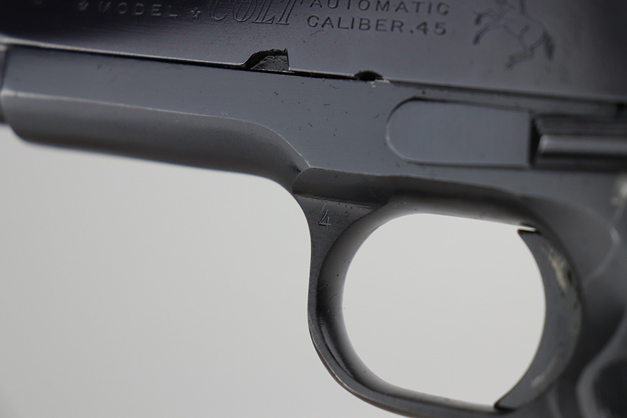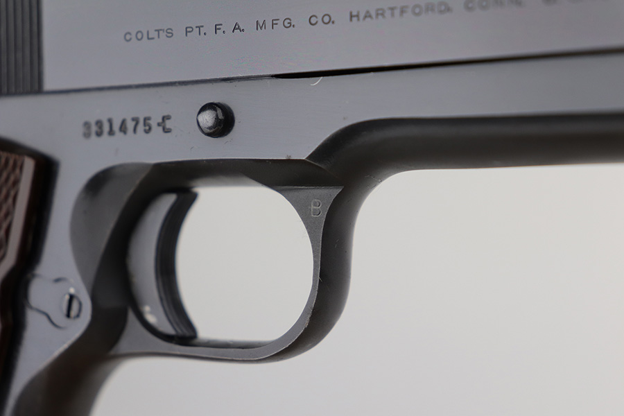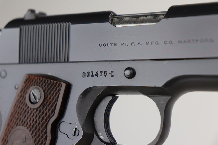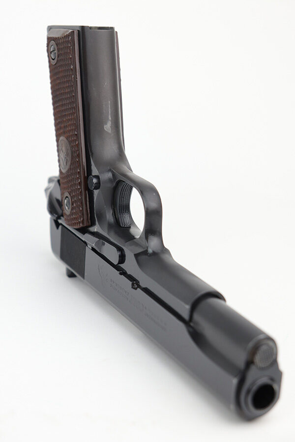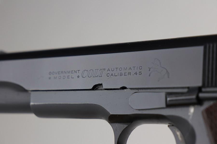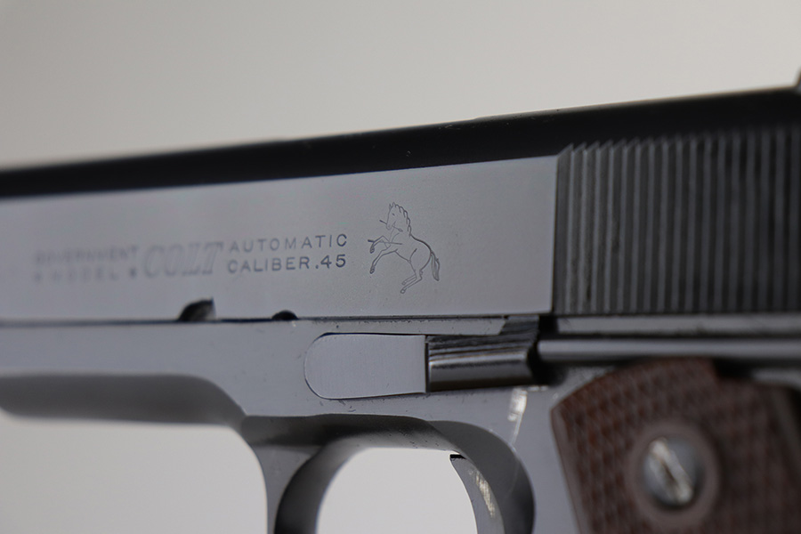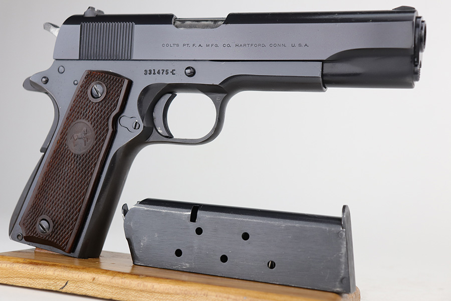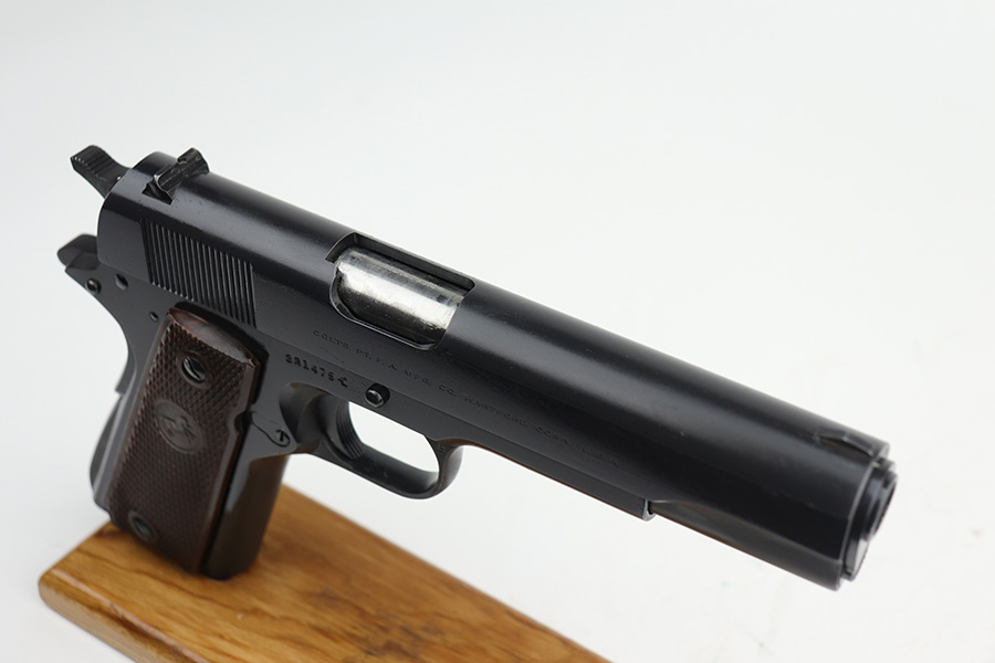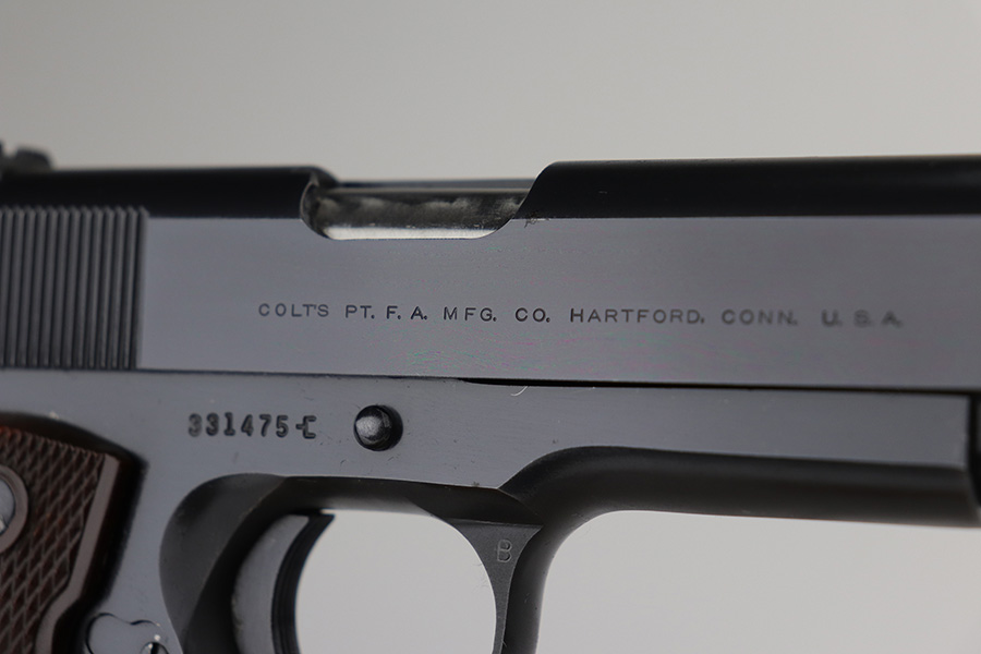 10/8/21 – This is a beautiful near-mint example of a Colt Government Model 1911A1 sold in the commercial market in 1969. The gun is all matching and has retained about 98% of its original finish. There is one small area of wear on the front strap and some light scratches on the left side of the frame from the takedown lever. Just the faintest hint of wear around the muzzle and some tiny dots of freckling on the back strap. Comes with excellent brown plastic Colt grips and a proper magazine. The bore is near-mint – very shiny with strong rifling.
