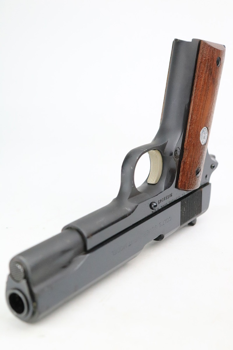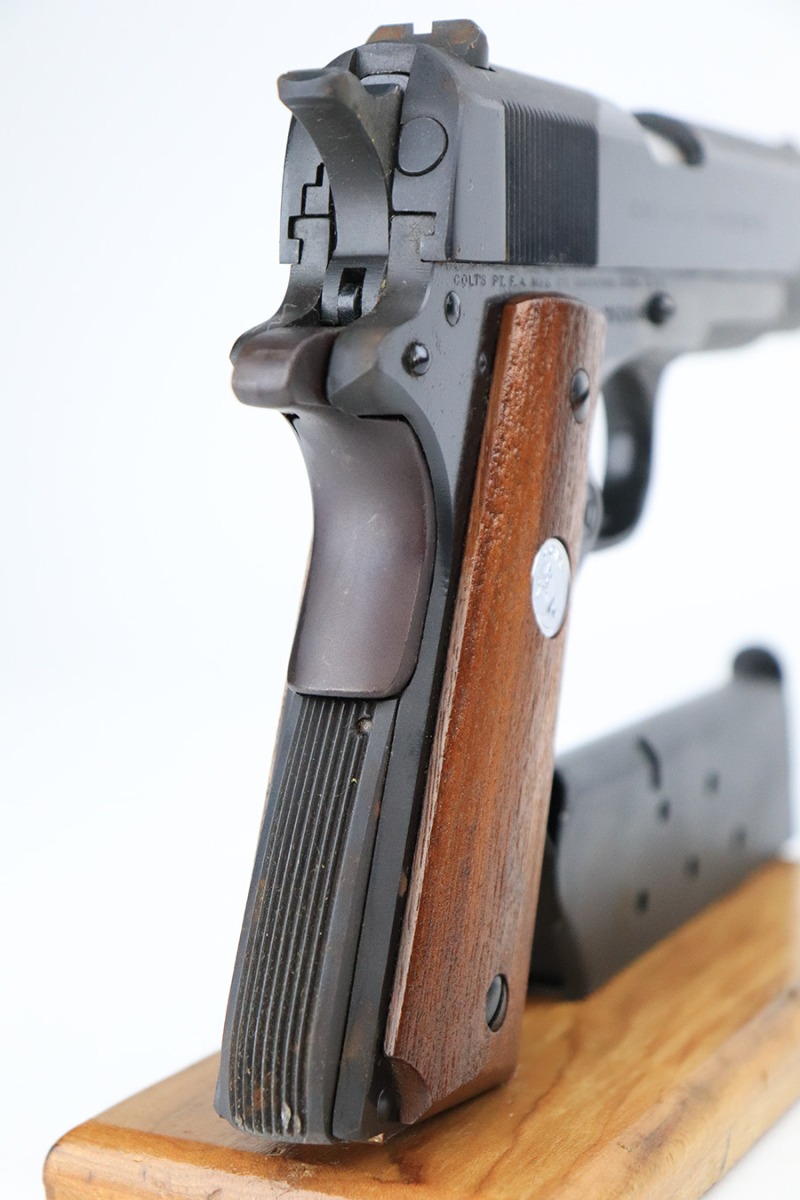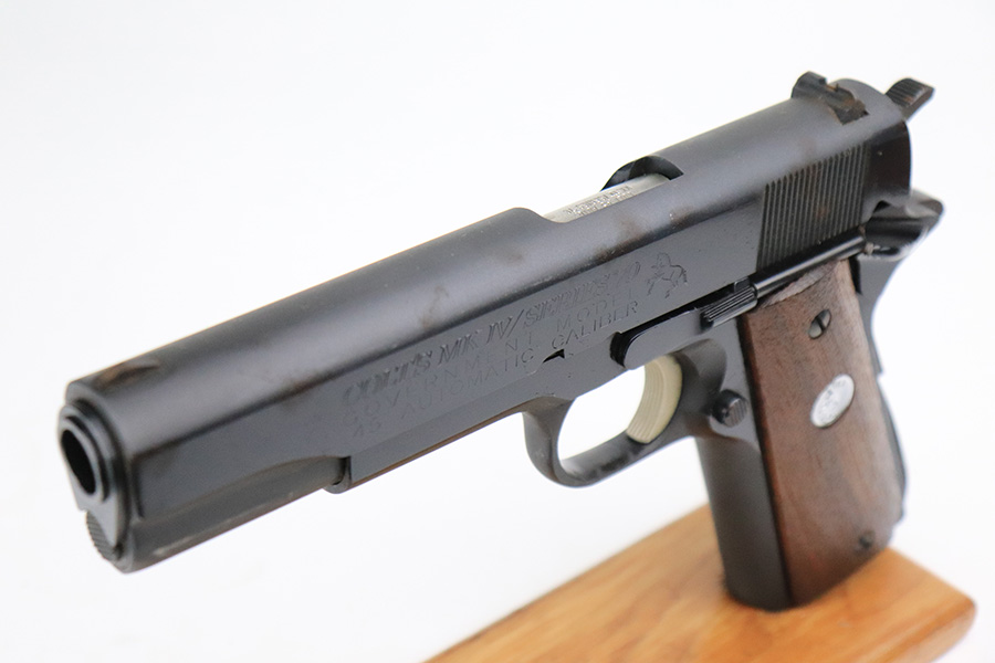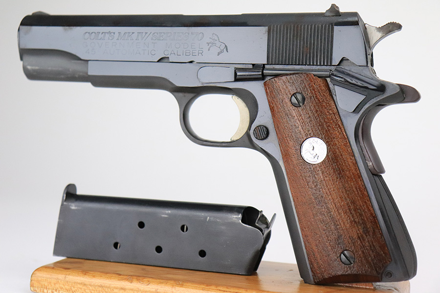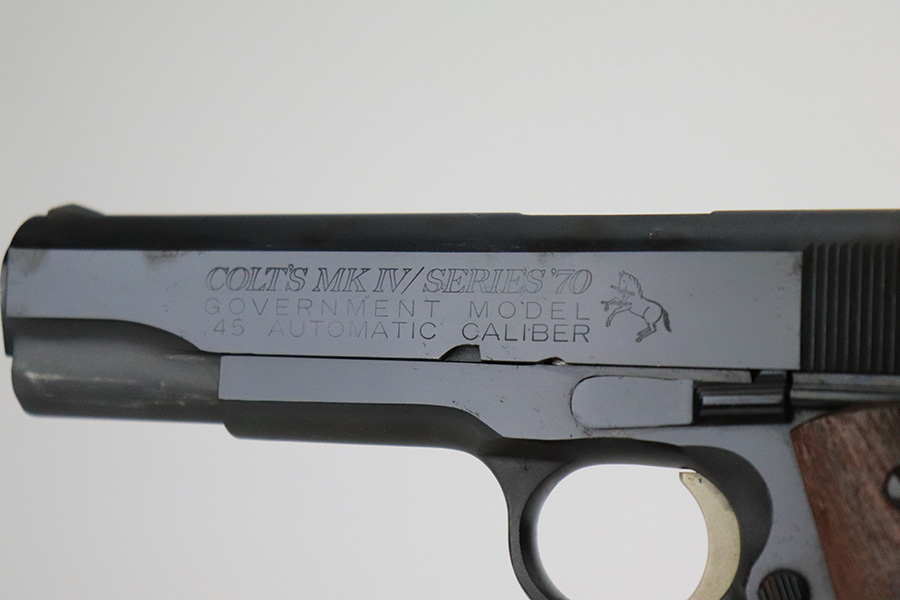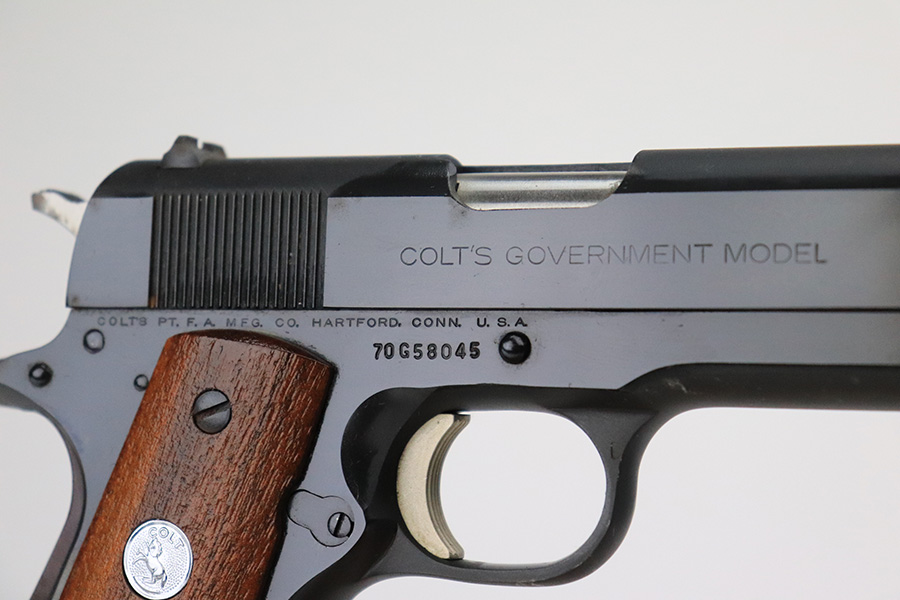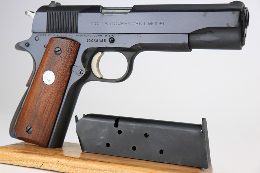 8/3/22 – This is a Colt Government Model MK IV Series 70 from 1973. The pistol has a mint bore and hardly any bluing loss, which would seem to indicate it’s been used and handled very little. But this pistol was not stored correctly as there are several patches of minor surface rust and pitting from moisture exposure. Minty Colt wood grips. Original mag marked COLT .45 AUTO on the base.