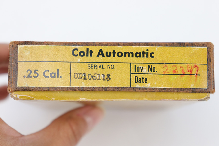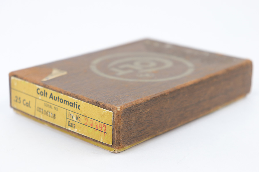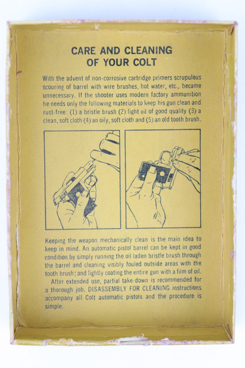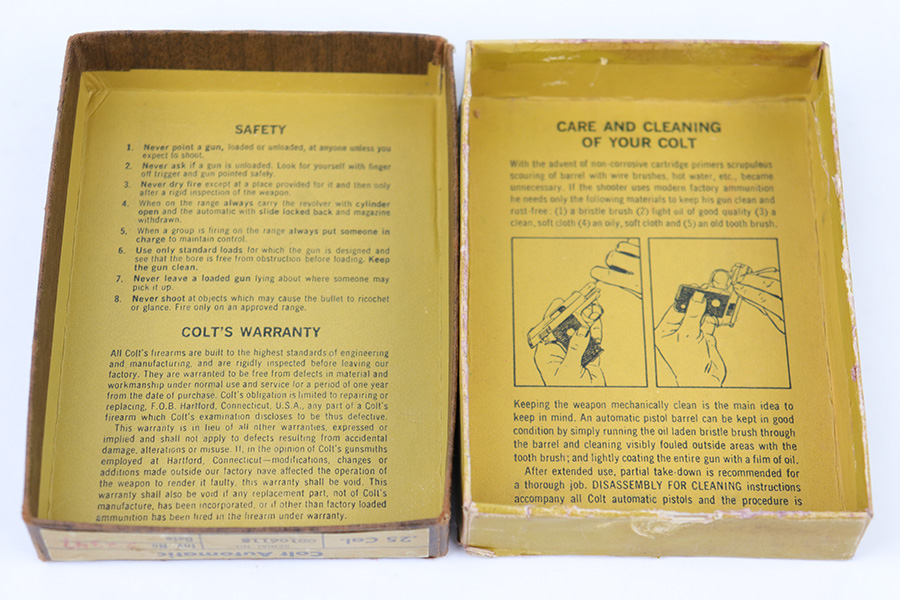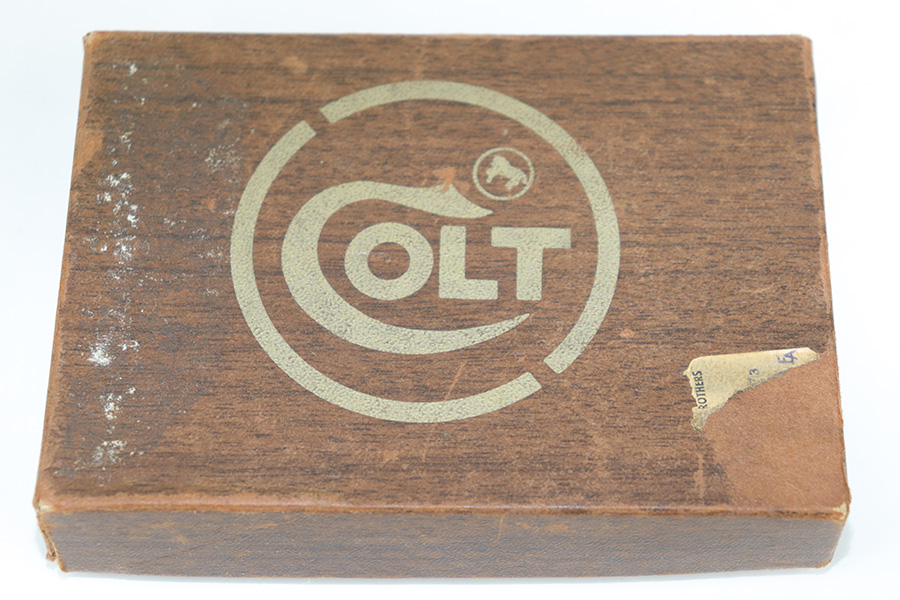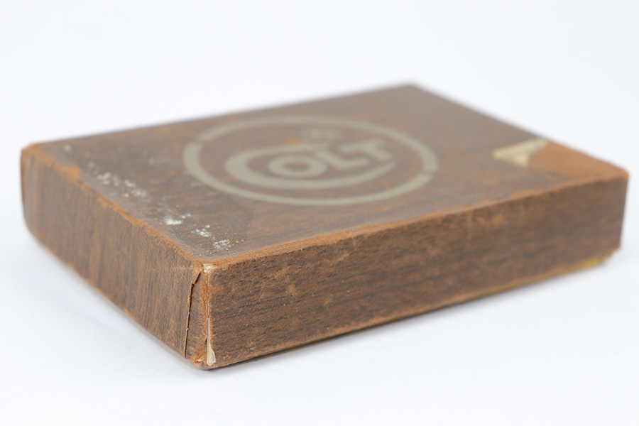 5/8/23 – This is an original Colt pistol box for a Colt Junior. In great overall condition as shown with some mild edge wear and some signs of previous use and aging. The serial number is still visible on the side label of the lid, as shown.