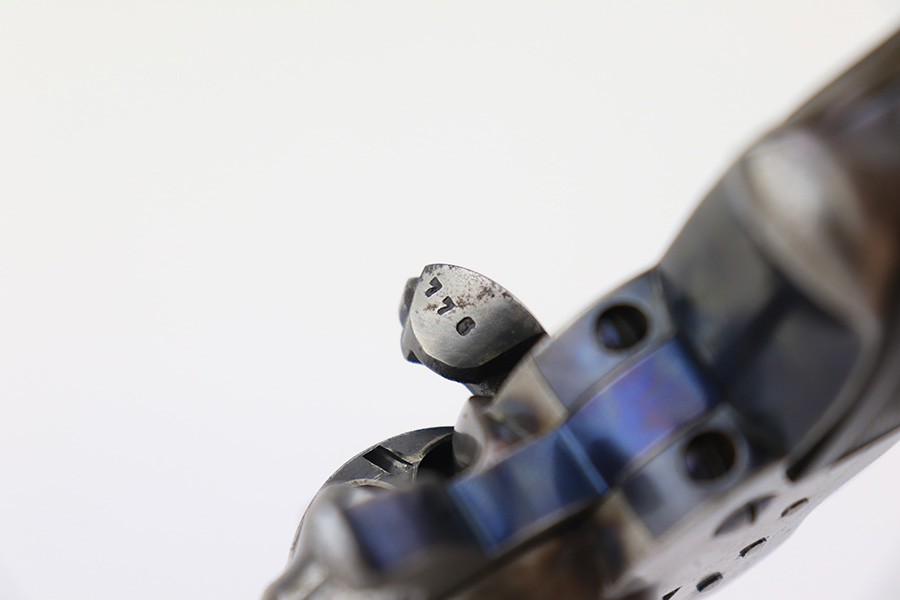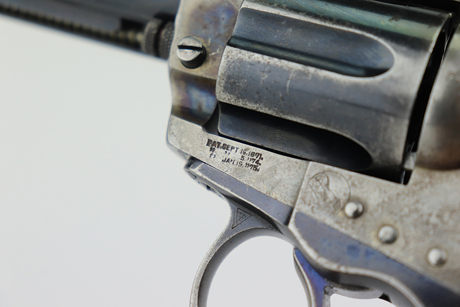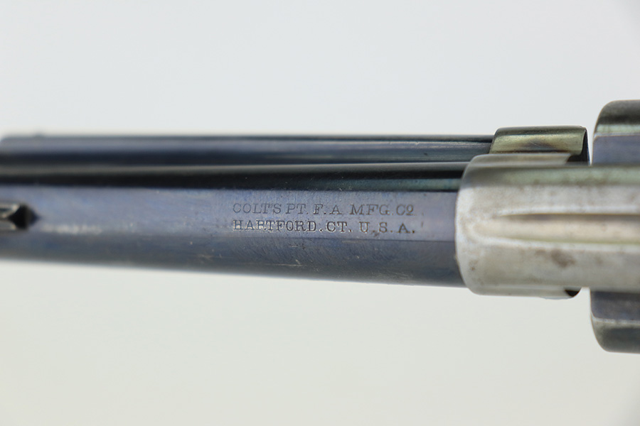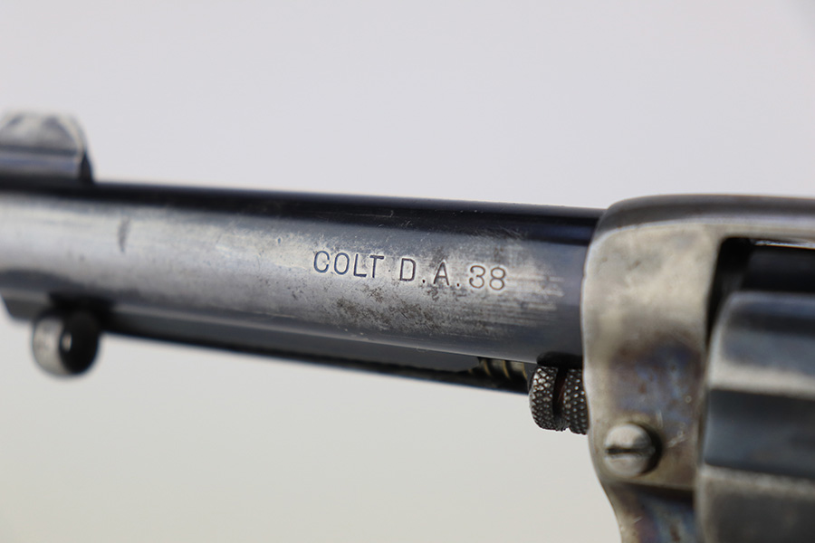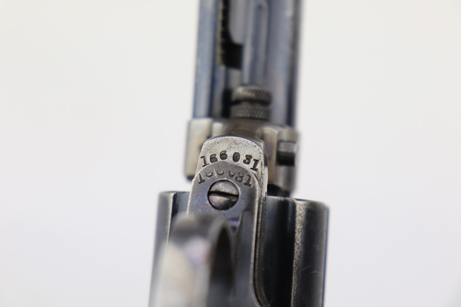 3/15/23 – This is an original Colt 1877 Lightning revolver from 1909. The Model 1877 was Colt’s first attempt at a double action revolver and is chambered for the .38 Long Colt cartridge. It has an outward appearance similar to that of the famous Single Action Army with a solid frame and loading gate. This revolver wears a 4-1/2″ barrel with ejector rod. This one has a very late serial number and is right at the end of production for these guns. The last serial number is 166849 – this one is 166031! It is all matching and has lost the majority of its original finish. Only a few small spots of the original case hardening on the frame are still visible. Noticeable wear throughout. Slightly worn grips. Minty bore. It seems to only work reliably in double action. The hammer only locks back sometimes.