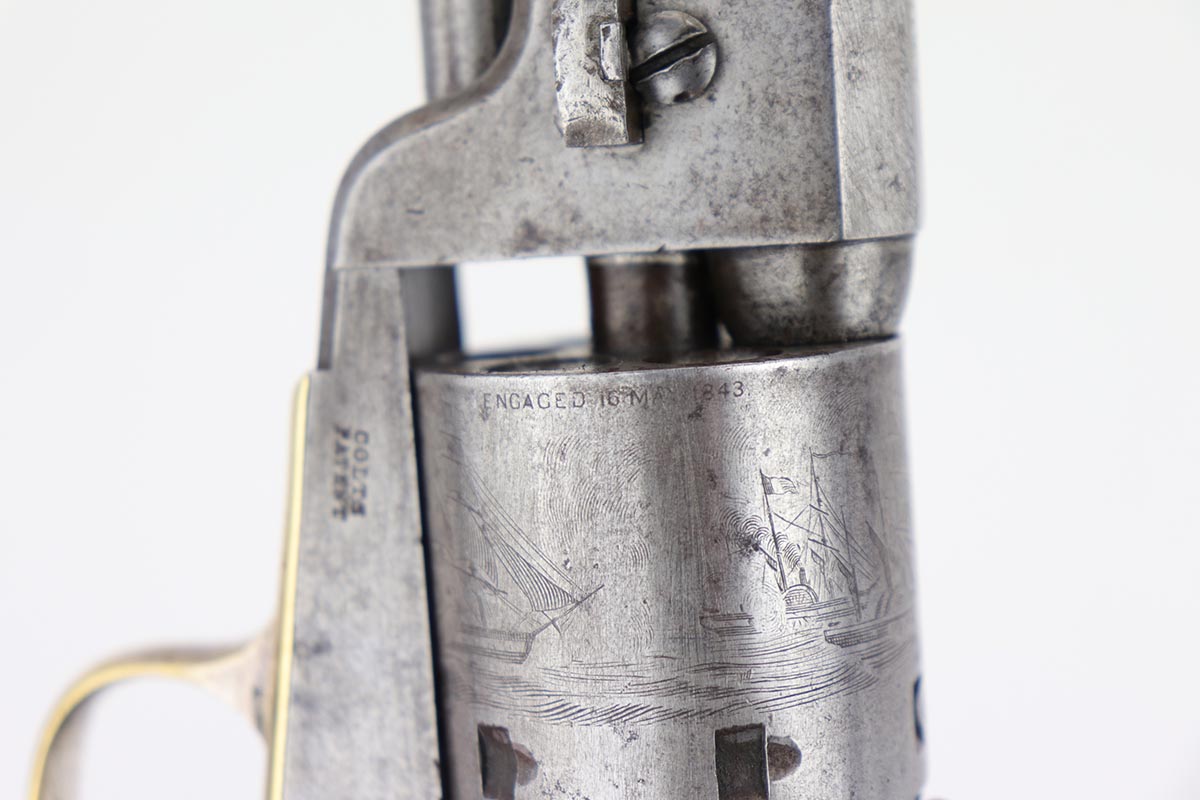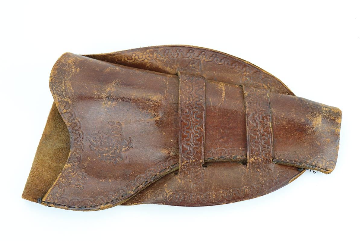 2/4/20 – This is a Colt M1851 Navy revolver, made in 1857 and chambered for .36 caliber. All matching numbers, including wedge. Fine to very good condition with good cylinder scene (Naval battle with Mexico; Engaged 16 May, 1843), un-buggered screws and decent bore. The revolver cycles correctly, the hammer engages properly with no play and all the hammer notches work with good lock-up. There is very little wear to the cylinder notches. Typical Address Sam’l Colt, New York City on barrel. Most of the metal finish has worn to silvery gray, with traces of patina. The trigger is still blued. There are two assembly proofs on the trigger guard; M and K. About 50% original grip varnish remains, with about 40% silver plate on the trigger guard, heel and backstrap. The safety pins on the cylinder are worn, but are still evident. I would not be afraid to shoot this fine old Colt from the Civil War period. The holster is a period Mexican double loop type with an unknown maker monogram. It came with the Navy Colt from an old gun shop in Laredo Texas during the 1960s. A fine old piece of Western history.