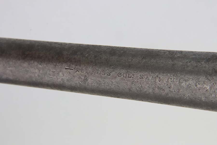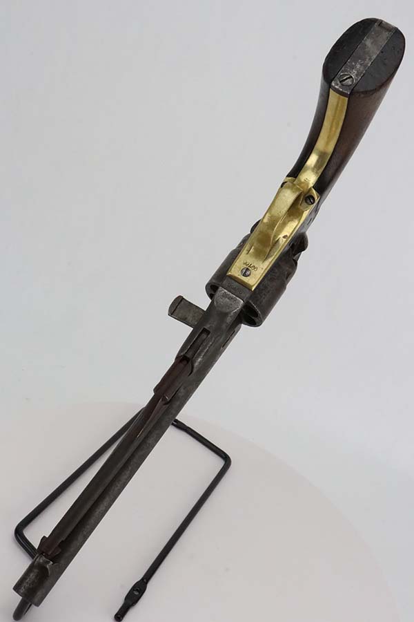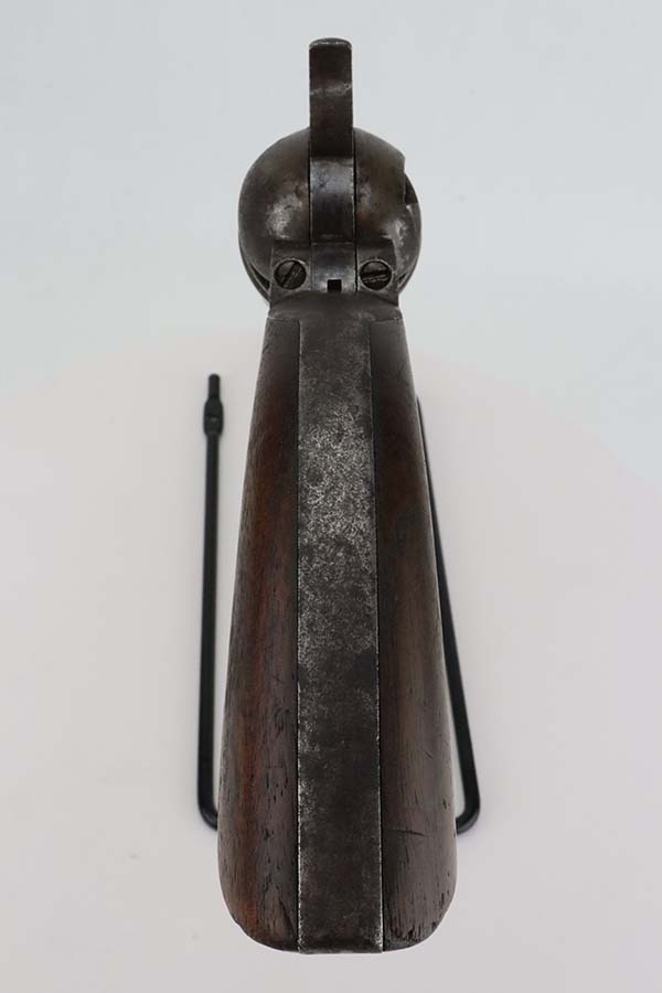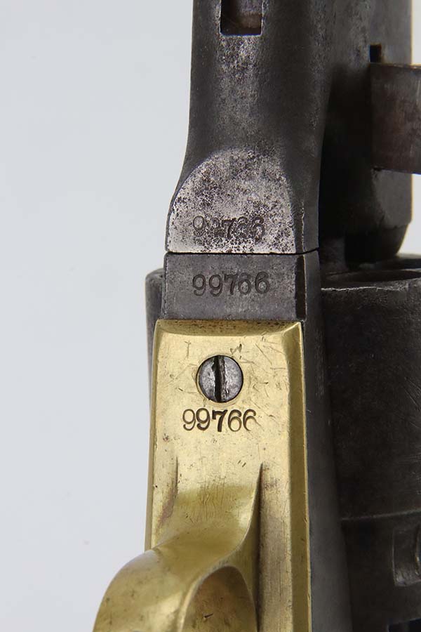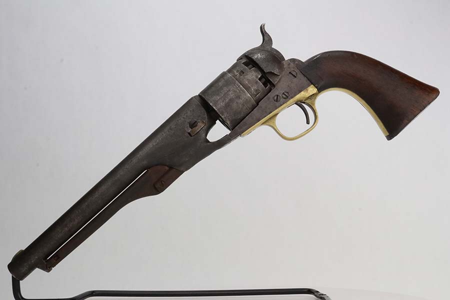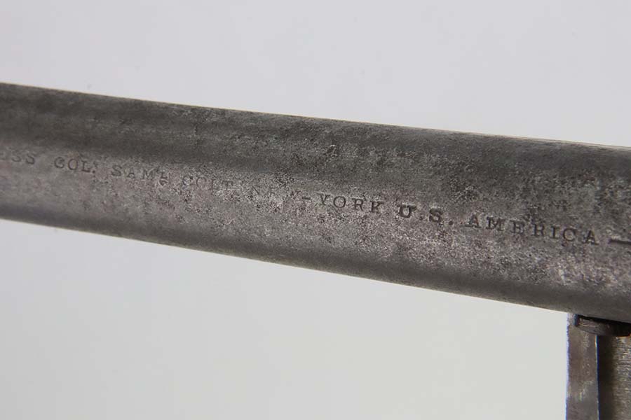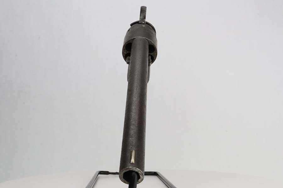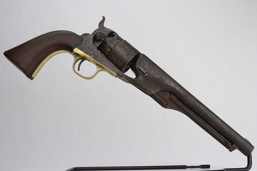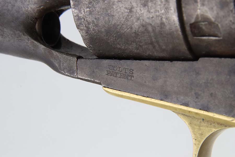 3/1/24 – This is a Colt Model 1860 Army Revolver from 1863, chambered in .44 Caliber. It is all matching except for the ejector rod, which is a replacement. The barrel wedge fits very loose in the gun, and the ejector rod does not work properly (gets jammed). The naval engagement scene on the cylinder is still partially intact but hard to see. Overall, the gun is in fair condition, but there is obvious spotty oxidation and pitting throughout. There is some surface rust on the ejector rod. Fitted with period-correct wood grips – faint cartouches on both sides. For its age, the bore has decent rifling, but there is obvious spotty surface oxidation throughout.