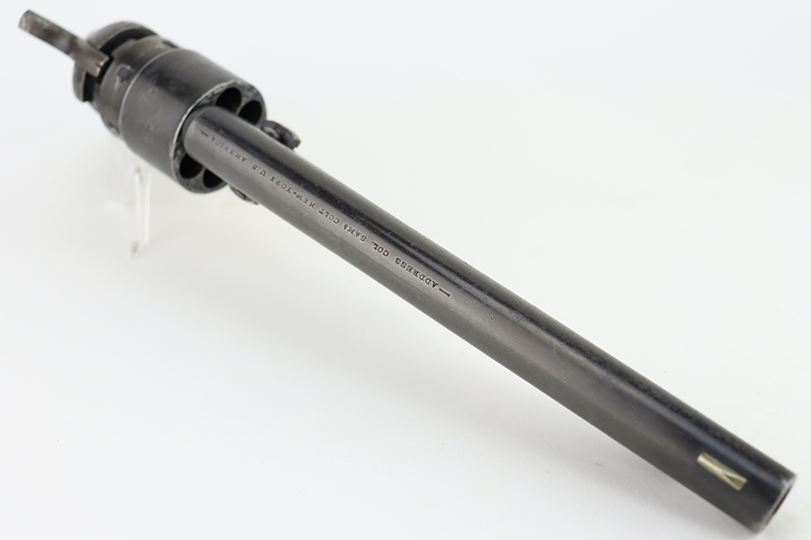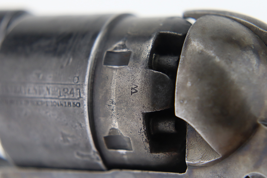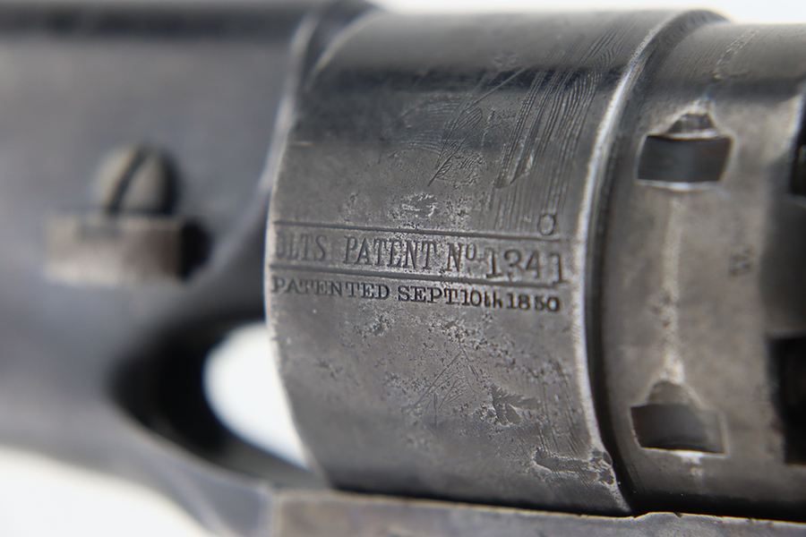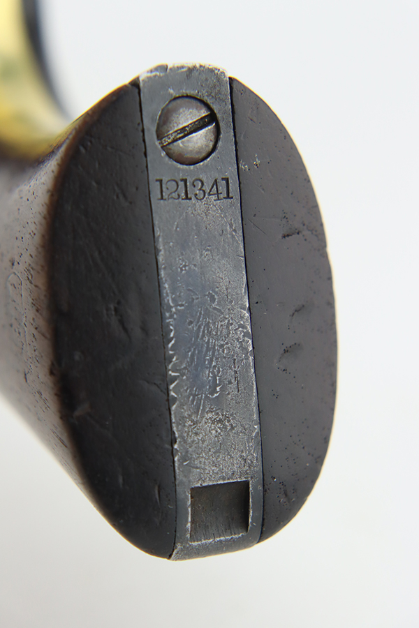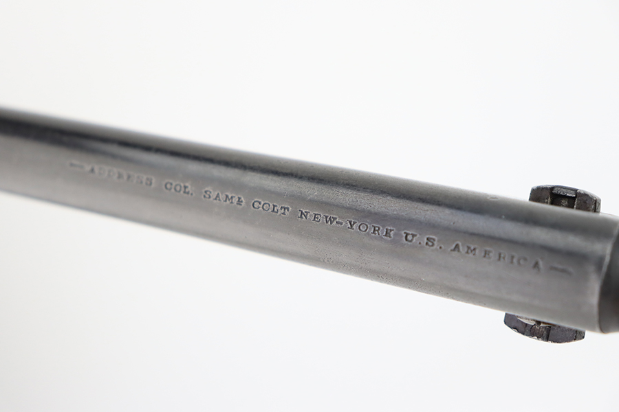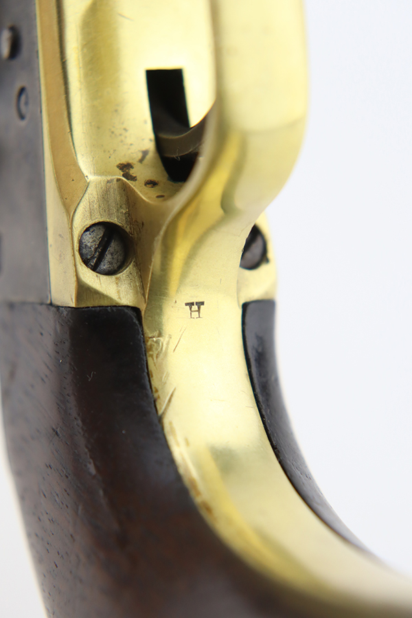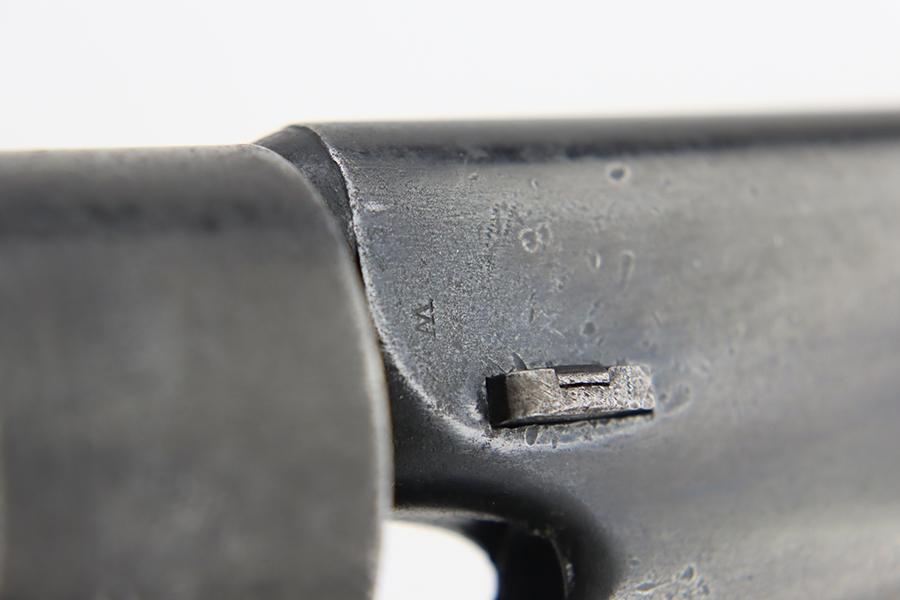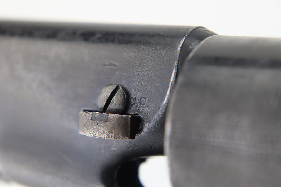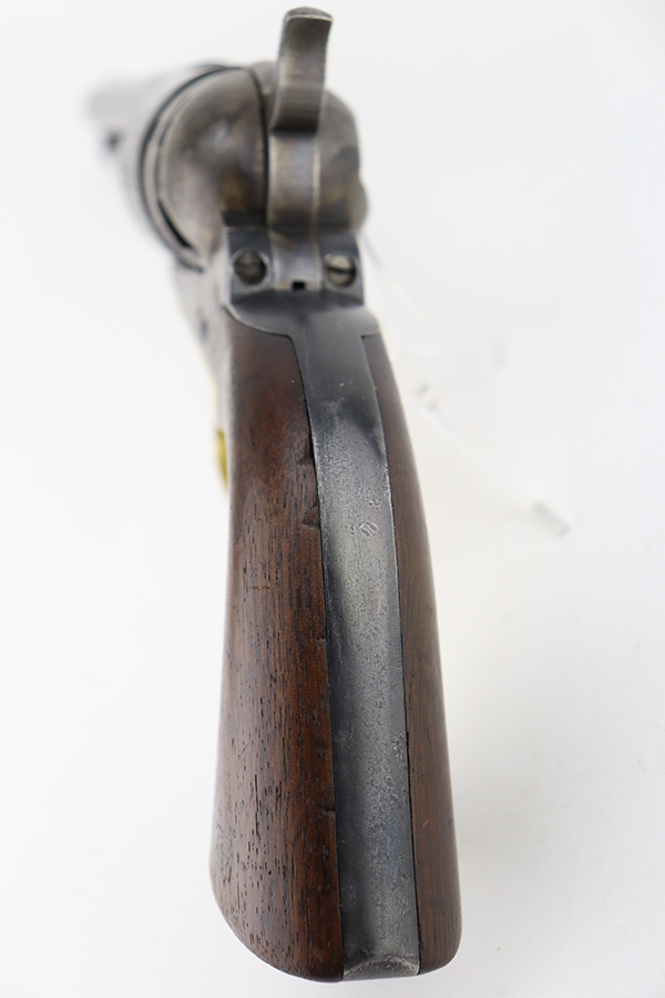 1/26/24 – This is a nice example of a Colt Model 1860 Army revolver manufactured in 1863. The gun is all matching and has the iconic Naval engagement scene on the cylinder, which is mostly clear. It has actually retained much of its original finish, but there is noticeable pin-pricking along the barrel. Some of the original case-hardening on the frame. Fitted with nice period-correct grips – military cartouches on both sides. Very nice bore with great rifling. Good action.