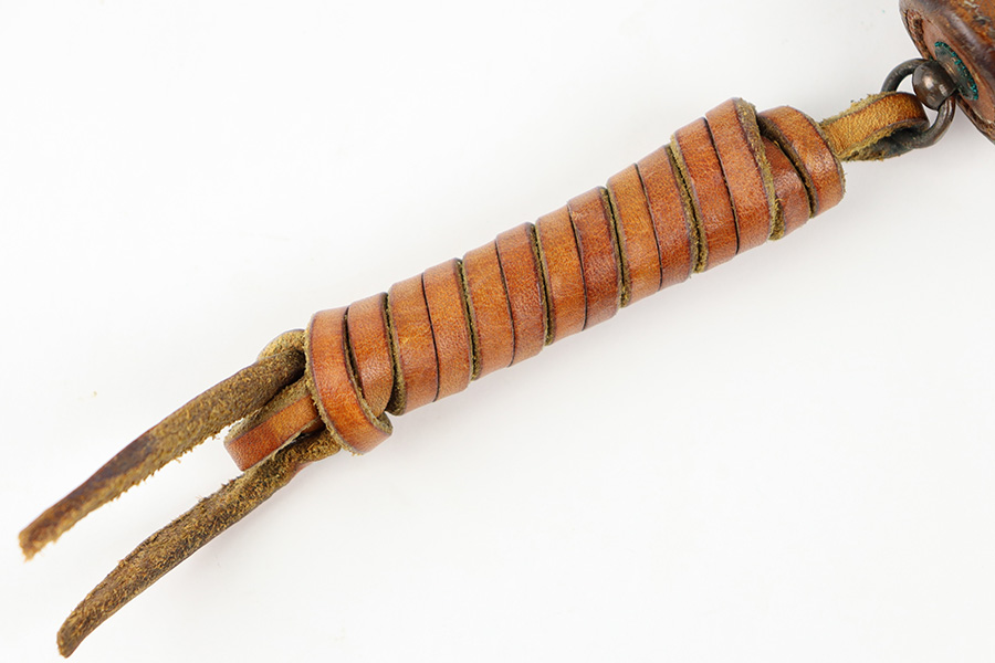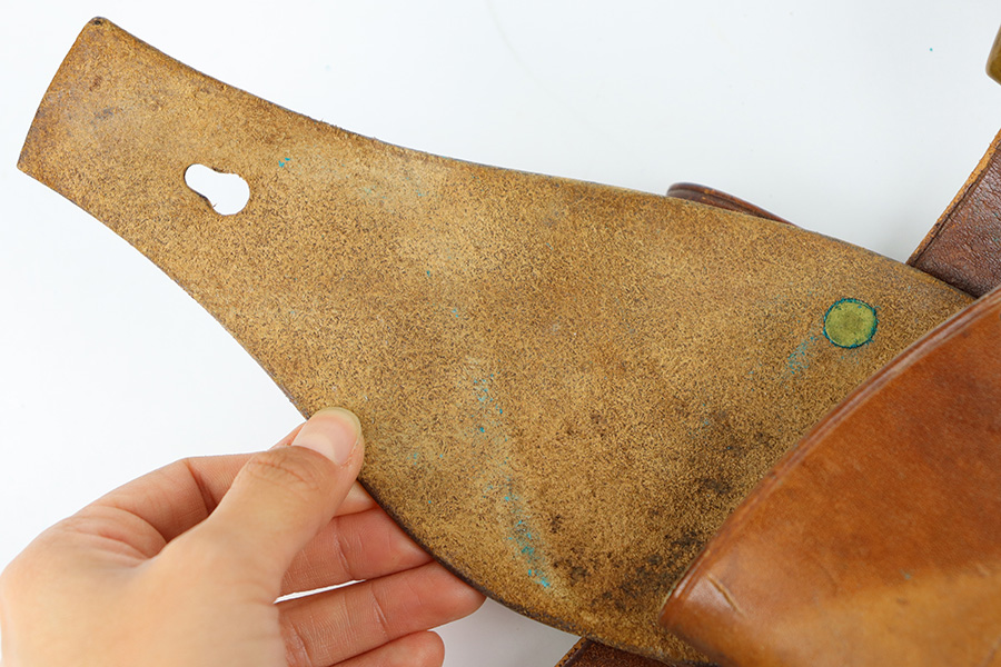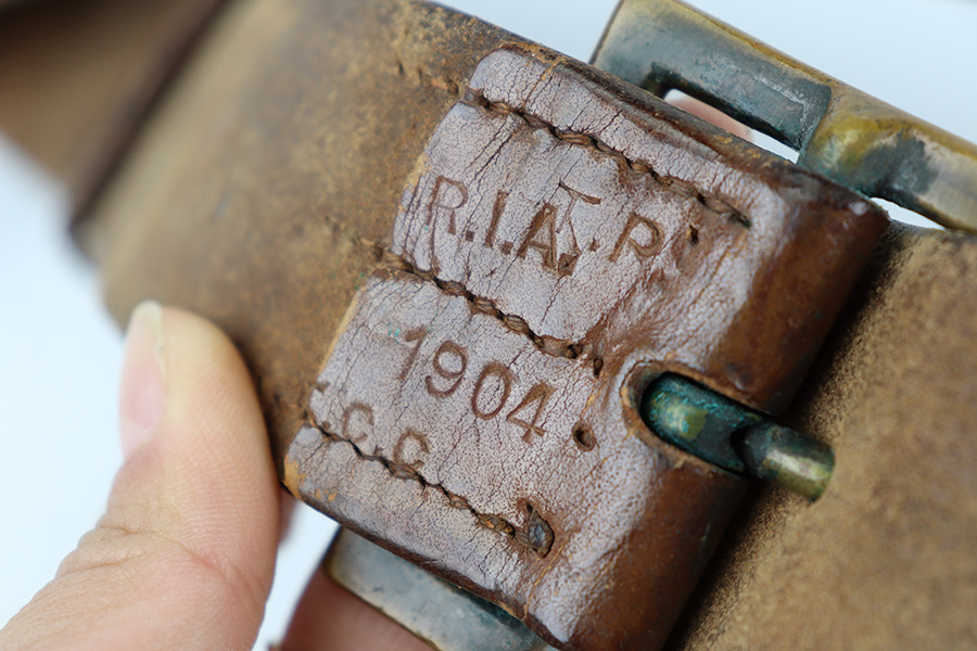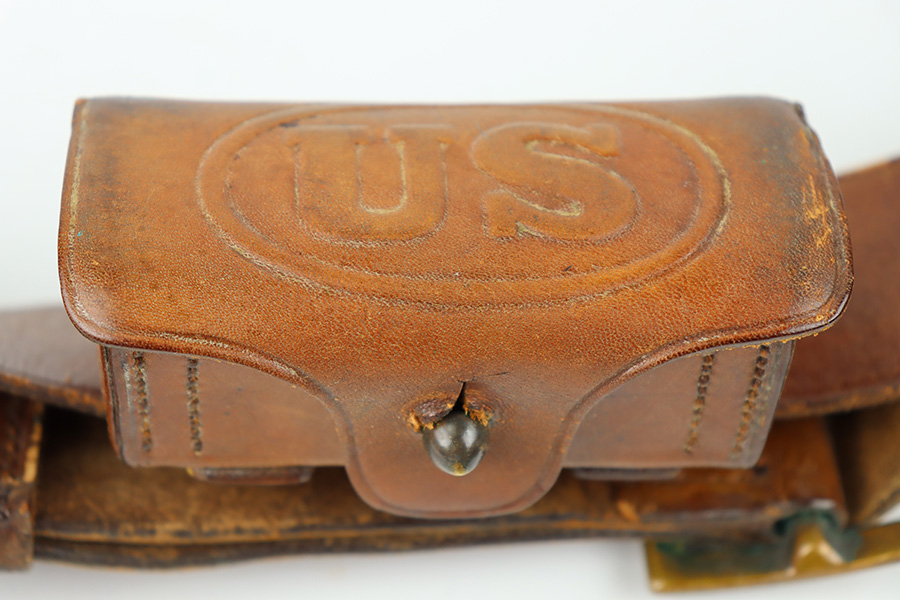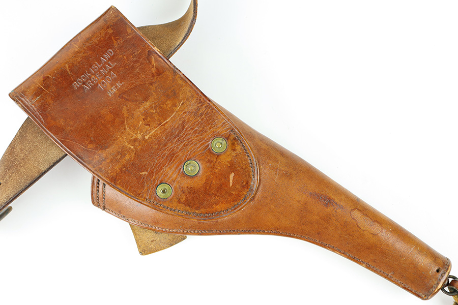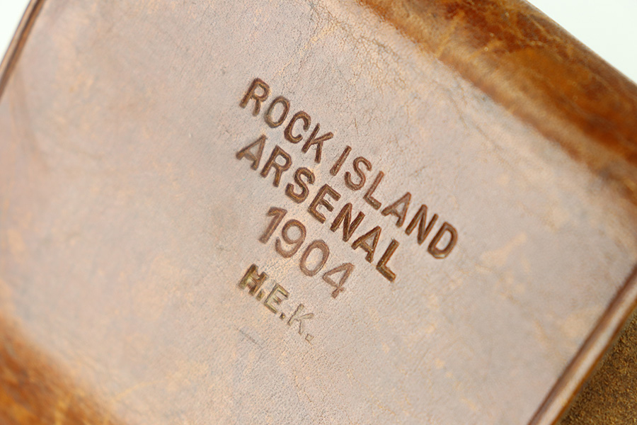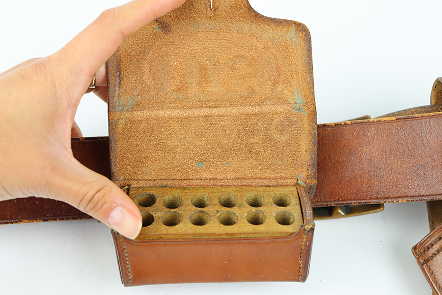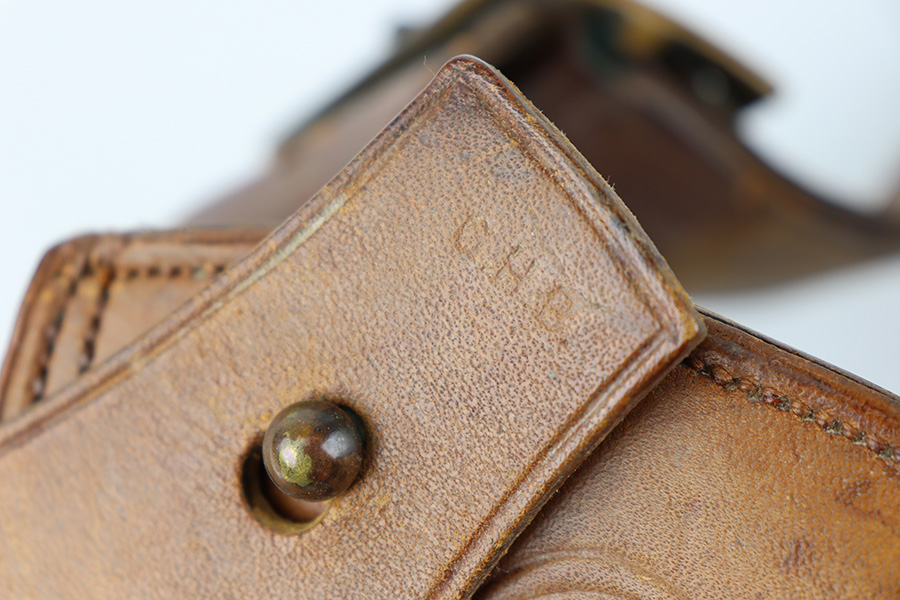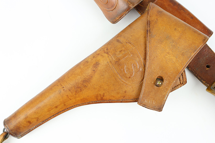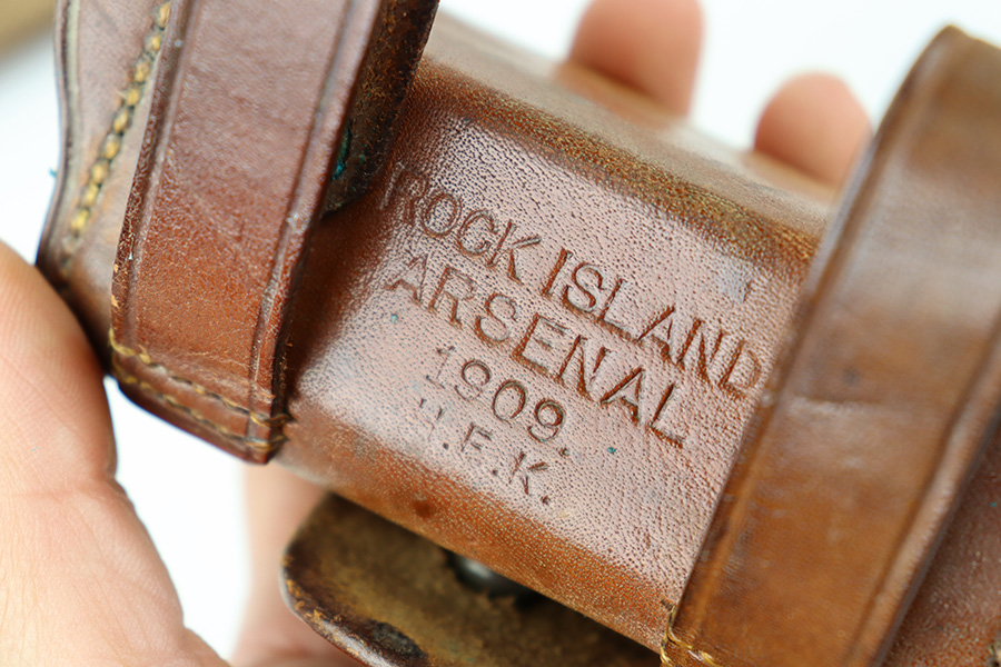 10/20/23 – This is a fairly scarce, all original grouping of leather military gear that dates pre-dates WW1. This grouping includes a leather revolver holster (for a Colt M1901 or similar) that is maker stamped, dated and inspector proof stamped on the back leather. The front leather is inspector stamped as well, on the end of the closure strap. The leather is soft and pliable but in excellent overall condition for its age. No stitching issues with an intact toe and leather lanyard attached. The leather belt is in great shape with some mild surface cracking and wrinkling throughout, and normal pliability. No major issues and completely intact and strong throughout. Also included is a 1909 dated R.I.A. cartridge pouch, which is in excellent condition as well. A rare, original and early grouping of WW1 US gear.