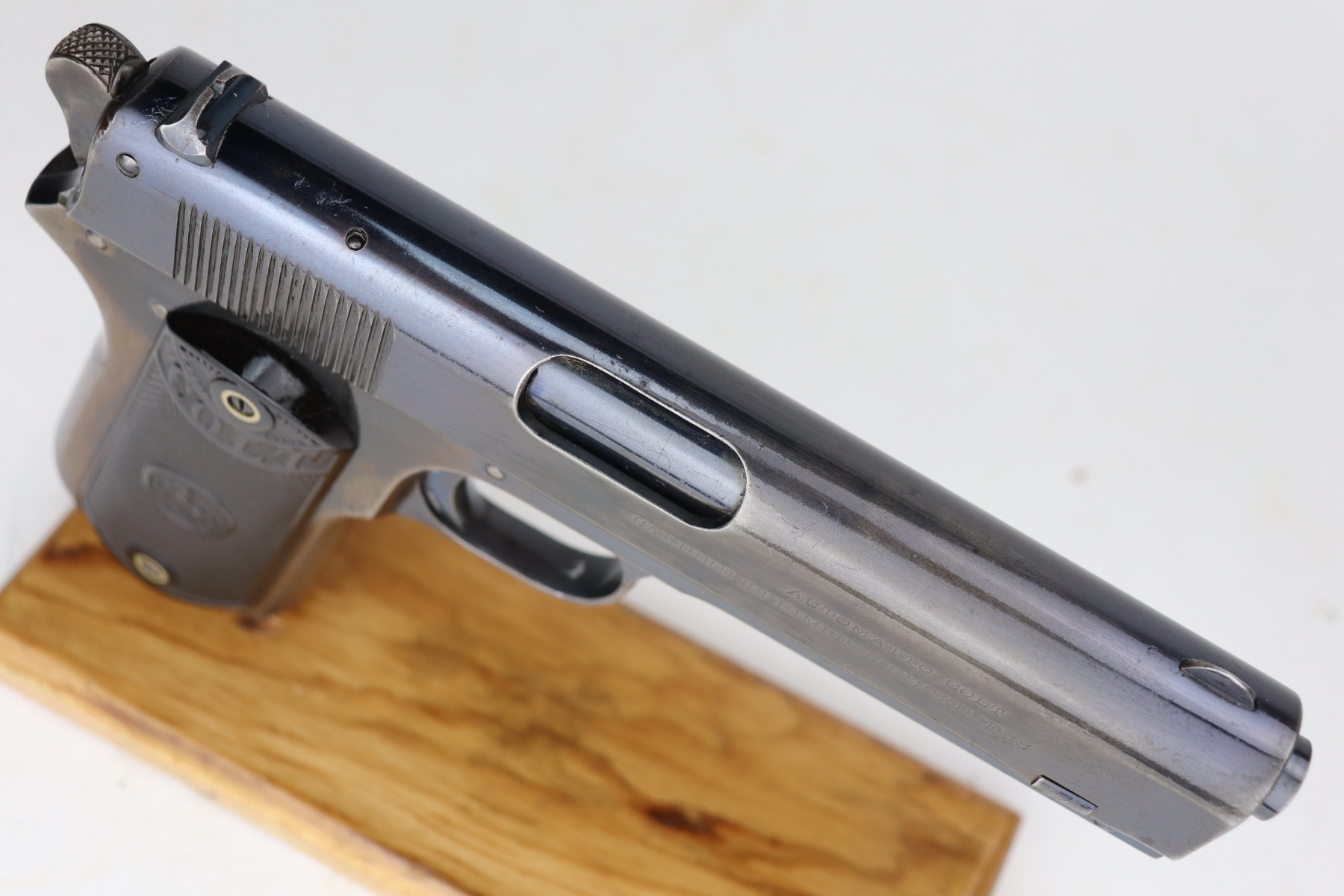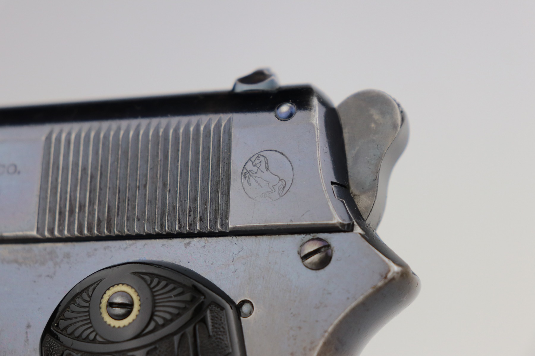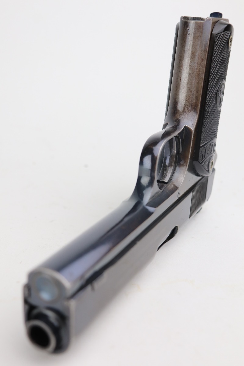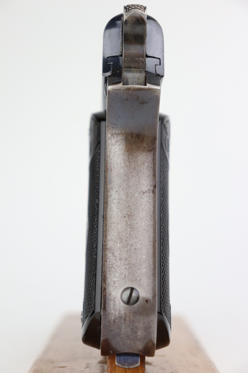 3/19/21 – This is a very nice example of a Colt M1903 Pocket Hammer Pistol manufactured in 1907. It is all correct and has retained roughly 60% of its original finish. Most of the finish loss on the straps but there is also minor wear around the muzzle and high edges of the slide. There are areas of thinning on the slide and discoloration on the right side of the frame. There is spotty oxidation here and there, most noticeable on the straps. It comes with excellent grips and a proper magazine. The bore has strong rifling with very minor oxidation.