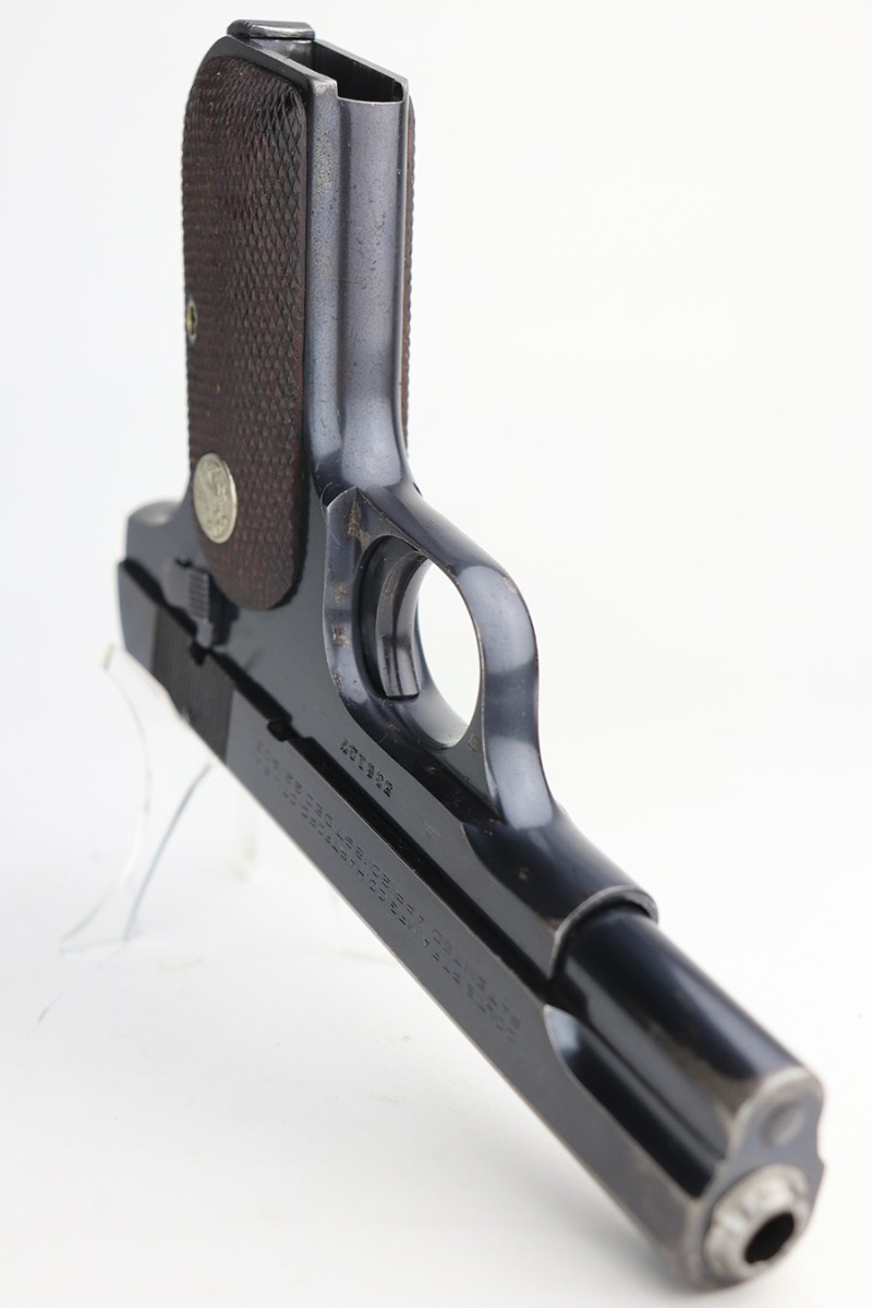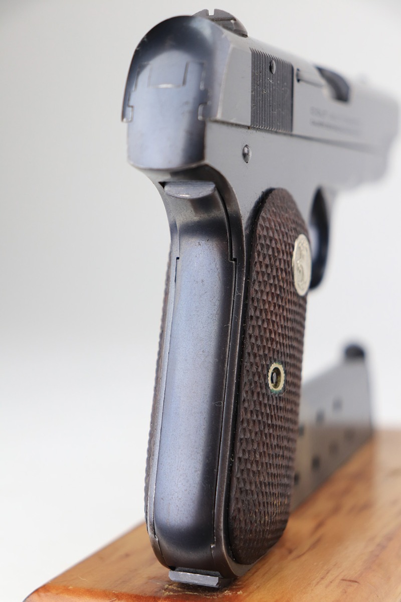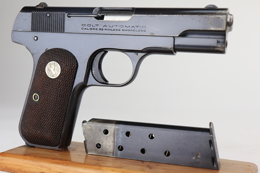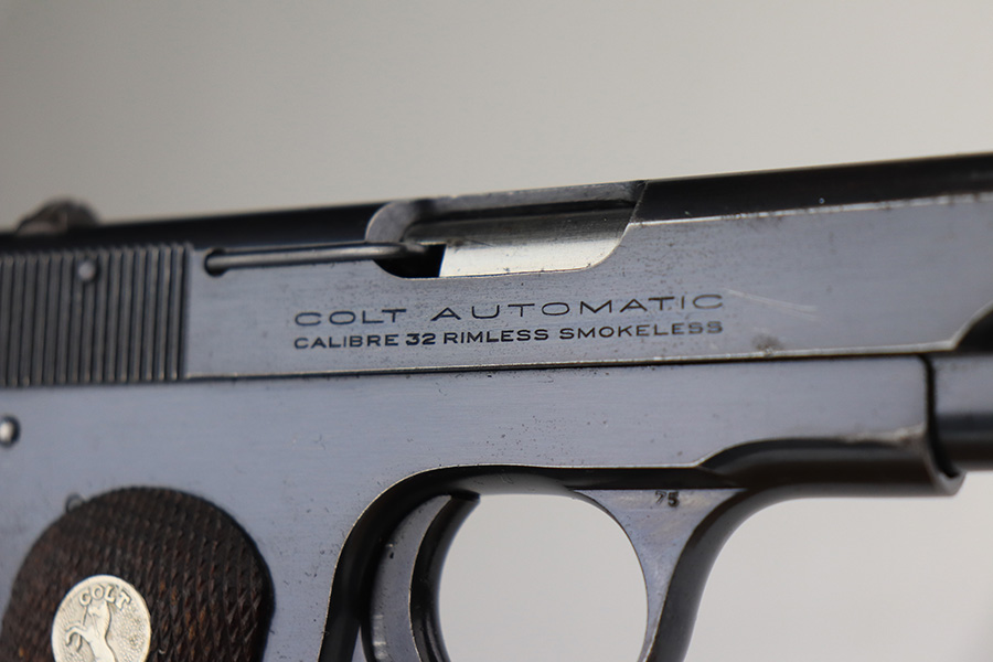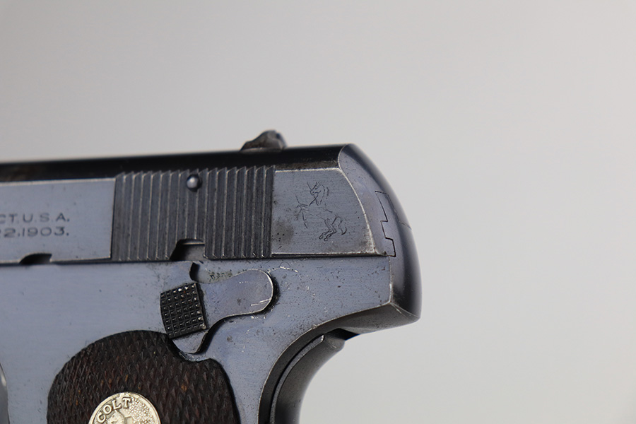 2/3/22 – This is an original Colt M1903 Pocket Hammerless from 1938. Blue rates in the low 90s with areas of finish loss on the underside of the slide, top of slide, and either side of the muzzle. Excellent grip straps. A few surface scratches behind the safety. Excellent bore and very nice grips with minor handling wear. Original two-tone magazine.