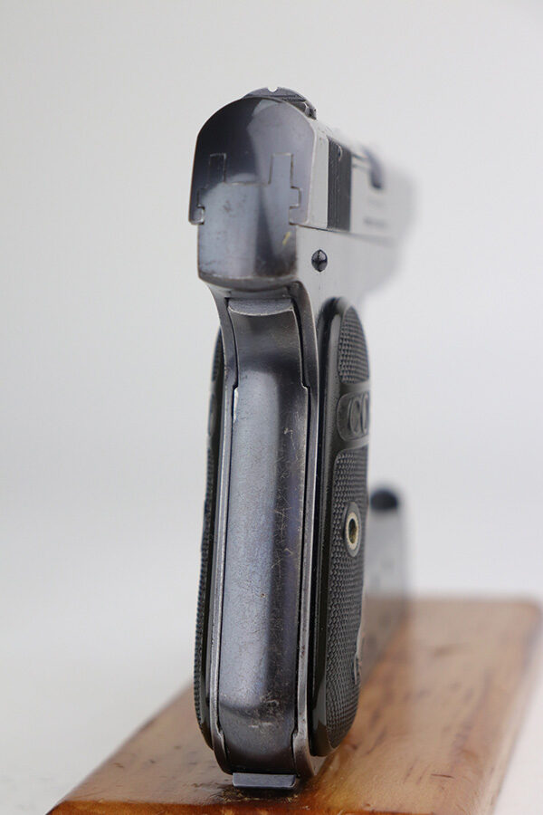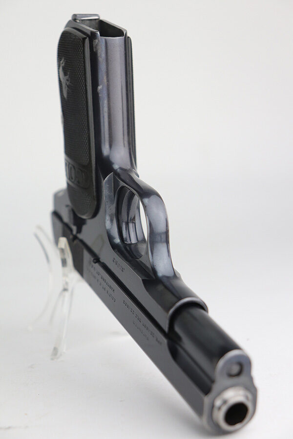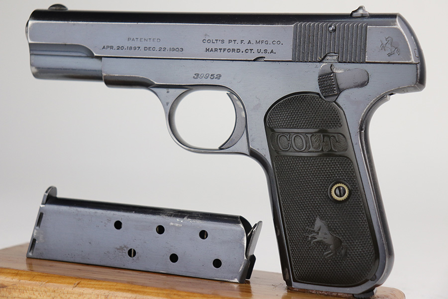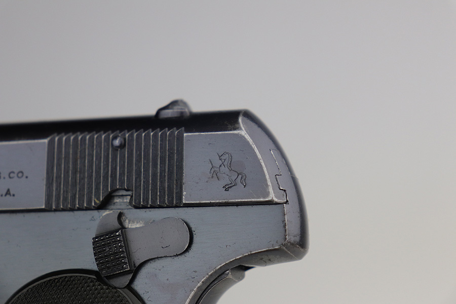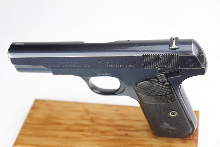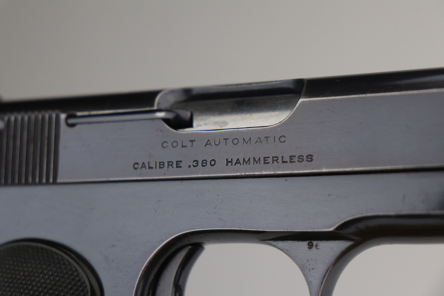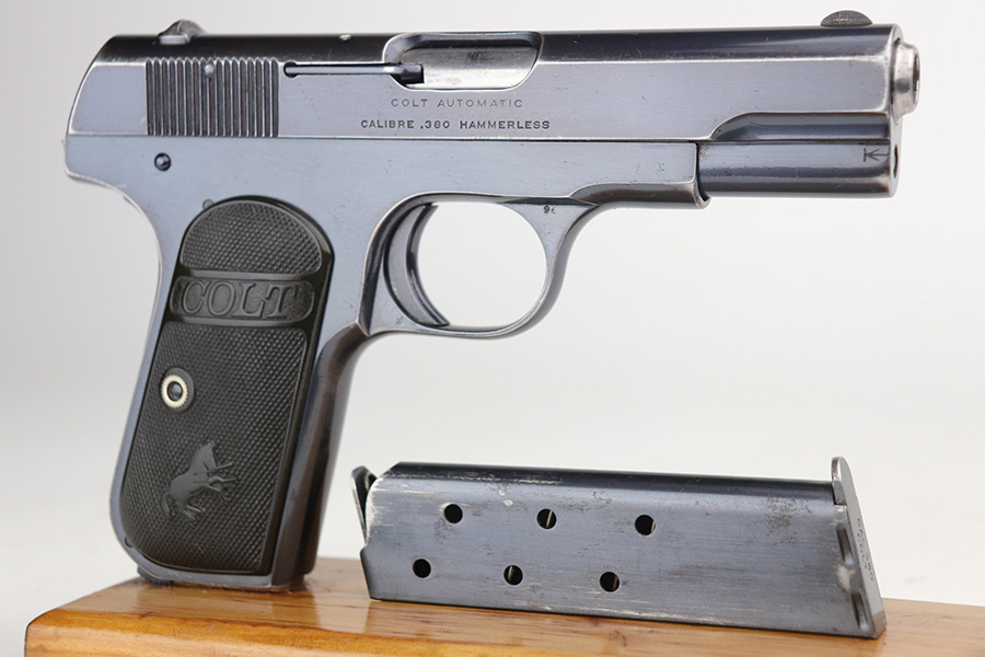 11/29/21 – This is a very nice example of a Colt Model 1908 Pocket Hammerless that was manufactured in 1920. It is all matching and correct. According to the factory letter that accompanies the gun, it was shipped and delivered to Elmira Arms Company in New York on January 28th, 1920. It has retained about 93-94% of its original high polish finish. There is minor wear on along the high edges of the slide and around the muzzle. Some spotty/scratchy wear on both grip straps. There are a few very light surface scratches here and there. Comes with excellent hard rubber Colt grips and one proper magazine. The bore has good rifling with pin-pricking throughout.