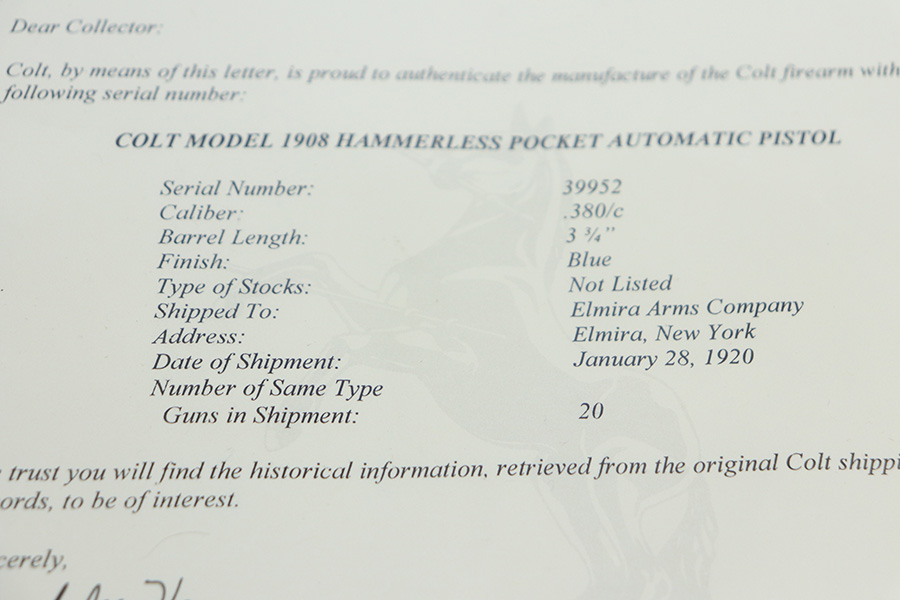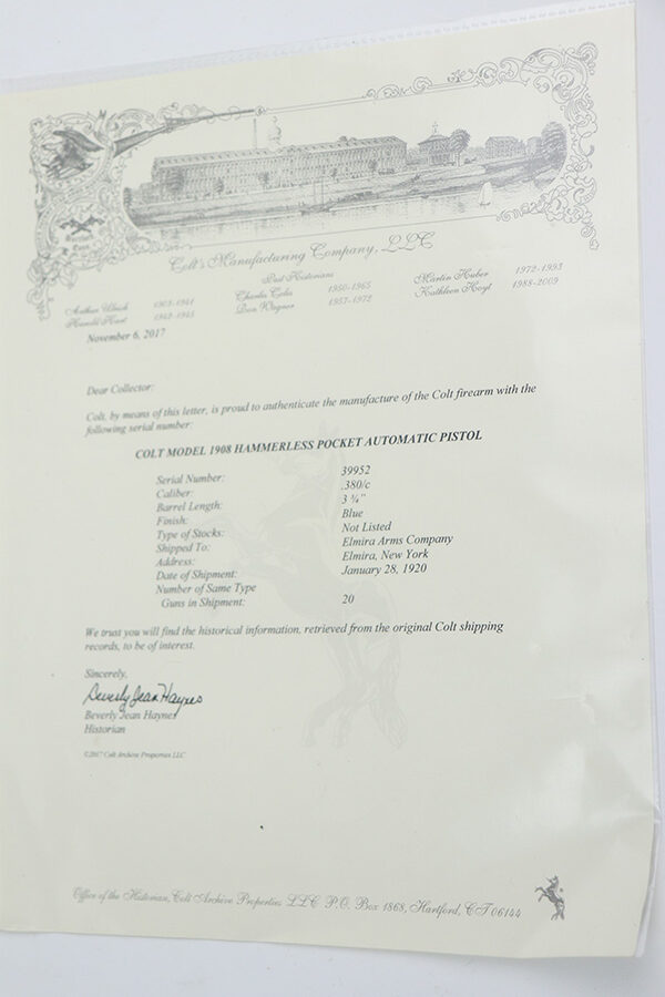 SOLD – Colt M1908 Pocket Hammerless – Factory Letter