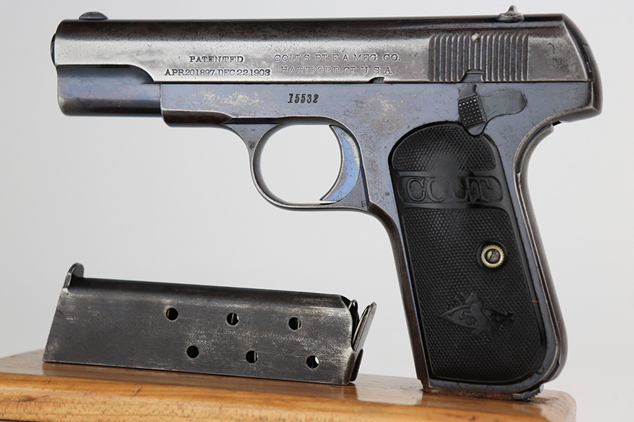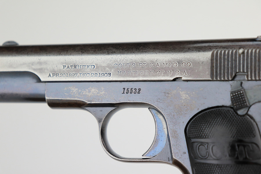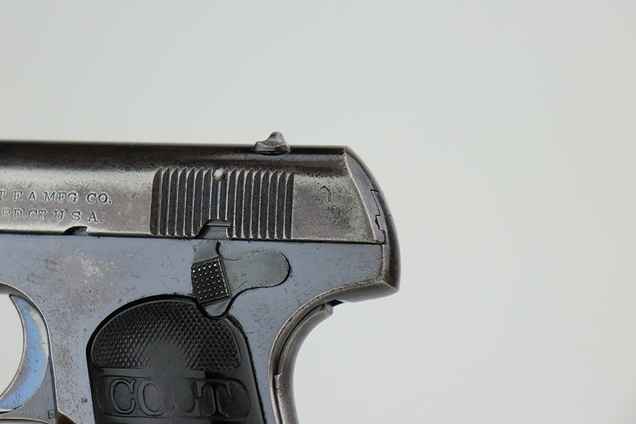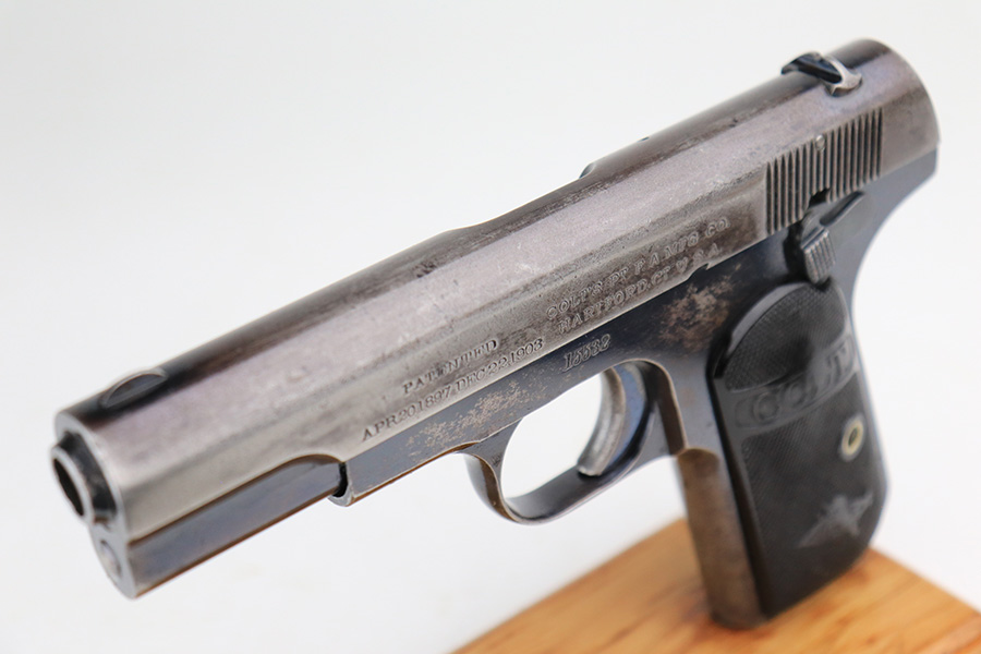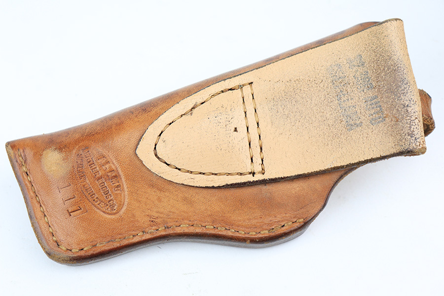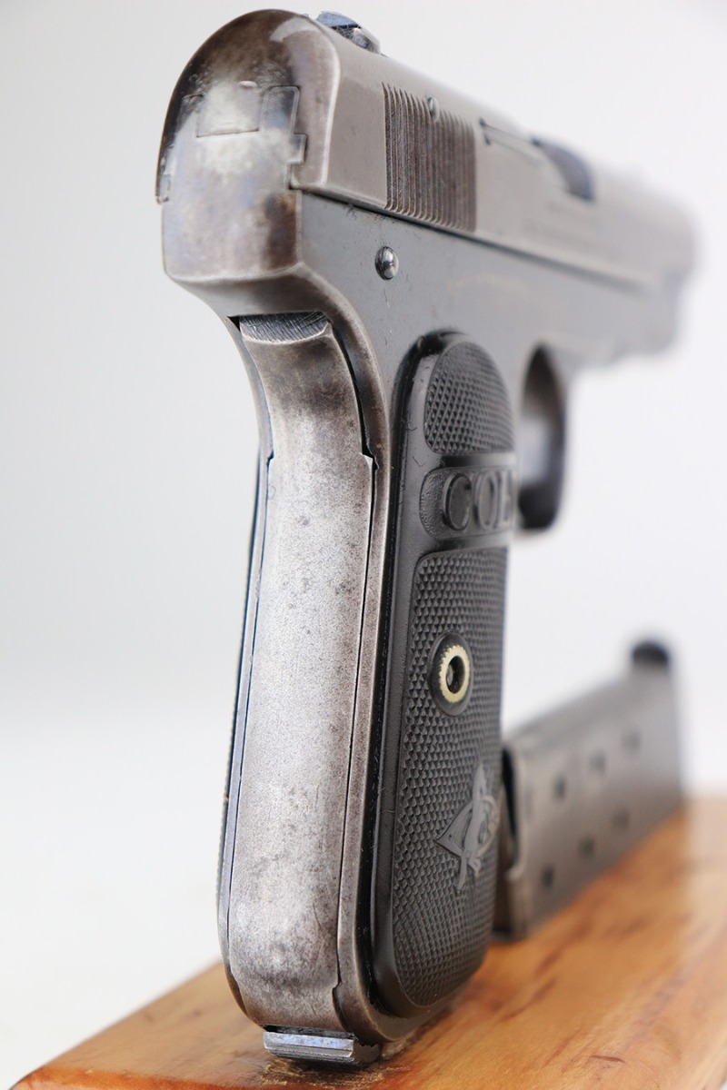5/12/22 – This is a nice example of a Colt Model 1908 Pocket Hammerless sold in the commercial market in 1913. The gun is all matching and comes as a rig with a nice Alamo Leather Goods Co holster, one period-correct magazine, and one reproduction magazine. The gun itself has retained roughly 35% of its original high polish finish. There is finish loss throughout, most noticeable on the slide and on the grip straps. Spotty wear on both sides of the frame. Spotty oxidation throughout and some areas with tiny pits along the slide. Comes with slightly worn Colt grips. The rifling in the bore is slightly worn with pin-pricking throughout.