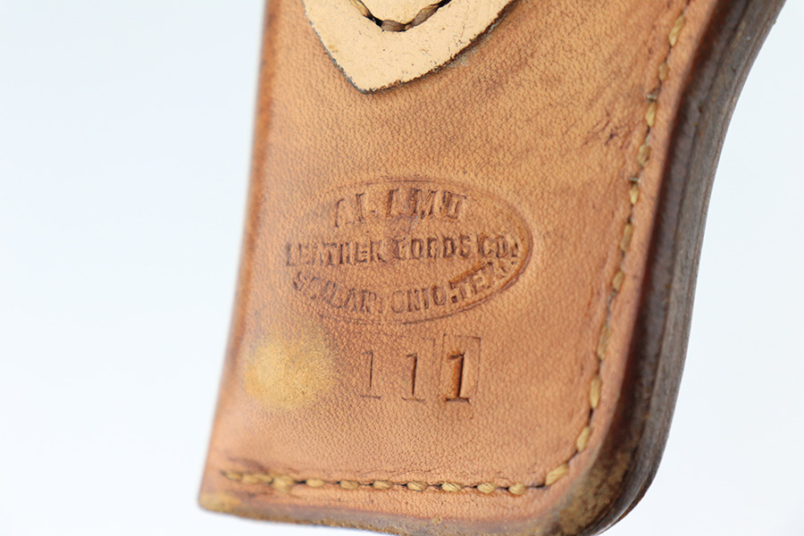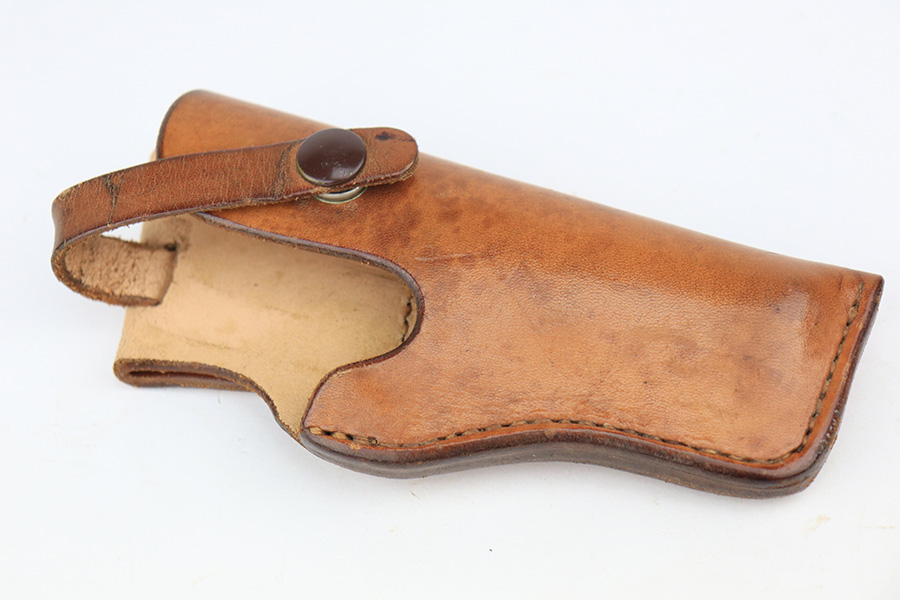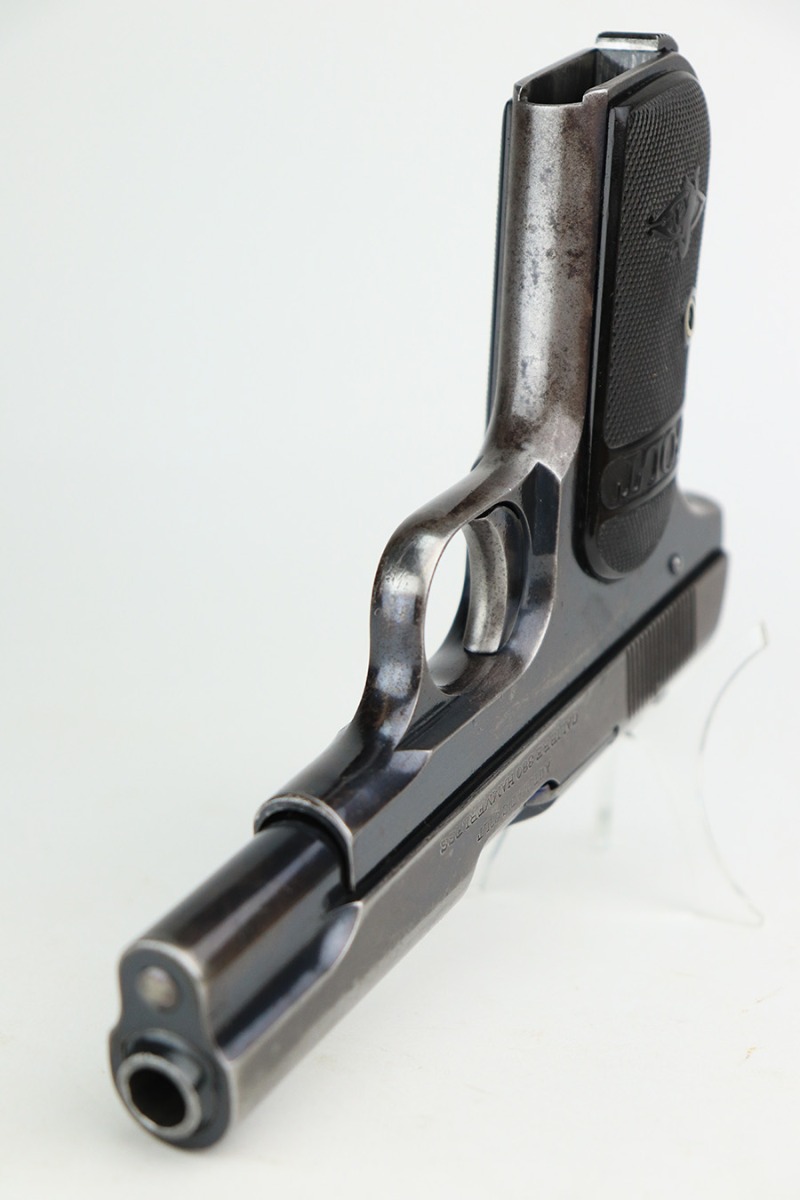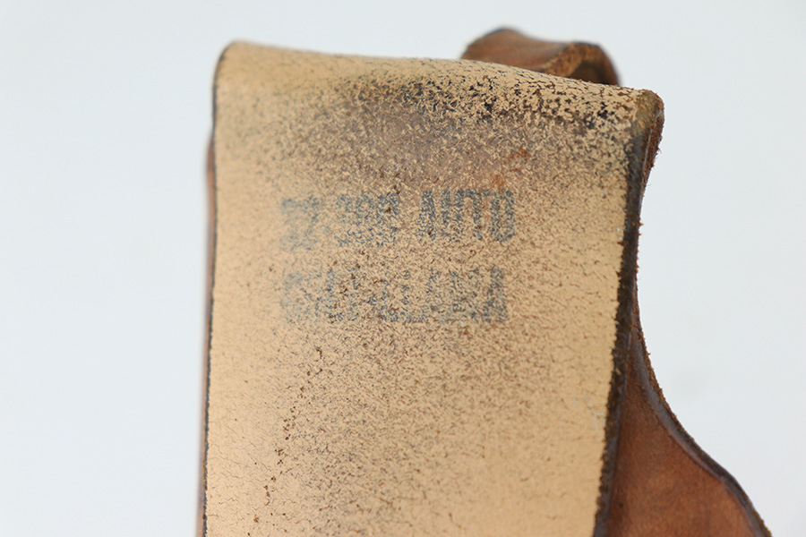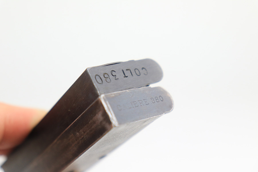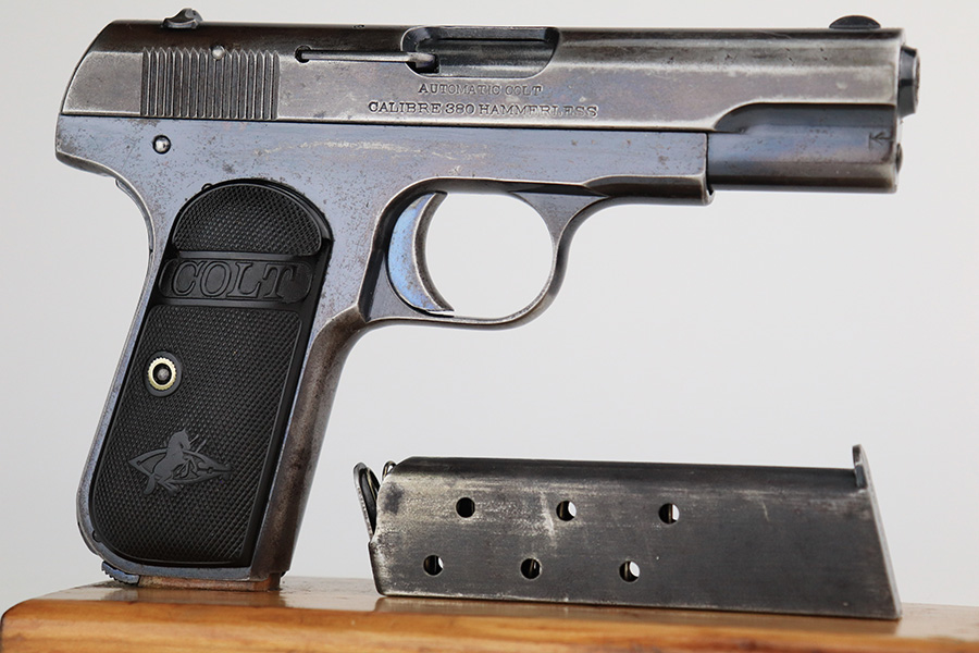 5/12/22 – This is a nice example of a Colt Model 1908 Pocket Hammerless sold in the commercial market in 1913. The gun is all matching and comes as a rig with a nice Alamo Leather Goods Co holster, one period-correct magazine, and one reproduction magazine. The gun itself has retained roughly 35% of its original high polish finish. There is finish loss throughout, most noticeable on the slide and on the grip straps. Spotty wear on both sides of the frame. Spotty oxidation throughout and some areas with tiny pits along the slide. Comes with slightly worn Colt grips. The rifling in the bore is slightly worn with pin-pricking throughout.