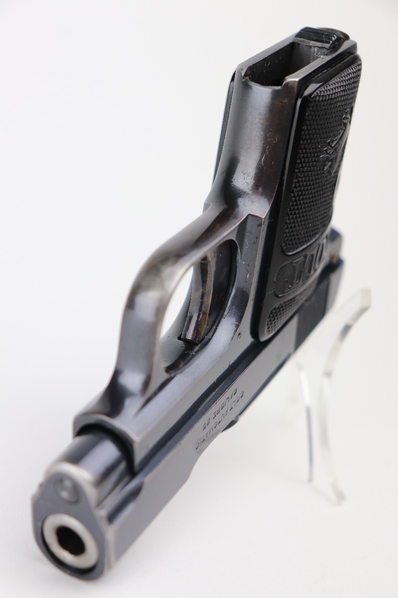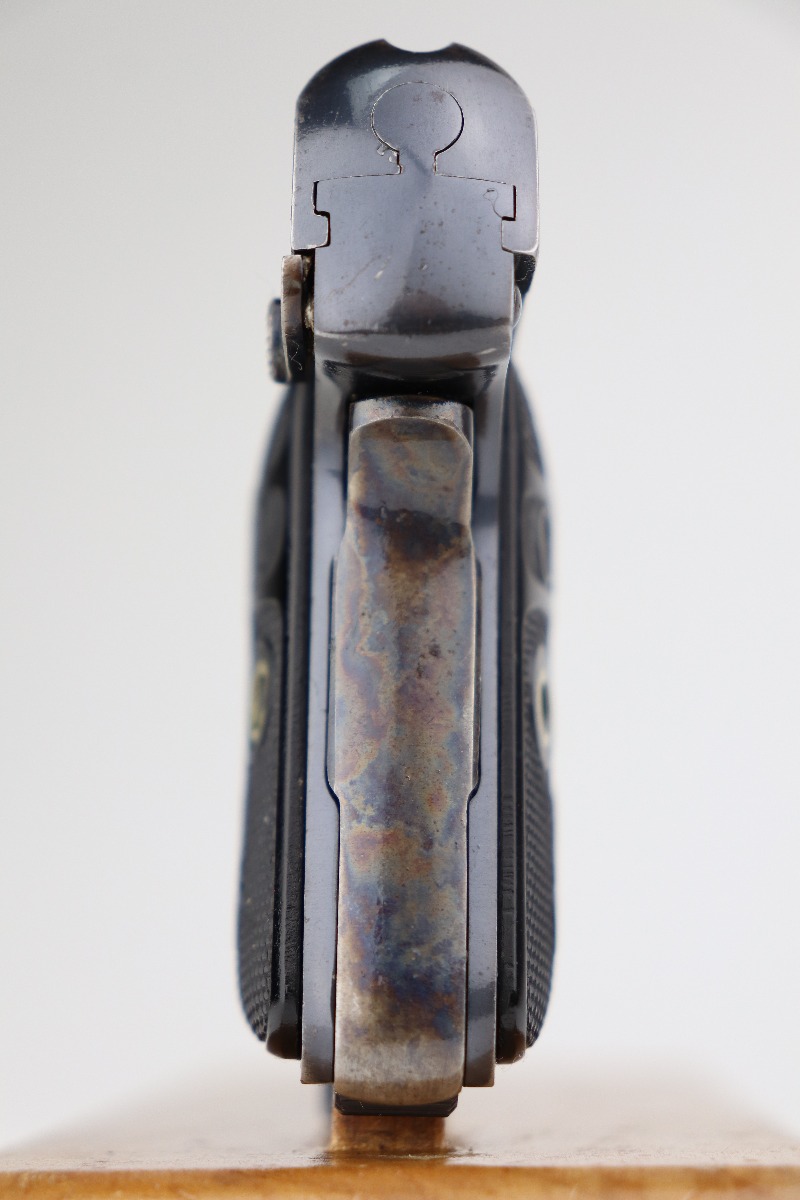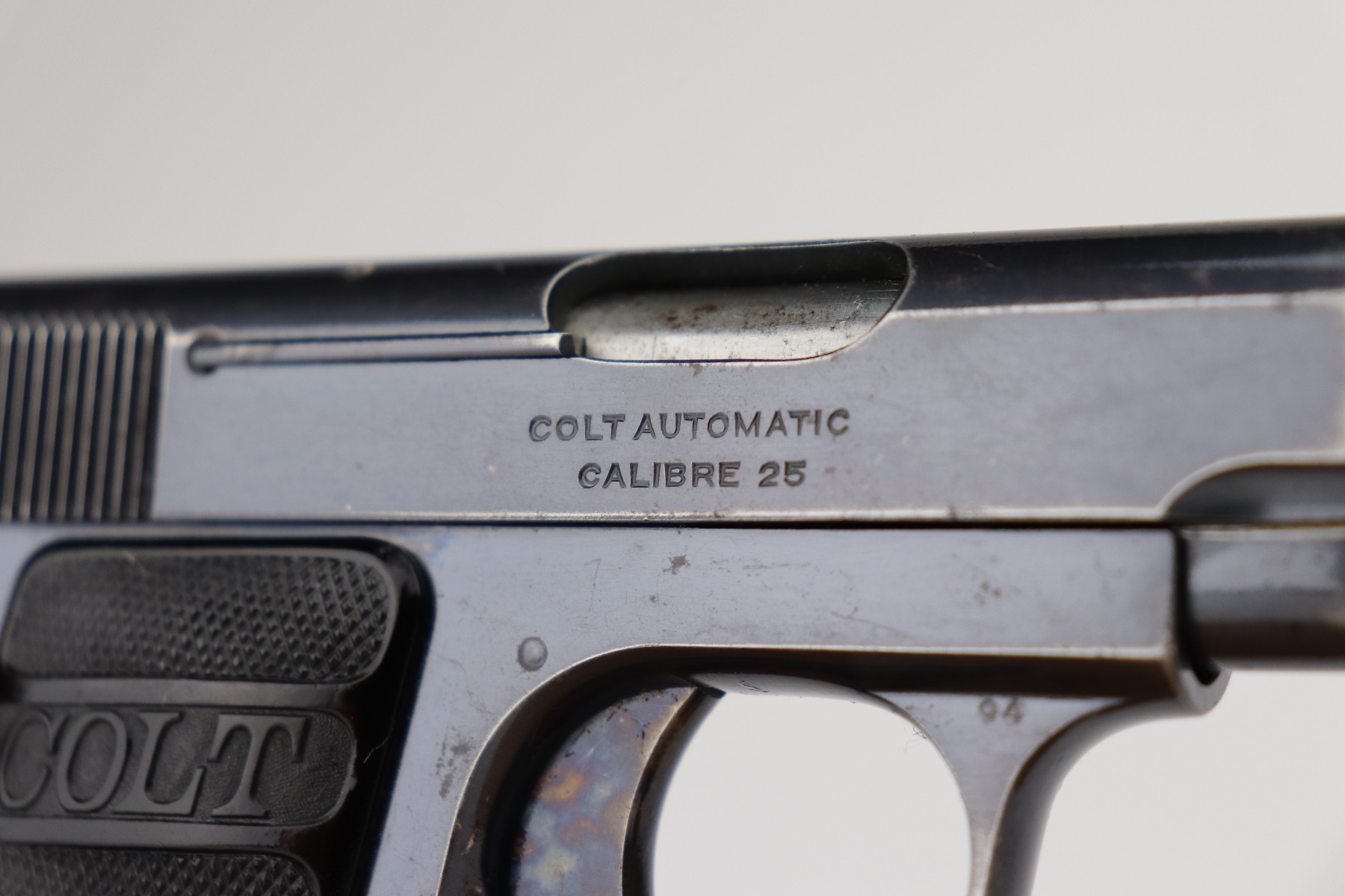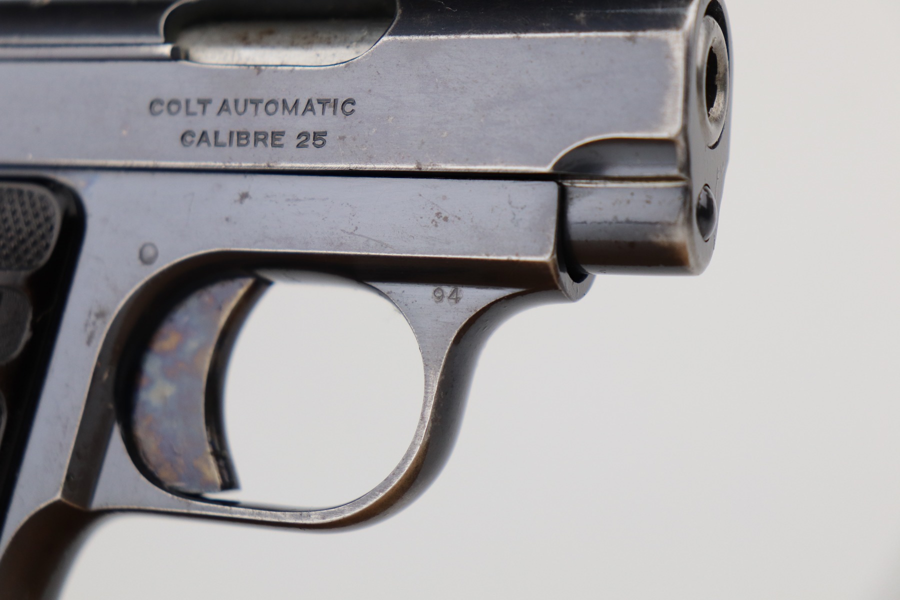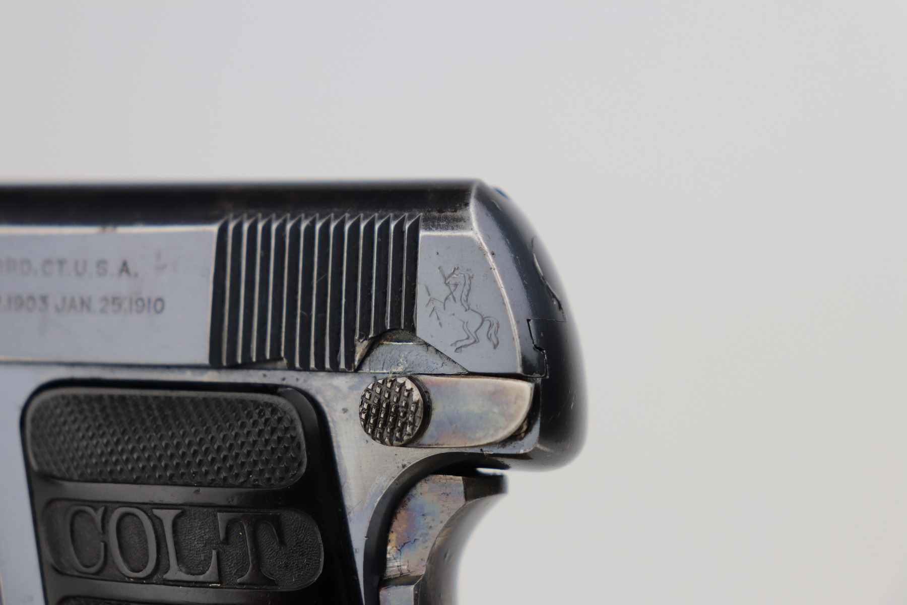 e3/23/21 – This is a very example of a Colt Model 1908 Vest Pocket pistol, manufactured in 1920. It is all correct and has retained about 90% of its original finish. Excellent case-hardening. There is minor wear around the muzzle and high edges of the slide. A more significant area of wear on the left side of the slide. Spotty freckling here and there. Comes with excellent grips and a period-correct magazine. The bore has good rifling with minor fouling.
