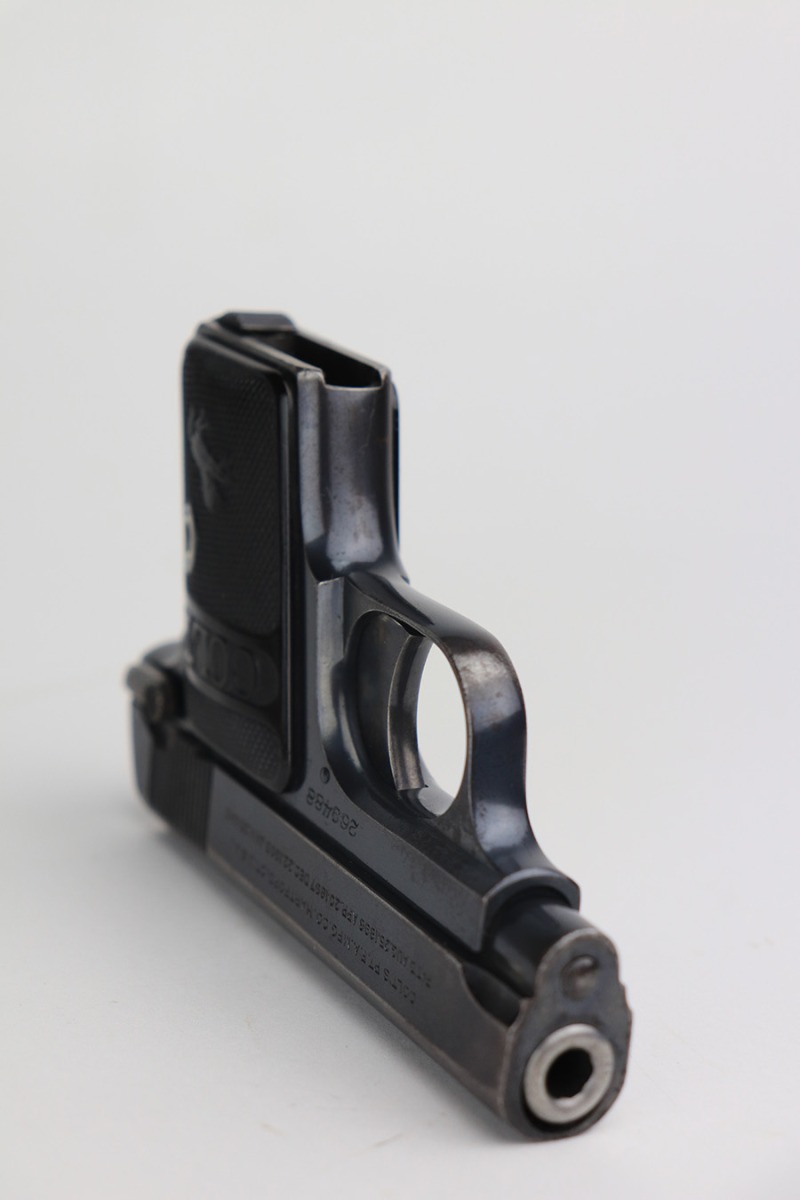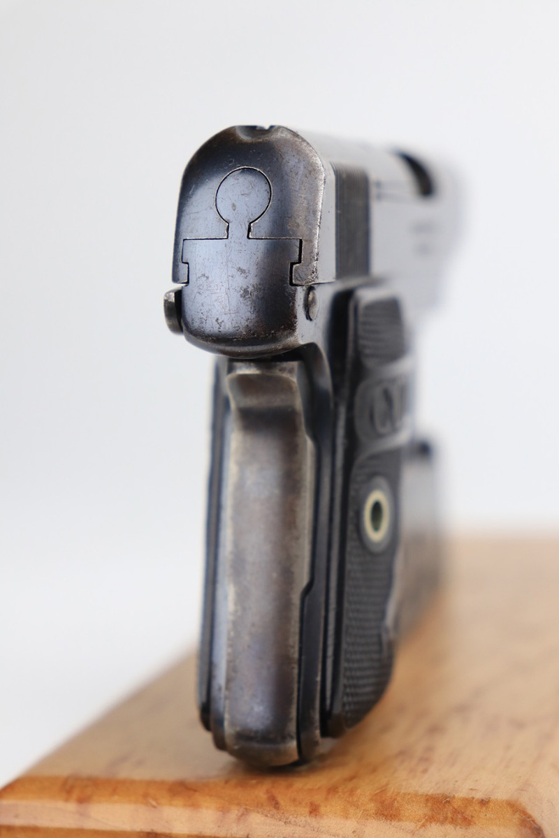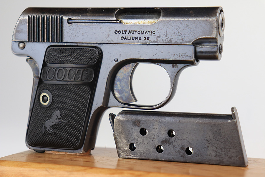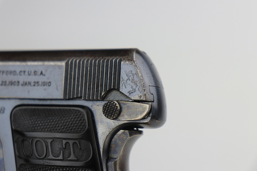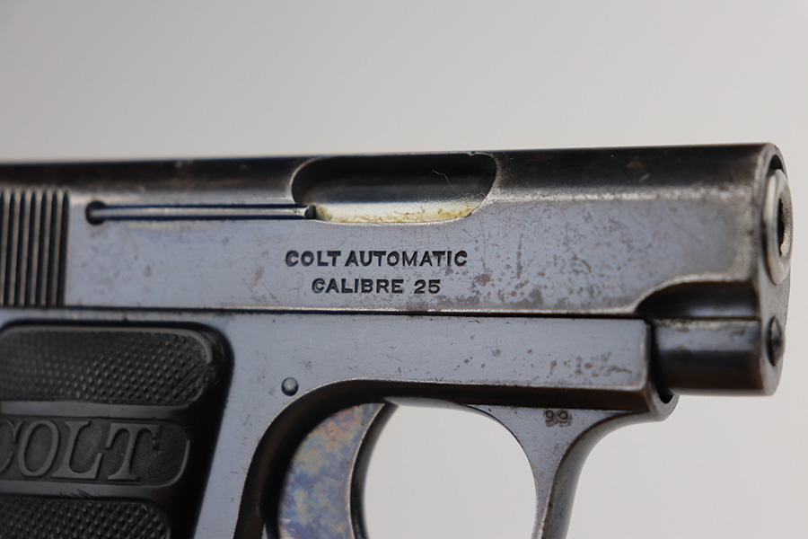 1/27/22 – This is a nice example of a Colt Model 1908 Vest Pocket pistol manufactured in 1920. The gun is all correct and has retained about 90% of its original finish. Most of the wear is concentrated around the high edges of the slide and around the muzzle. Some minor wear around the edges of the rear grip safety and underside of the trigger guard as well. Spotty freckling throughout. The original case-hardening on the trigger is almost completely intact. Comes with an excellent pair of hard rubber Colt grips and one proper magazine. The magazine is poor – the rifling is worn, and there is heavy pitting throughout.