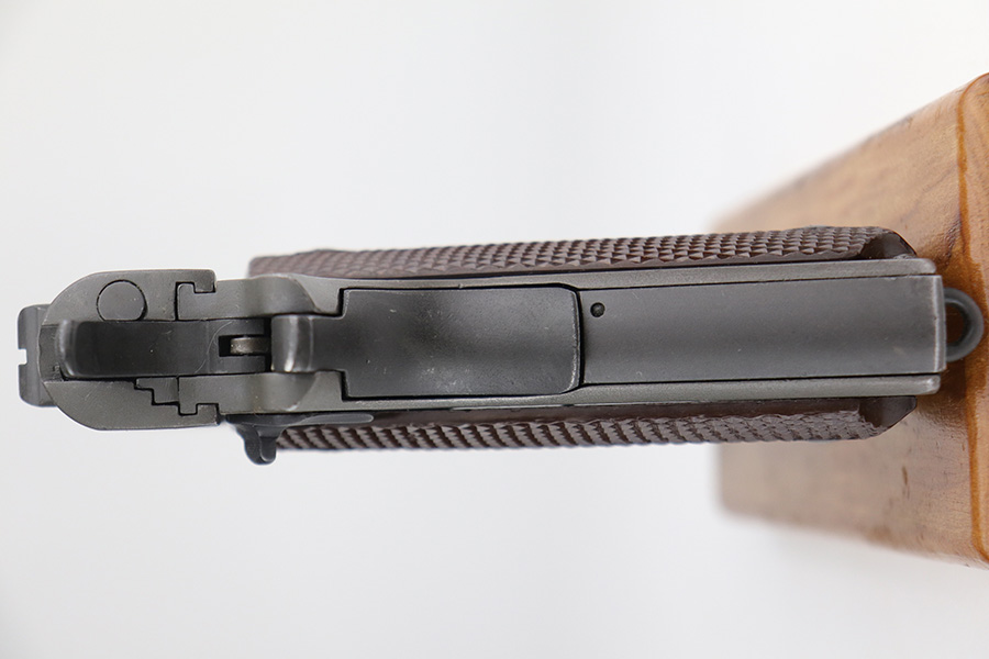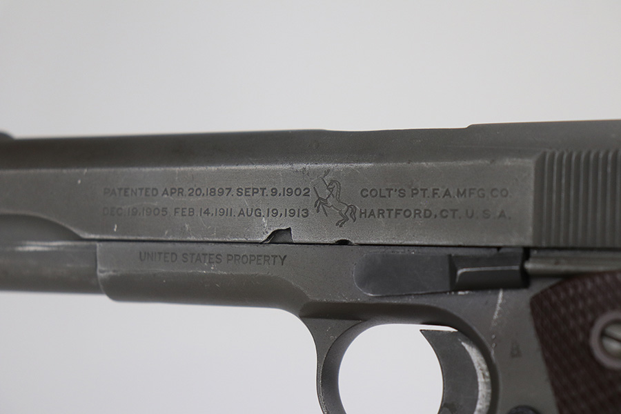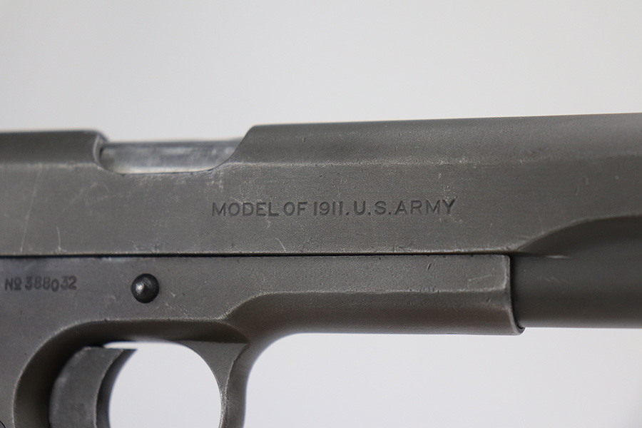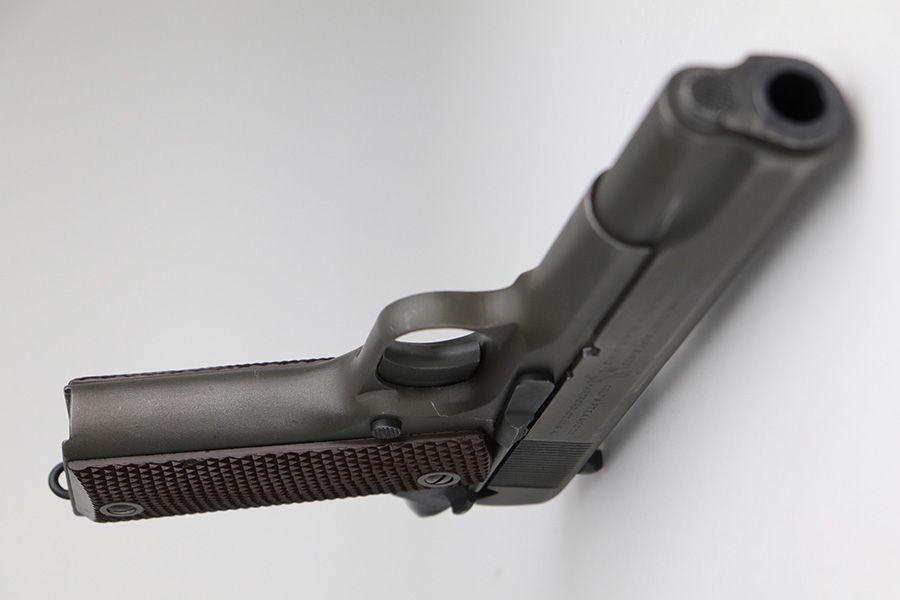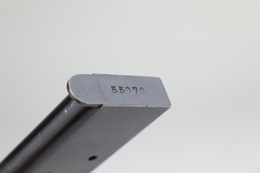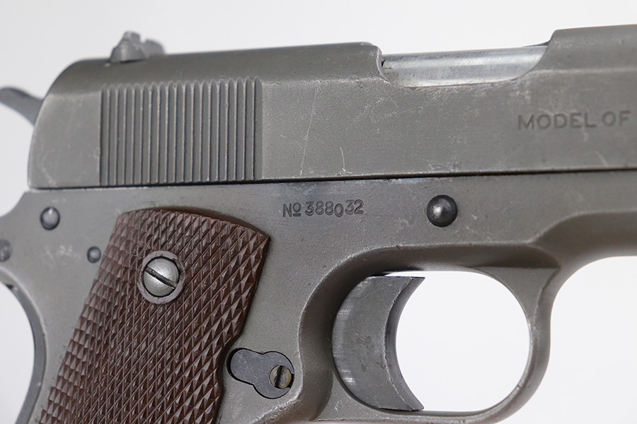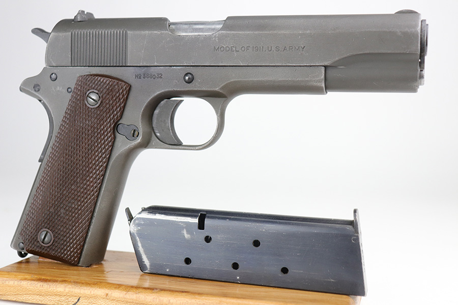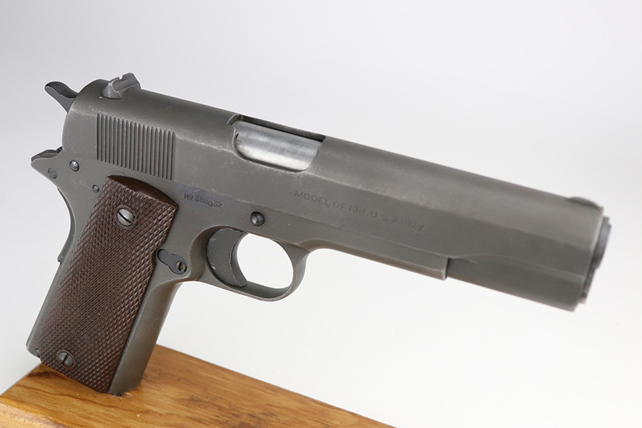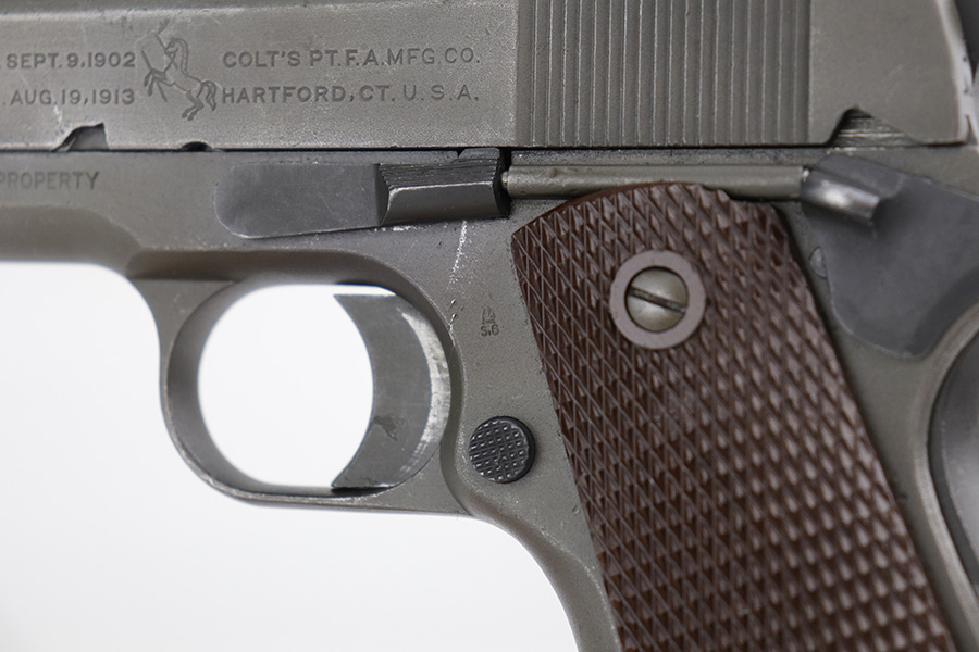 10/22/21 – This is a military-issued Colt 1911 from 1918. Slide and frame are original but the finish was redone at some point after the war and is now parkerized (originally blued). It does not have arsenal re-work proofs though. Comes with WW2-era ‘HS’ barrel with excellent bore. The grips are also WW2-era with sharp checkering and no notable defects. Magazine is post-WW2 and has a serial number on the base.