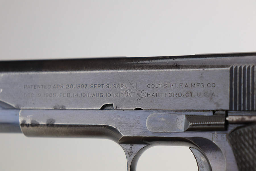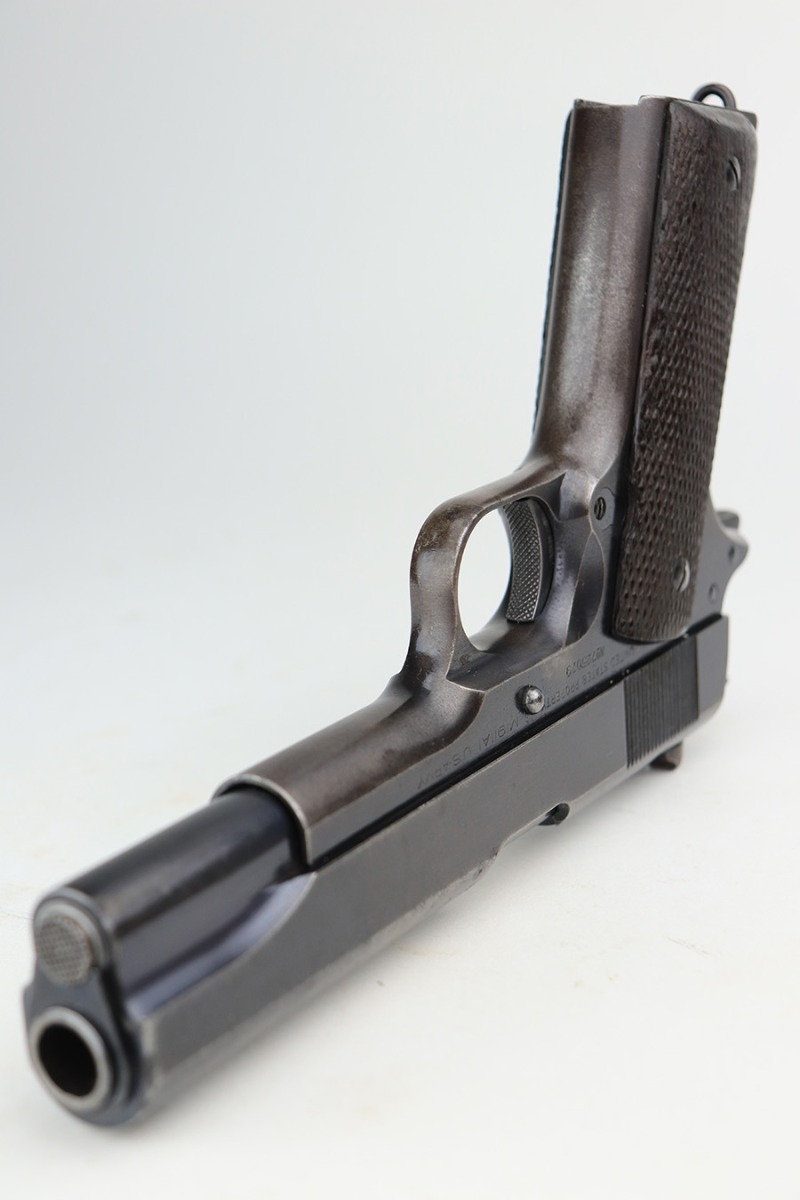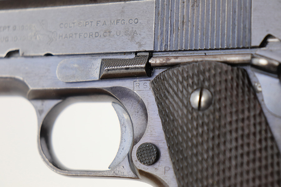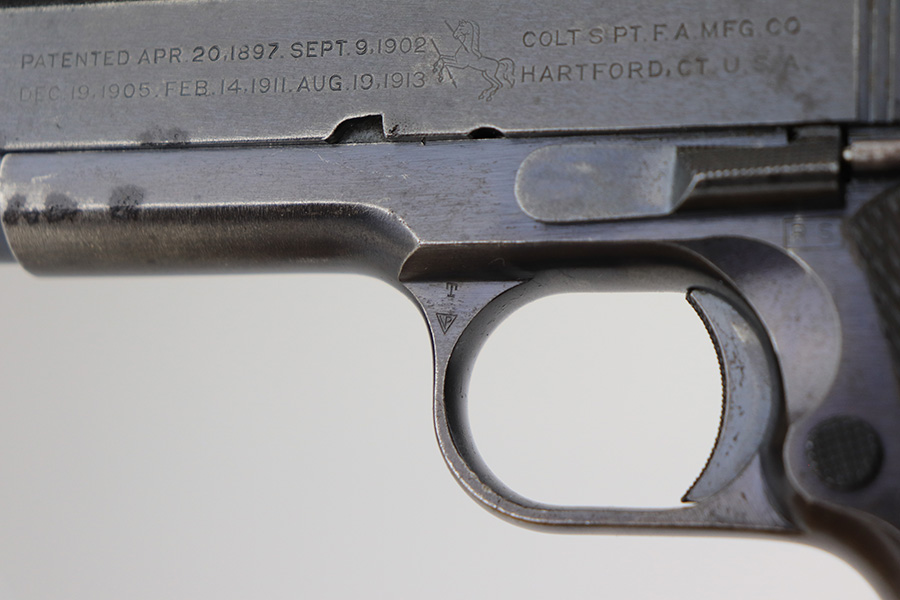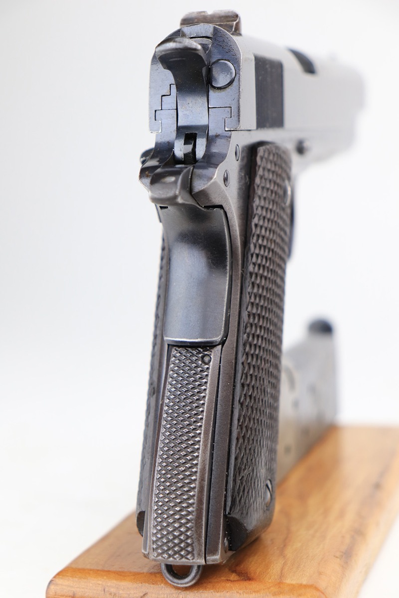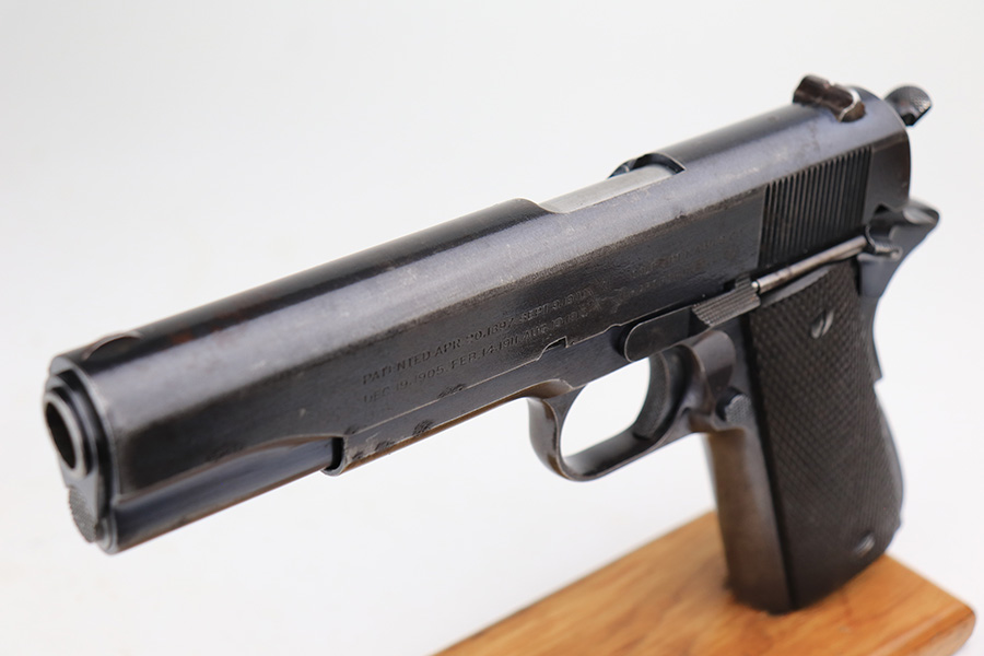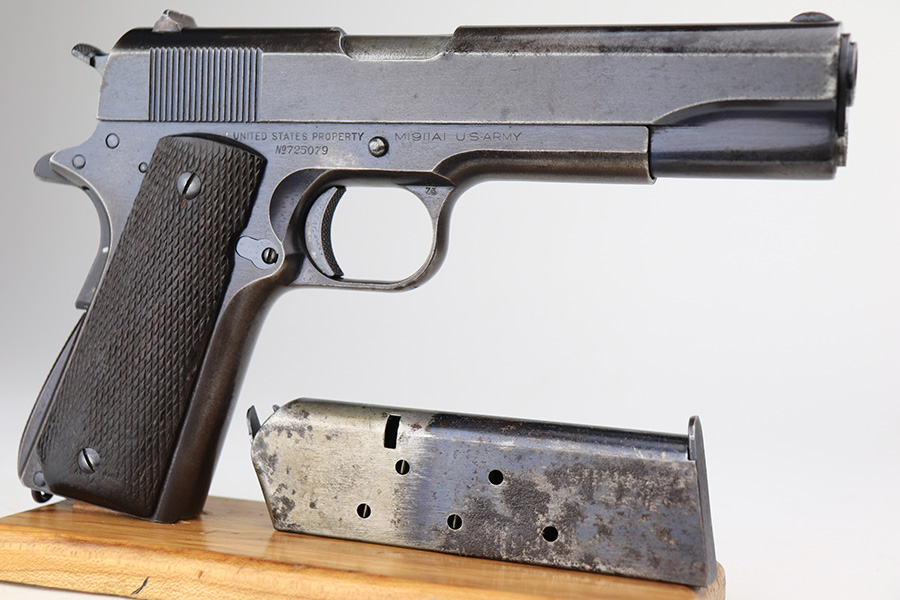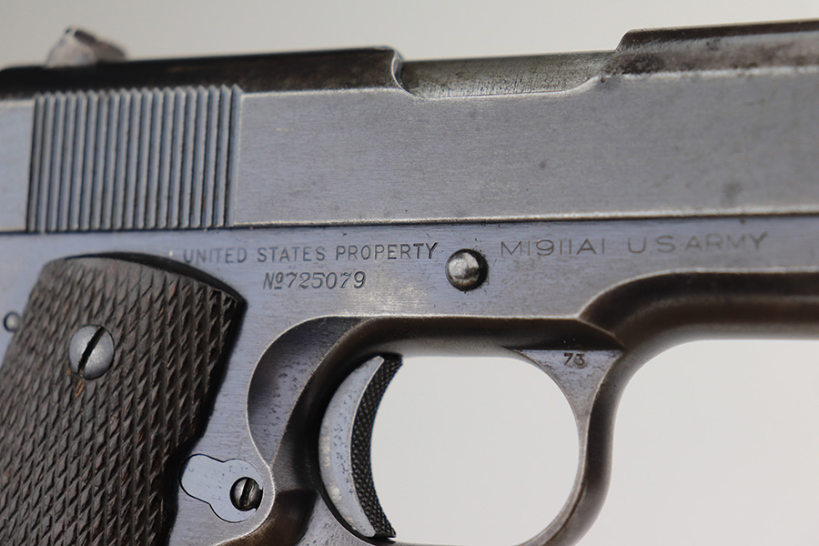 3/2/22 – This is a Colt 1911A1 that was made in 1941 for the US Army. Only ~35,000 produced in 1941, and this is an earlier and more desirable blued example. RS inspector mark on frame with P on slide, barrel and frame. The pistol appears all original as it left the factory, with matching slide and frame. Proper Colt barrel with large ‘G’ under lug. The finish on the pistol is original throughout but shows notable thinning on front strap and at least minor wear/thinning/patina in most areas. Also has a few minor spots of pitting. Bore has good rifling but frost and freckling throughout. Original wood grips with minor handling wear. Original two-tone mag.
