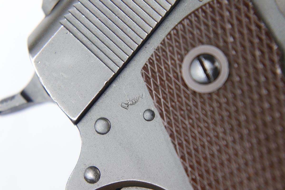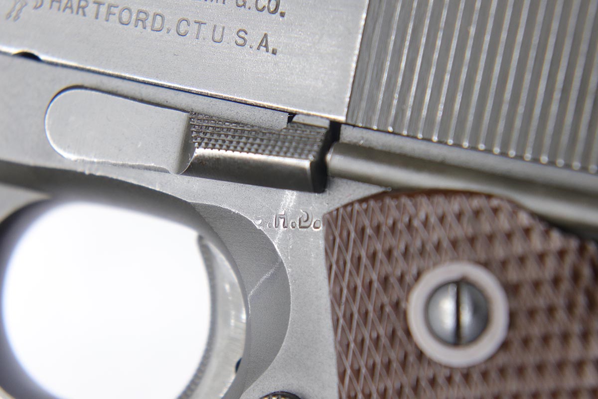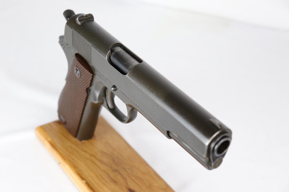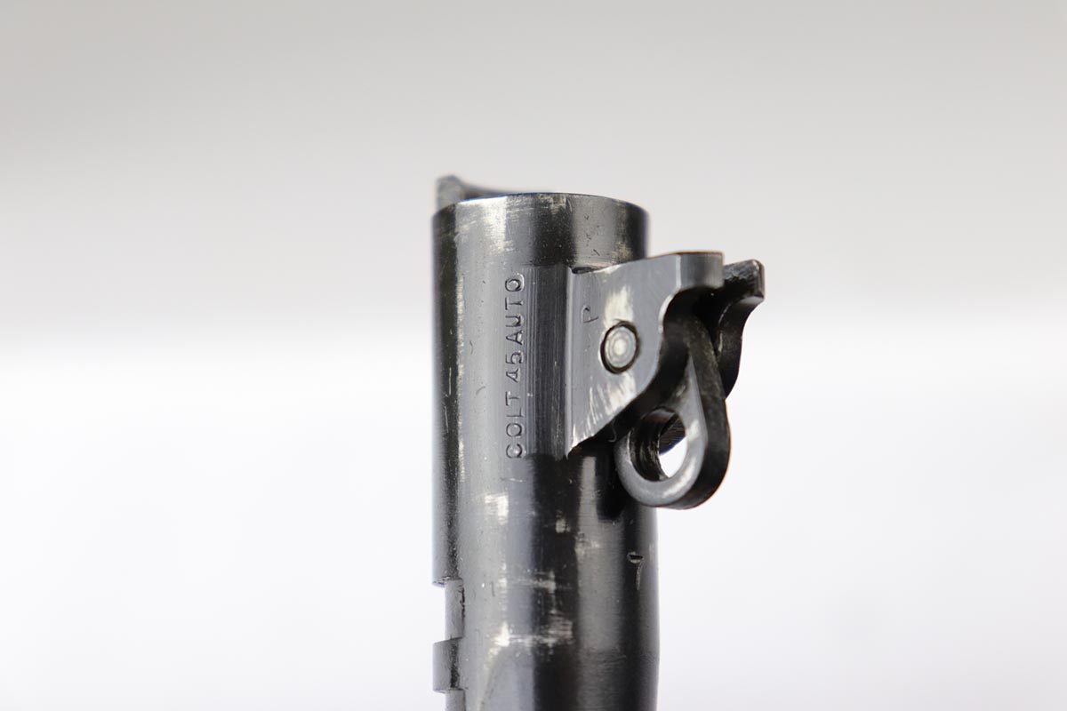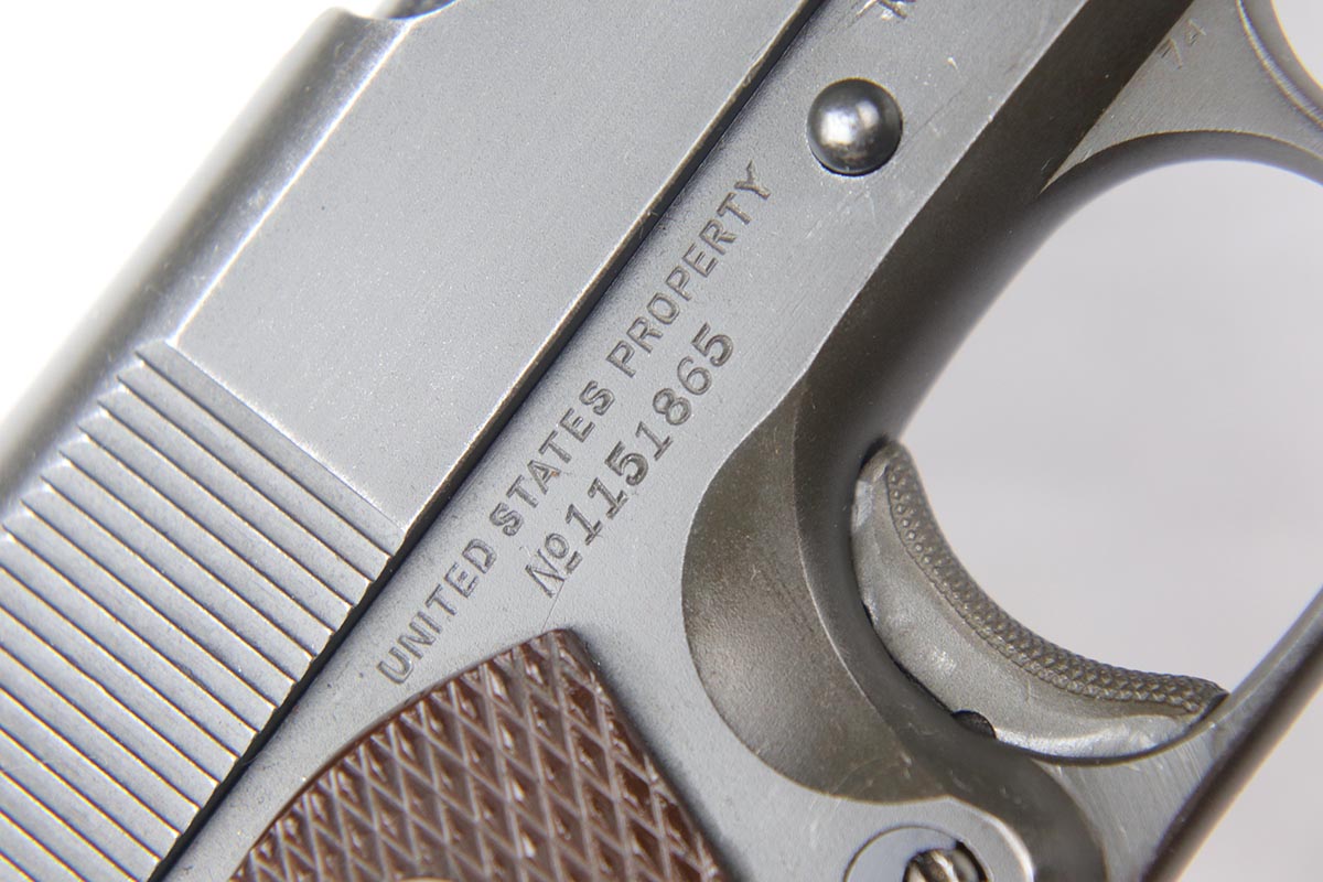 6/27/18 – This is a US Army issued Colt M1911A1 from early in 1944.  The pistol is fully original and correct with about 94-95% original finish.  There is edge and slide wear on the left side, and some finish loss on the underside of the frame.  The right side of the slide also shows some oxidation throughout.  Proper inspectors marks throughout, and proper Colt barrel.  Bore has some freckling in the grooves and shows a fair amount of use.  Excellent grips.  ‘L’ marked mag.