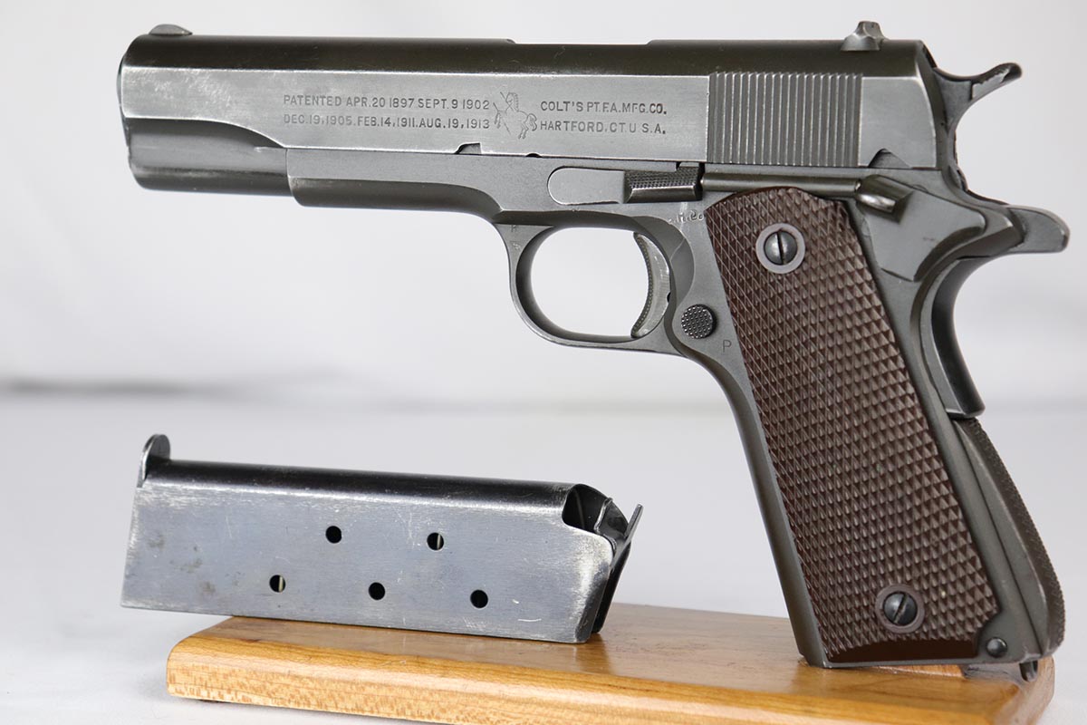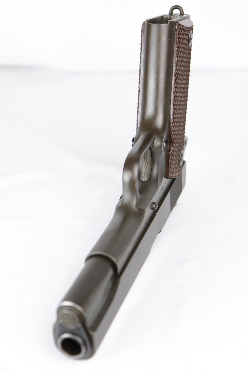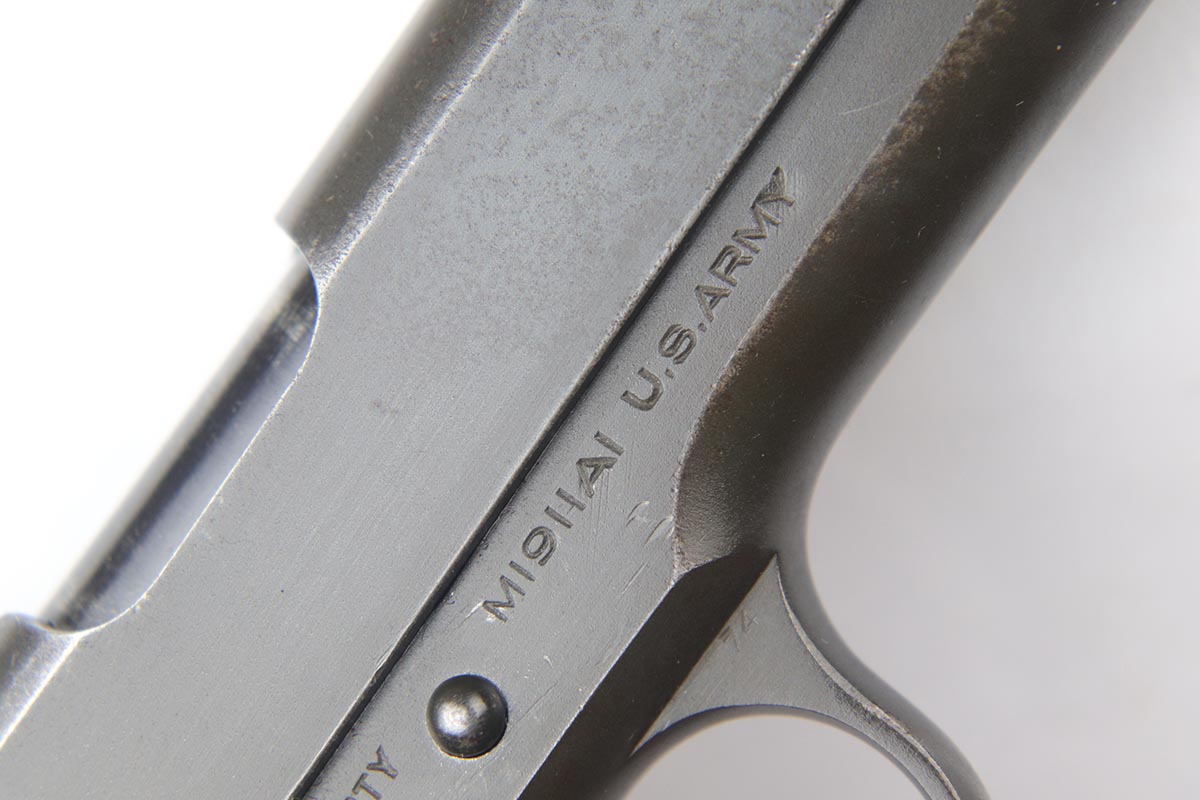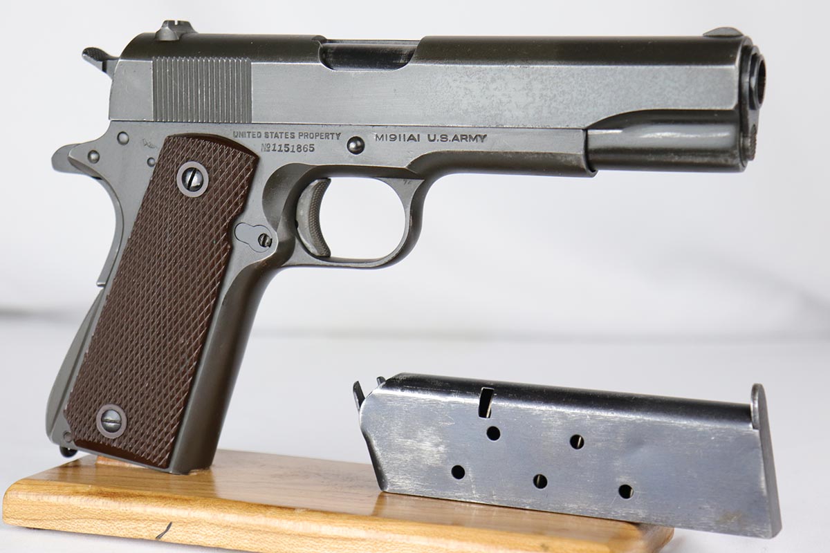 6/27/18 – This is a US Army issued Colt M1911A1 from early in 1944.  The pistol is fully original and correct with about 94-95% original finish.  There is edge and slide wear on the left side, and some finish loss on the underside of the frame.  The right side of the slide also shows some oxidation throughout.  Proper inspectors marks throughout, and proper Colt barrel.  Bore has some freckling in the grooves and shows a fair amount of use.  Excellent grips.  ‘L’ marked mag.