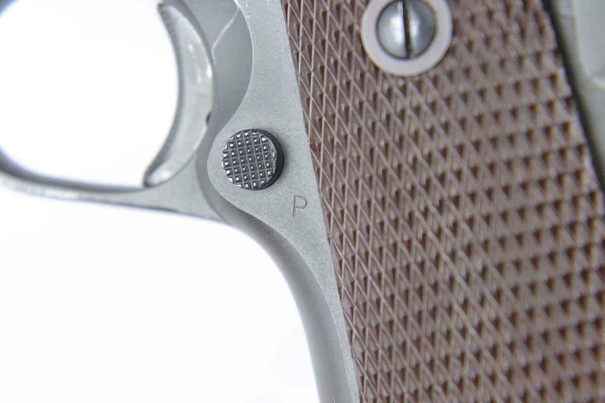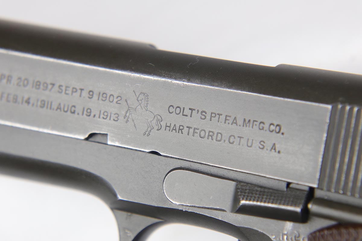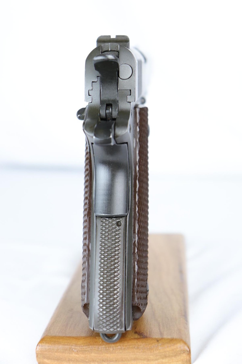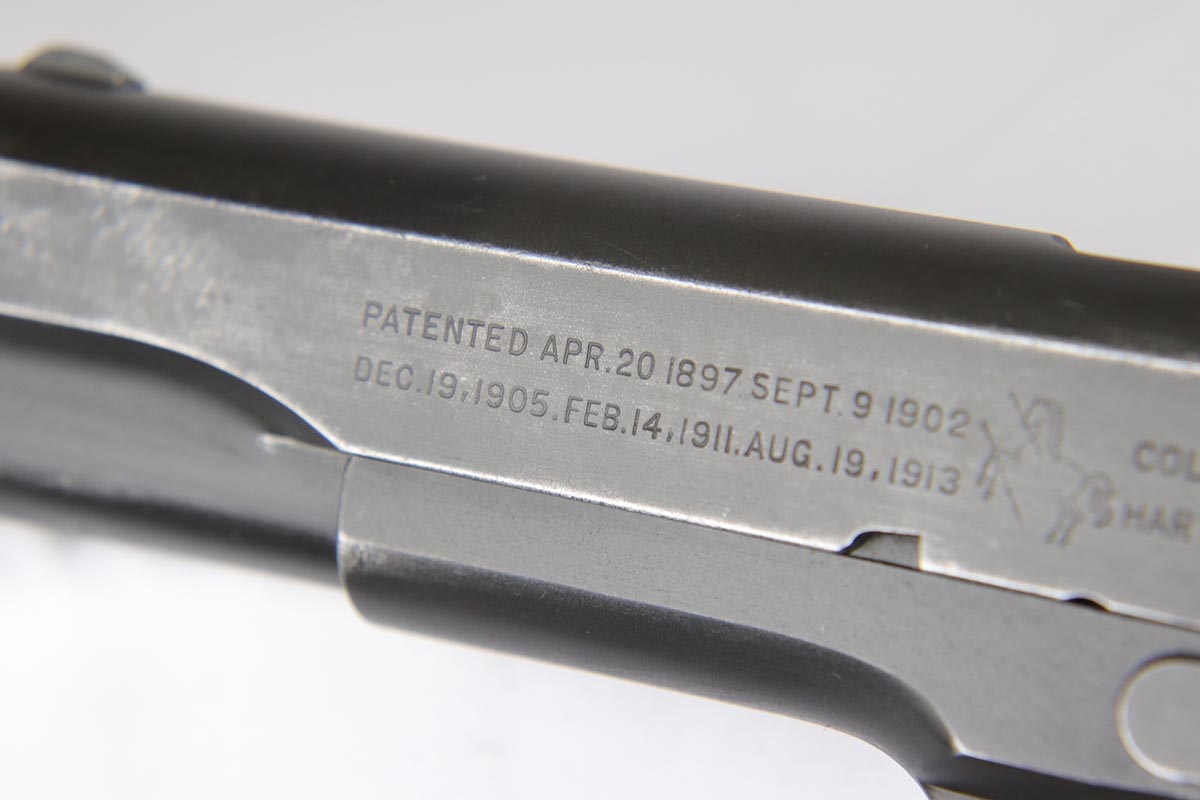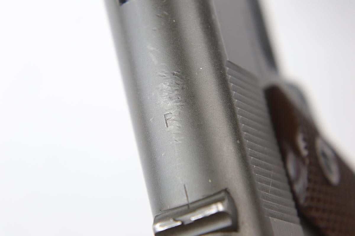 6/27/18 – This is a US Army issued Colt M1911A1 from early in 1944.  The pistol is fully original and correct with about 94-95% original finish.  There is edge and slide wear on the left side, and some finish loss on the underside of the frame.  The right side of the slide also shows some oxidation throughout.  Proper inspectors marks throughout, and proper Colt barrel.  Bore has some freckling in the grooves and shows a fair amount of use.  Excellent grips.  ‘L’ marked mag.