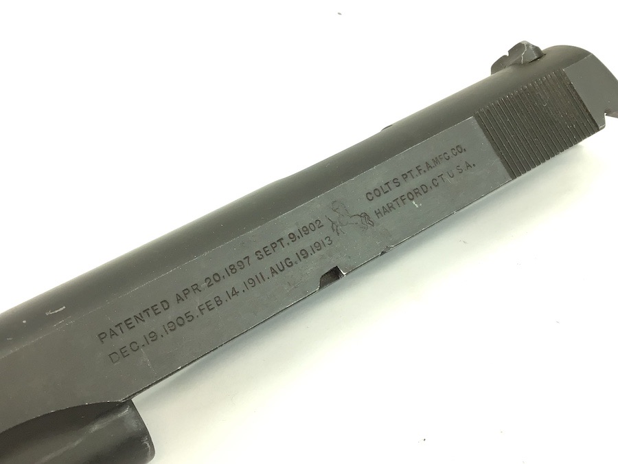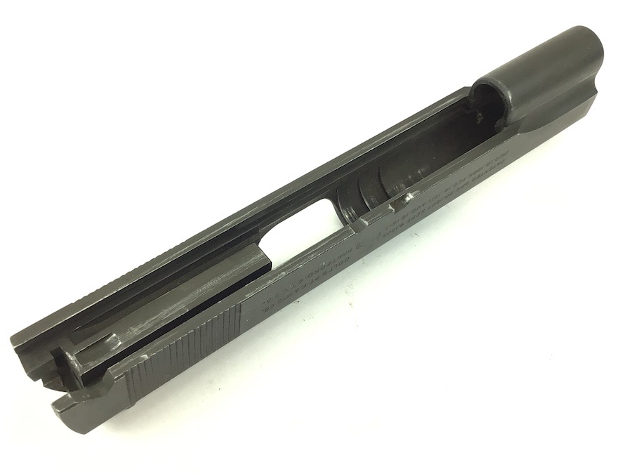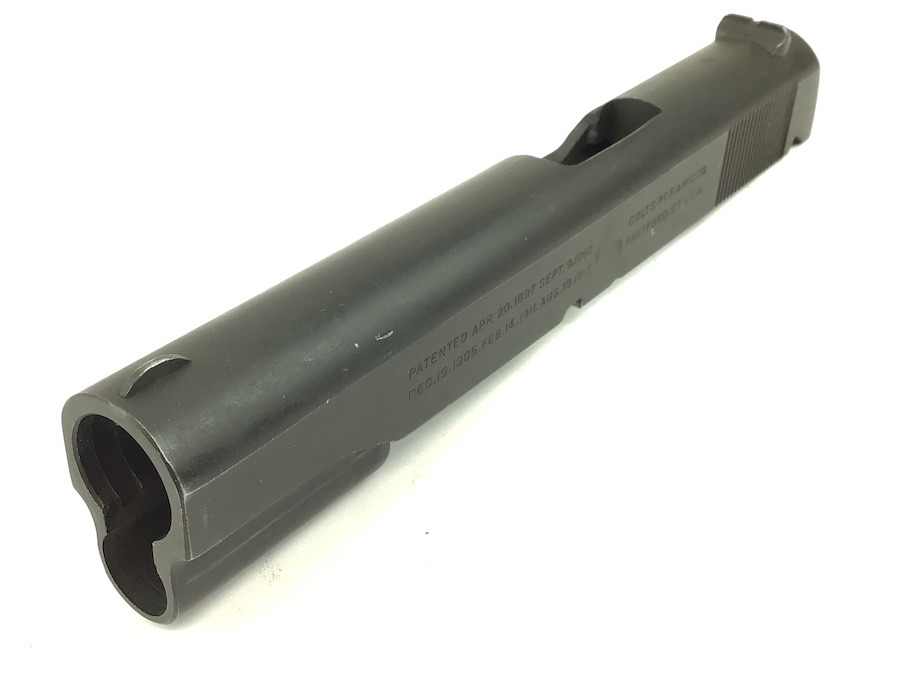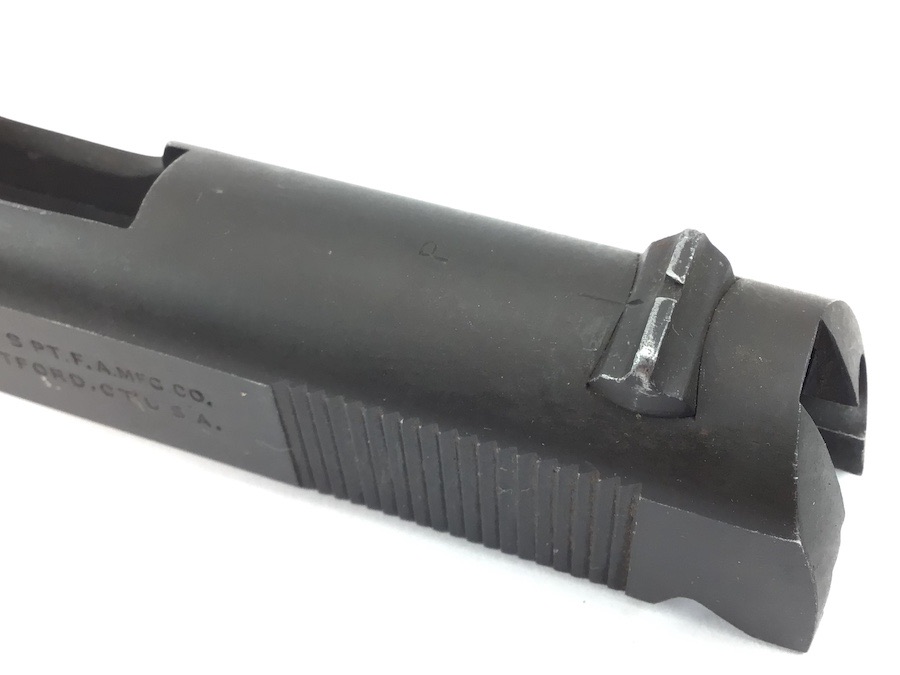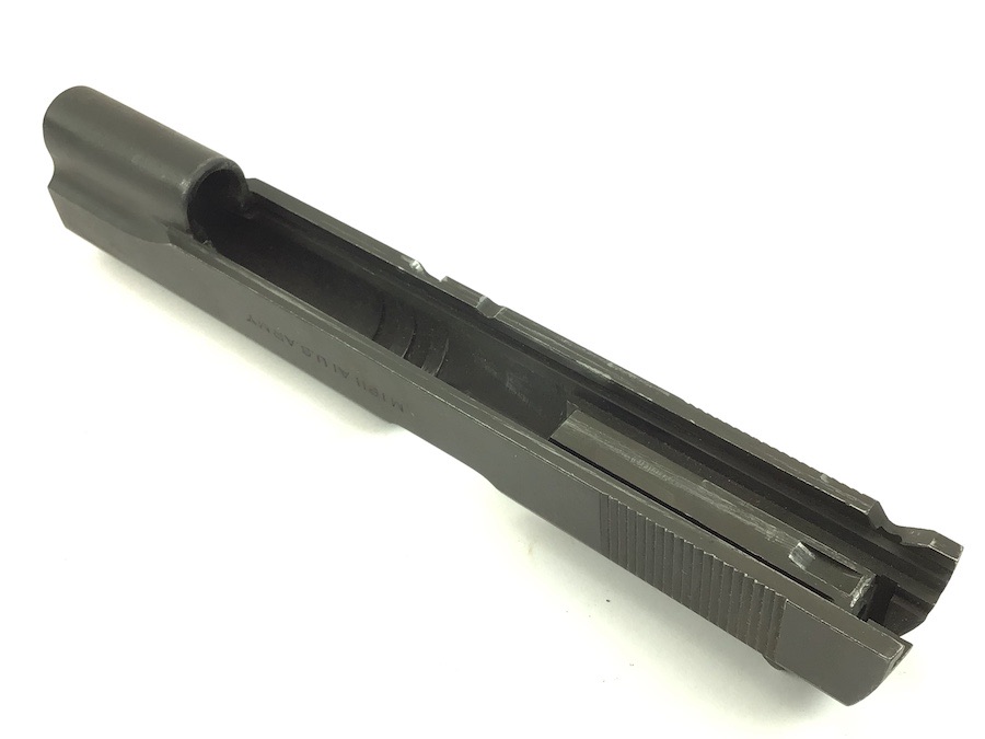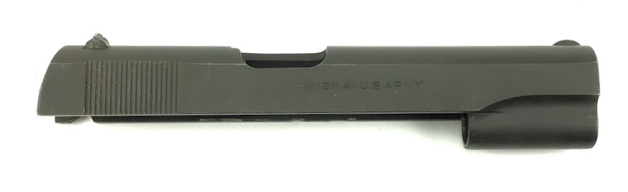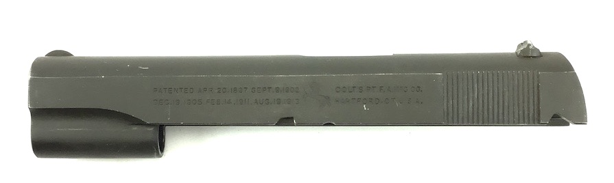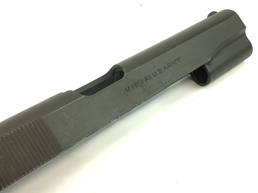 8/5/22 – Original and great condition. Colt M1911A1 US Army Slide. Parkerized finish. Very minor edge wear. The letter “P” stamped on the top in front of the site. Distinct stamps on each side.