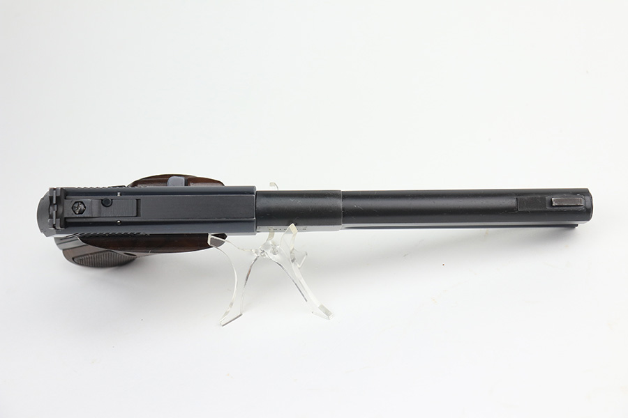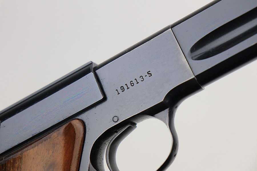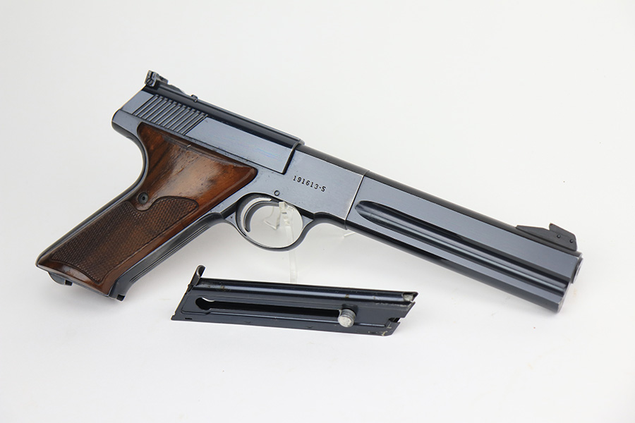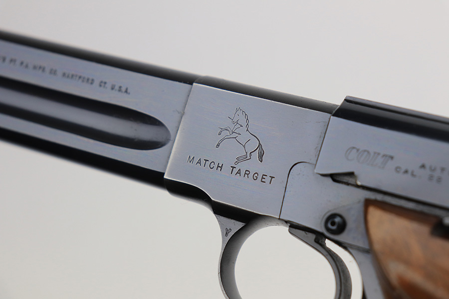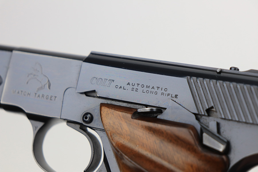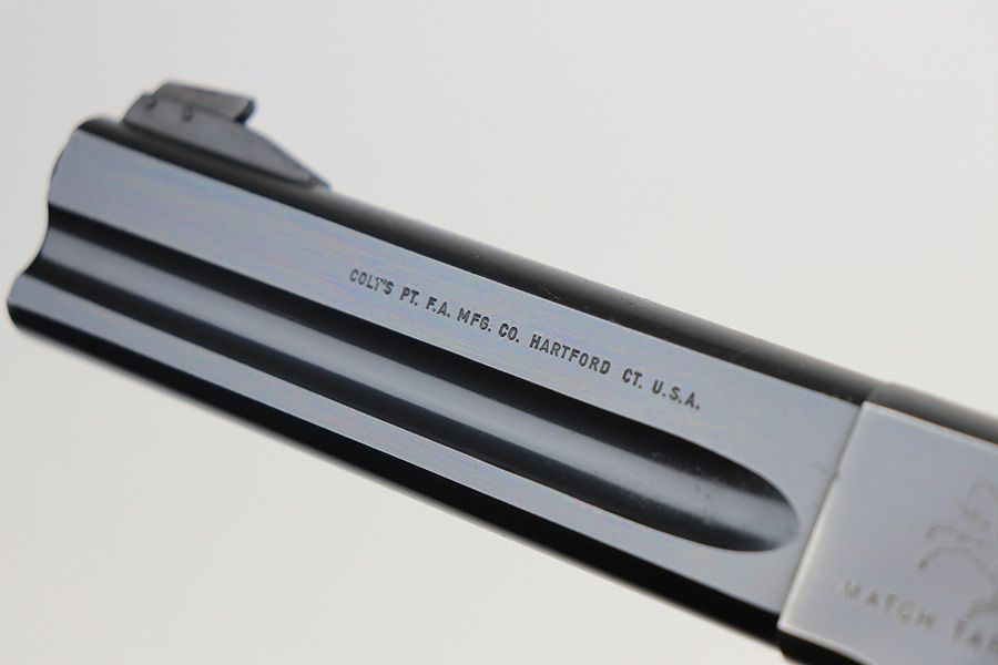 12/17/21 – This is a very nice example of a Colt Match Target pistol, manufactured in 1960. It is fully functional, and the action is very smooth. It has retained about 93% of its original high polish finish. Most of the finish loss is thinning on both grip straps, so the profile views are excellent. There is very minor wear on the high edges of the frame. Comes with excellent wood grips and one proper magazine. The bore is mint.