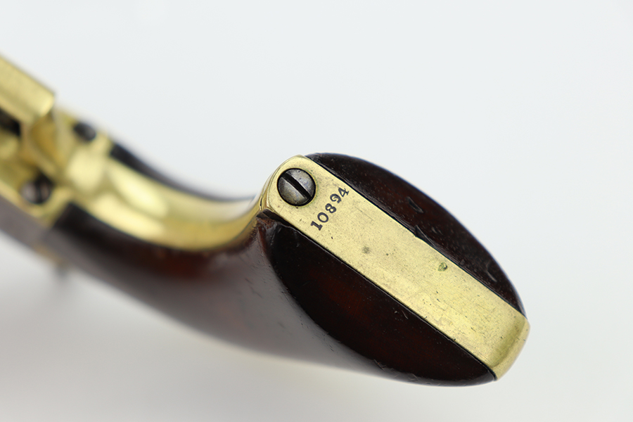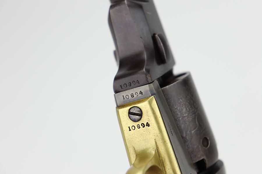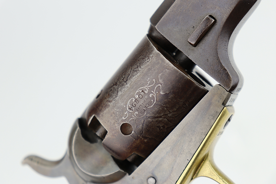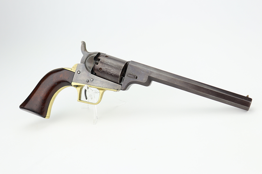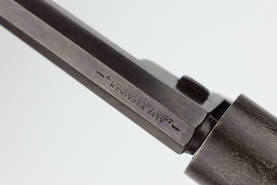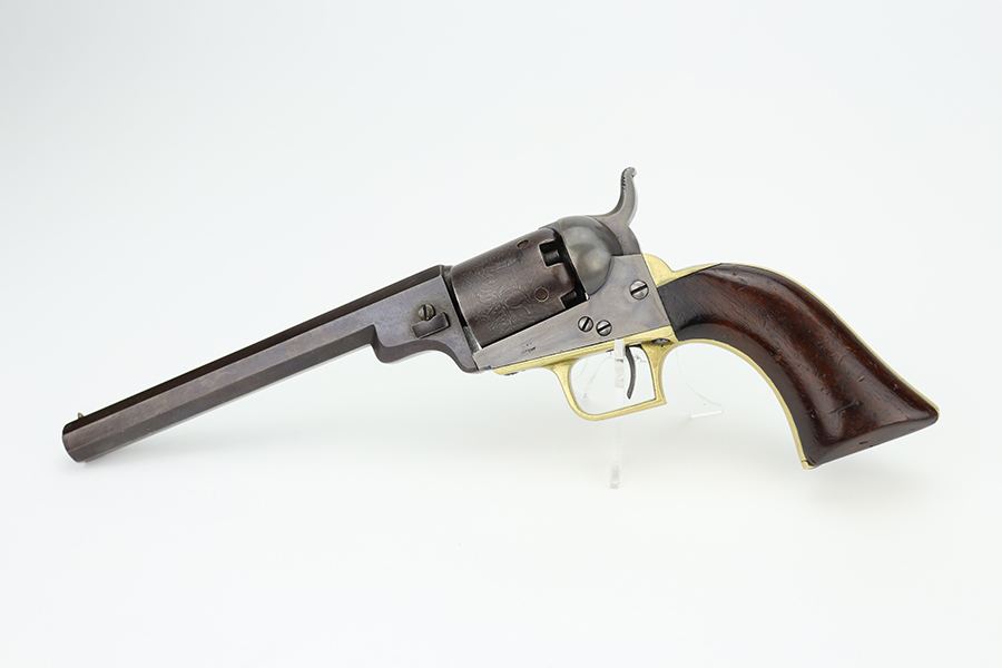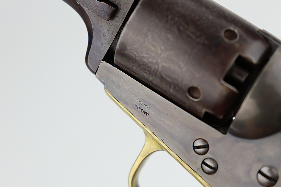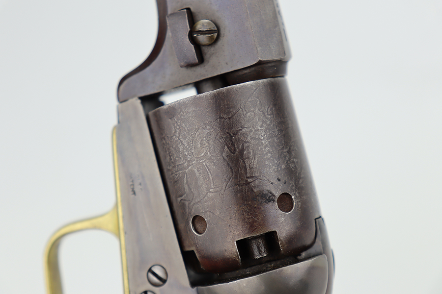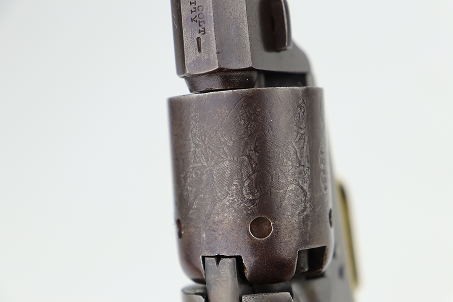6/24/24 – This is a nice example of a Colt Model 1848 Baby Dragoon, manufactured in 1849. Chambered in .31 Caliber with a 6 inch barrel. This revolver has the scarce and desirable early features that include: small square trigger guard, cylinder with rounded stops and the roll-engraved Ranger and Indian scene. The barrel lug has no provision for a loading lever. It is all matching and in nice condition for its age. The barrel and cylinder show honest “attic patina”. Some case-hardening still visible on the frame. Period-correct wood grips – very minor bruising. The bore has good rifling, but there is light surface rust throughout. Fully functional. No FFL required.