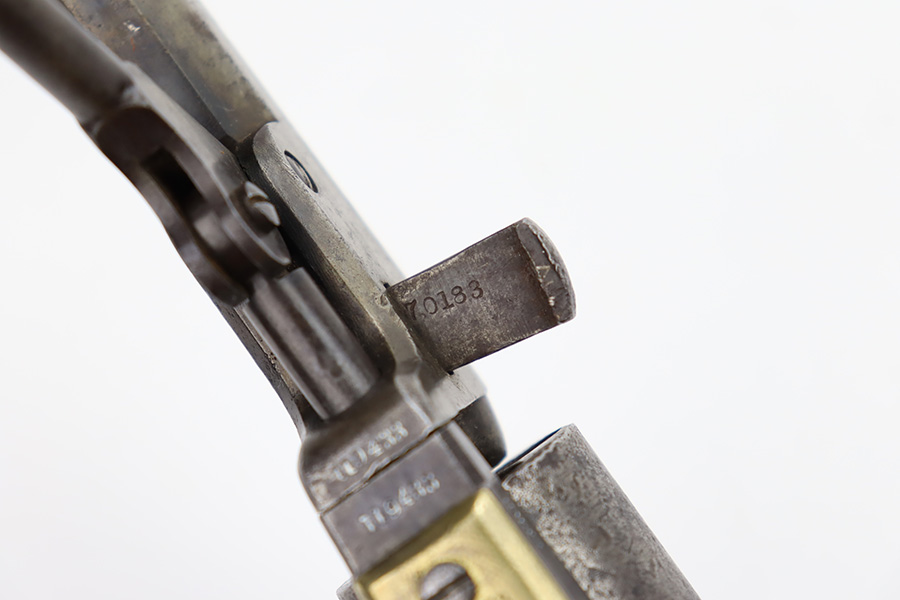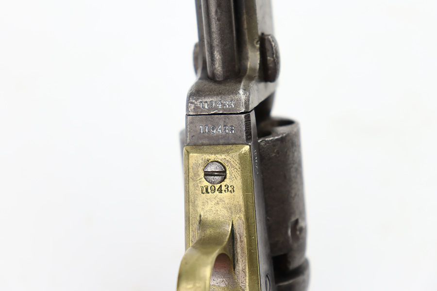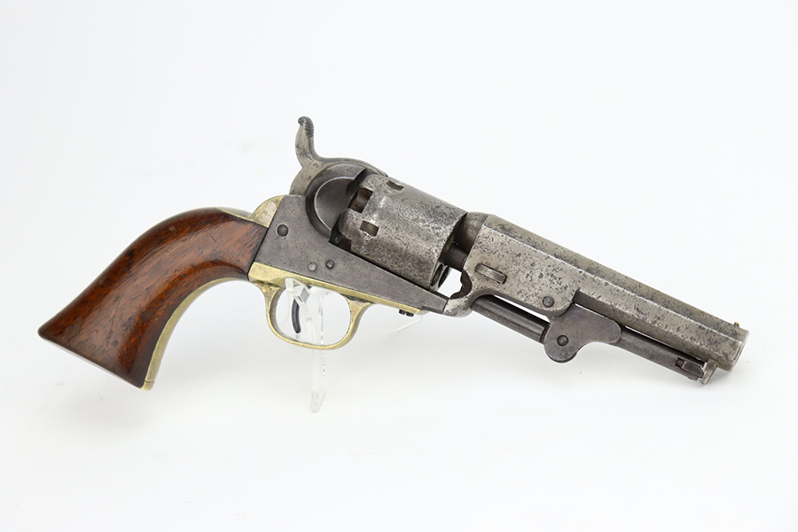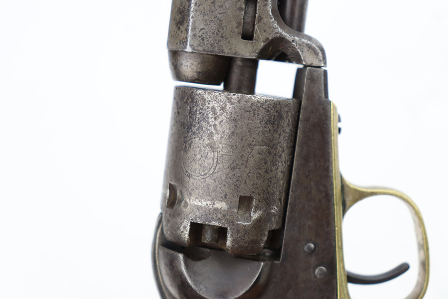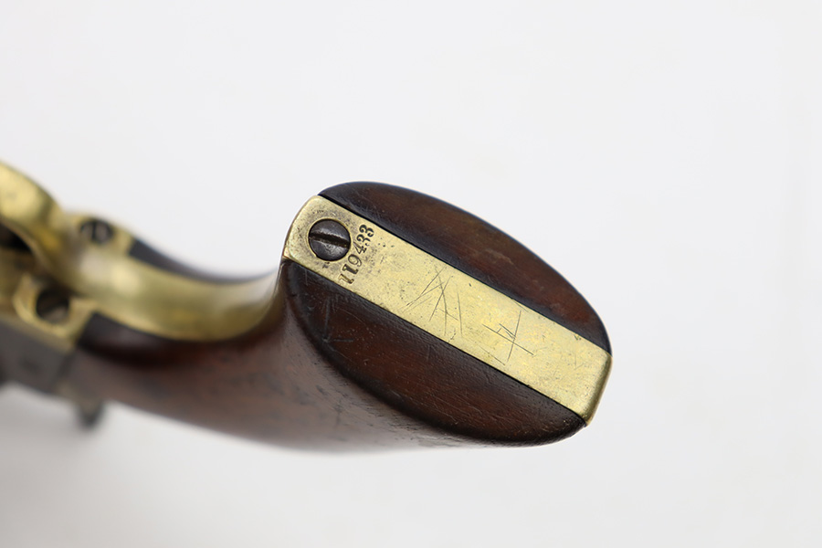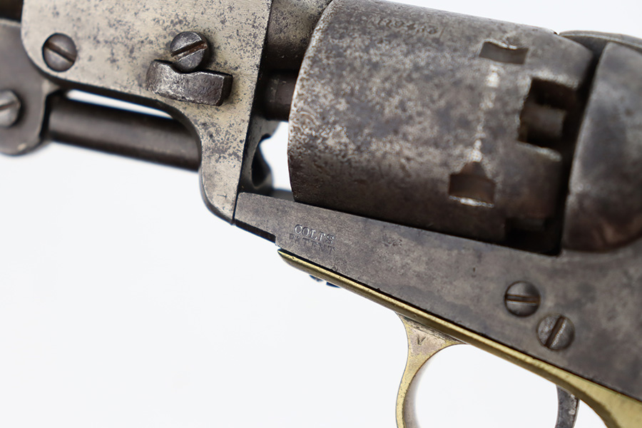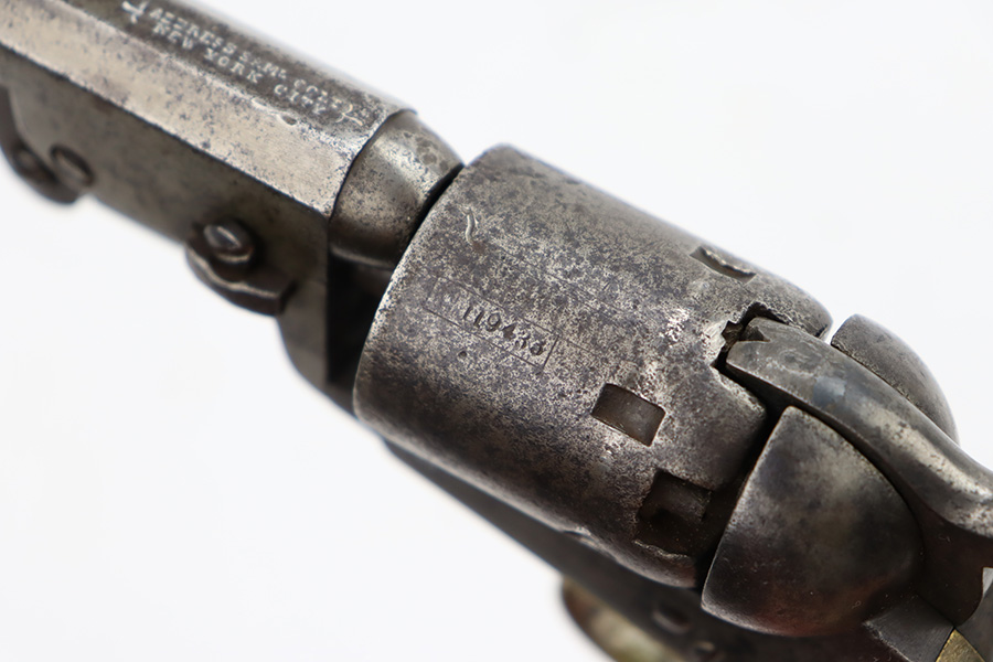 12/11/23 – This is a Colt Model 1849 Pocket Revolver from 1856. Chambered in .31 Caliber with octagonal barrel. The gun is almost entirely matching, except for the barrel wedge – which fits very loosely in the gun. The stagecoach scene on the cylinder is barely visible in a few areas but mostly worn. The gun has no remaining finish with “attic patina”, spotty oxidation, and pitting throughout. Some scratches on the butt of the brass frame. Very nice wood grips. The bore has good rifling, but there is light spotty oxidation throughout. Fully functional.