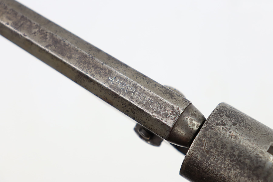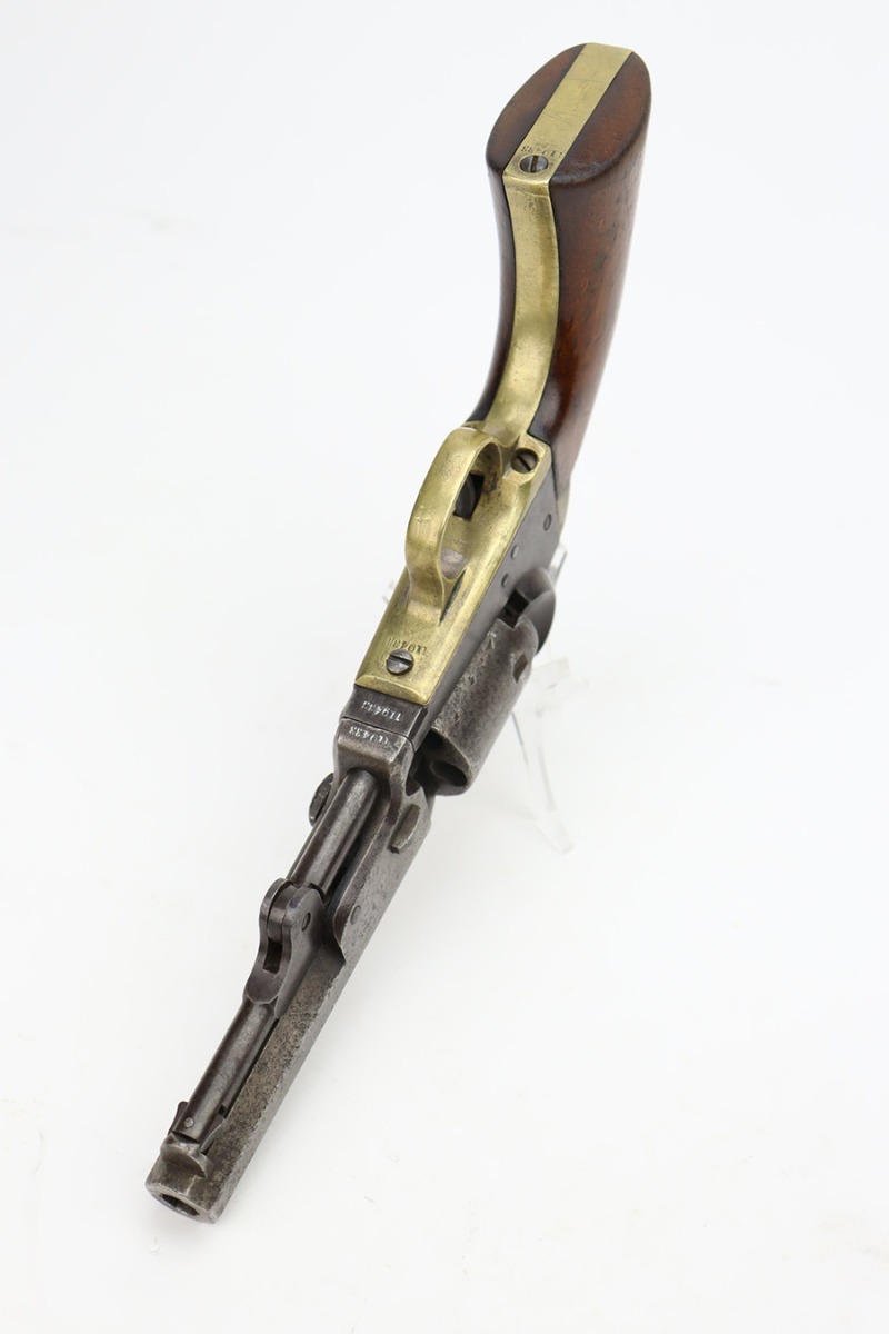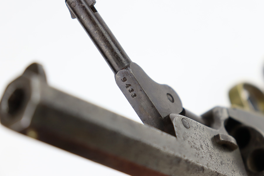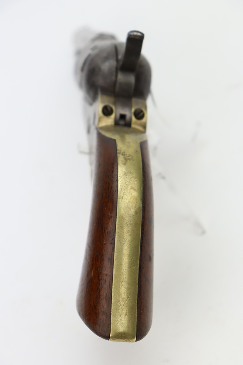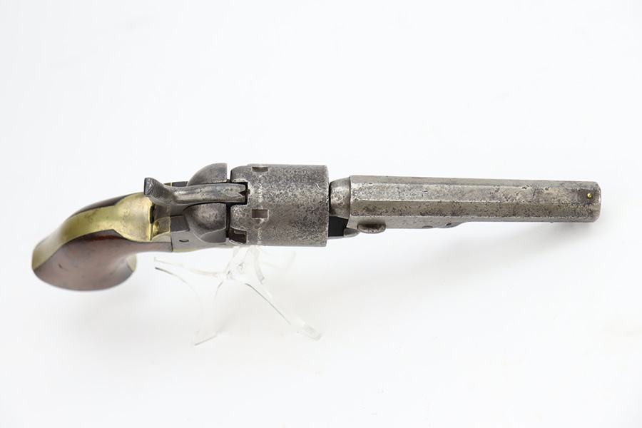 12/11/23 – This is a Colt Model 1849 Pocket Revolver from 1856. Chambered in .31 Caliber with octagonal barrel. The gun is almost entirely matching, except for the barrel wedge – which fits very loosely in the gun. The stagecoach scene on the cylinder is barely visible in a few areas but mostly worn. The gun has no remaining finish with “attic patina”, spotty oxidation, and pitting throughout. Some scratches on the butt of the brass frame. Very nice wood grips. The bore has good rifling, but there is light spotty oxidation throughout. Fully functional.