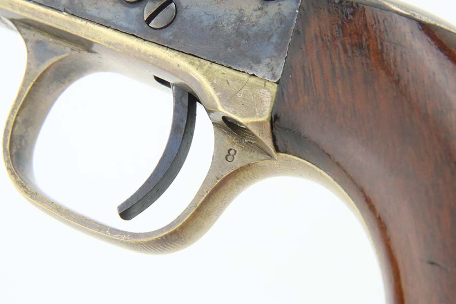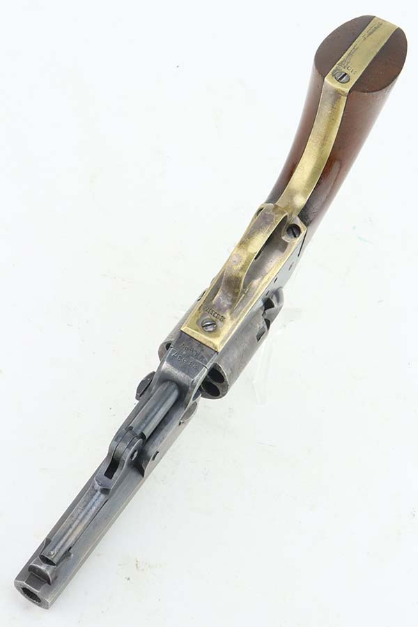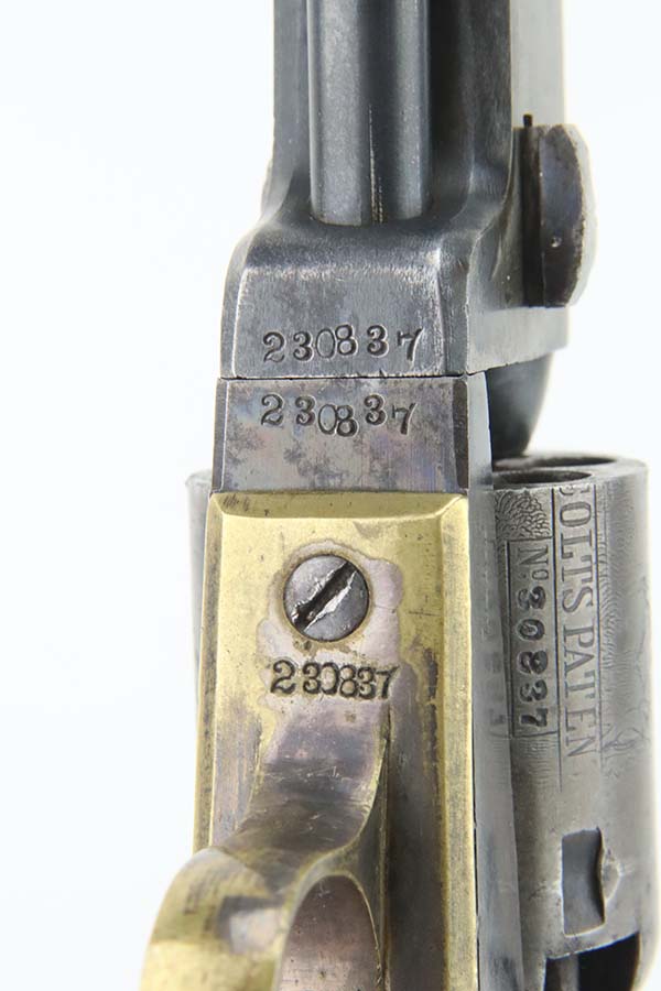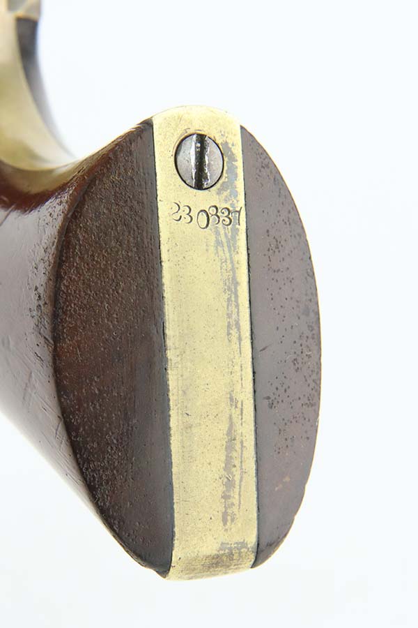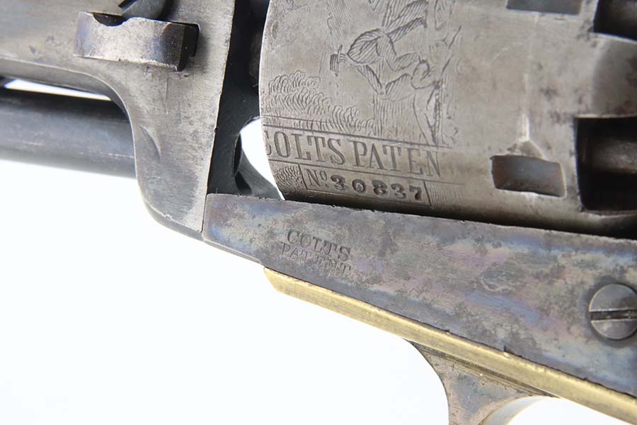 3/28/24 – This is a nice example of a Colt Model 1849 Pocket revolver, manufactured in 1863 and chambered in .31 Caliber. It is all matching and in nice condition overall. Very nice stage coach scene on the cylinder. There is minor thinning throughout, but the original case-hardening is still mostly visible on the frame. The bore has good rifling, but there is light surface oxidation throughout. Fully functional.