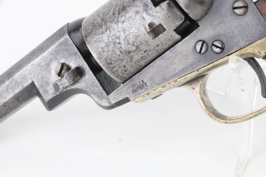 10/7/24 – This is a nice example of a Colt Model 1849 Pocket Revolver from 1856. It is completely matching, has a 3″ barrel, and is chambered in .31 Caliber. There is a stagecoach robbery scene on the cylinder (roughly 50% visibility). Overall, it is in fair condition for its age, but there is significant finish loss, light spotty oxidation, and light pin-pricking throughout. Some small dings in the metal here and there, especially around the barrel wedge. Fitted with period-correct wood grips – minor bruising on both sides and a tiny chip in the bottom corner of the left side. The bore is very nice for its age – great rifling with only very light surface rust. Fully functional. No FFL required.