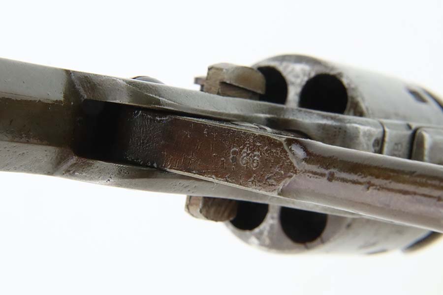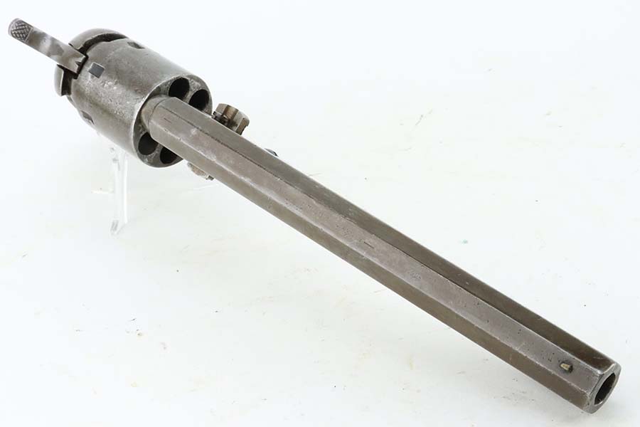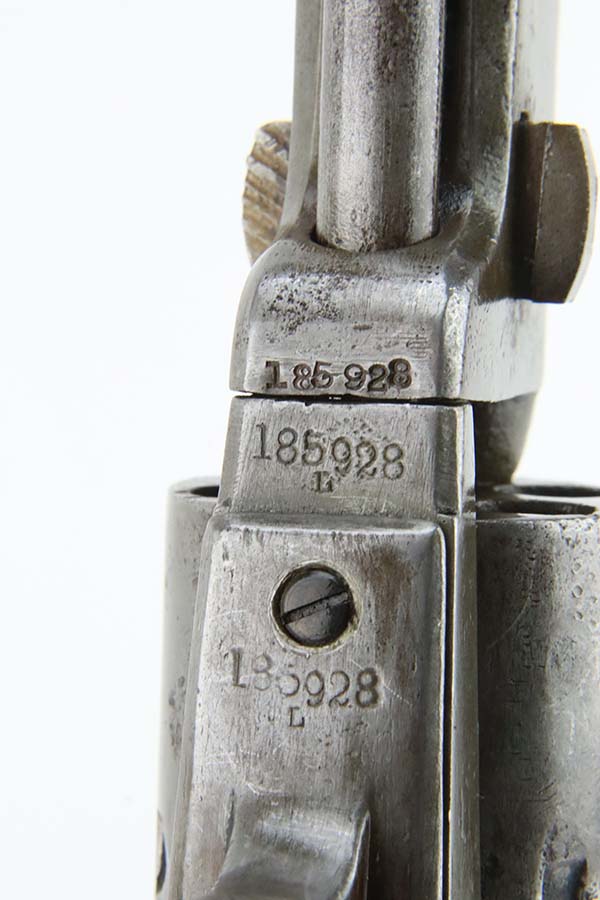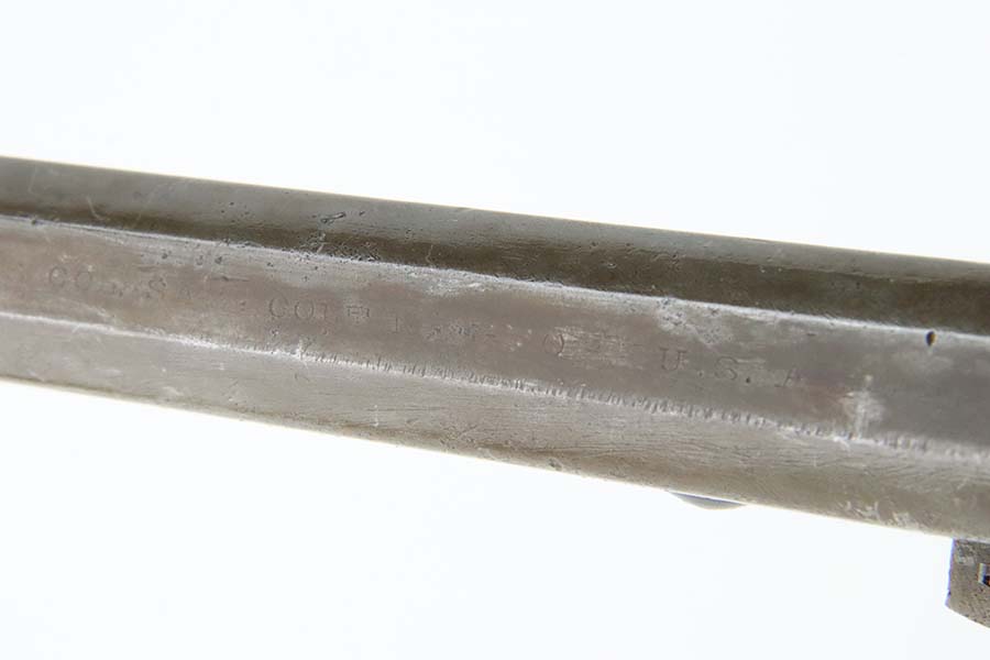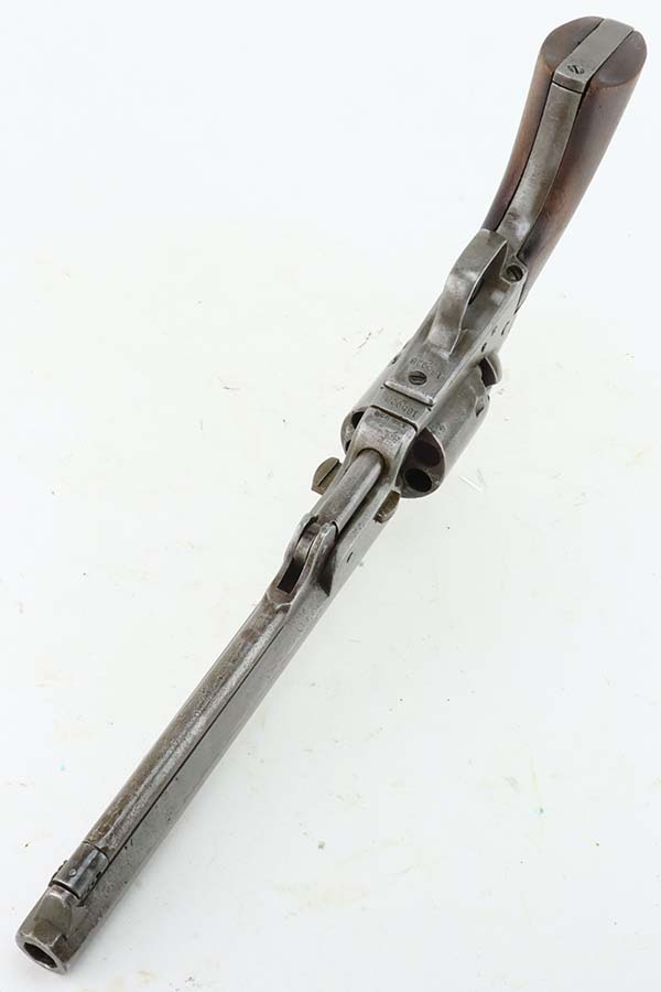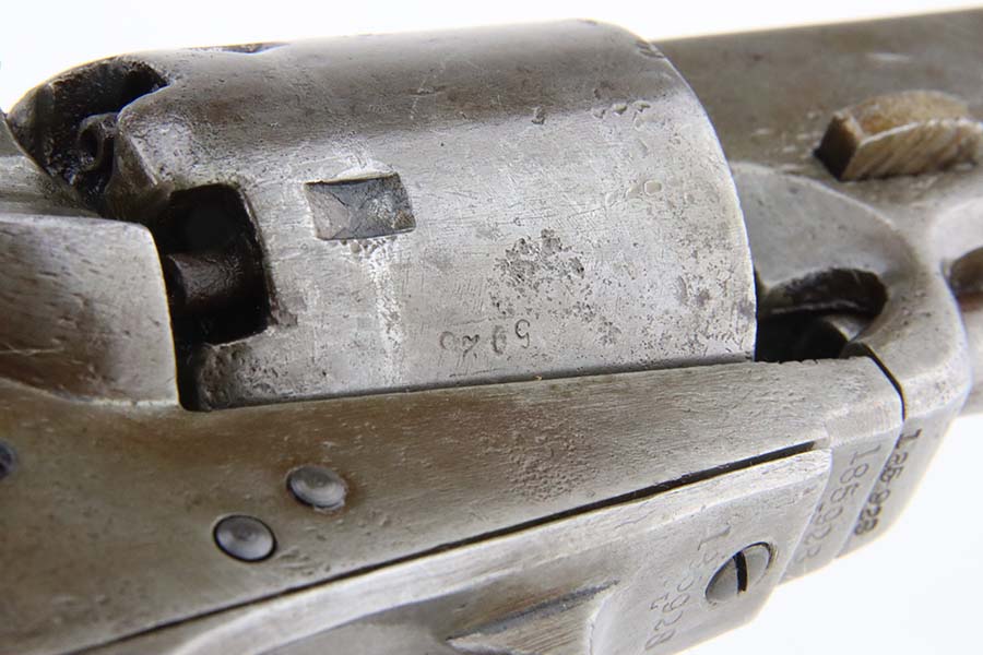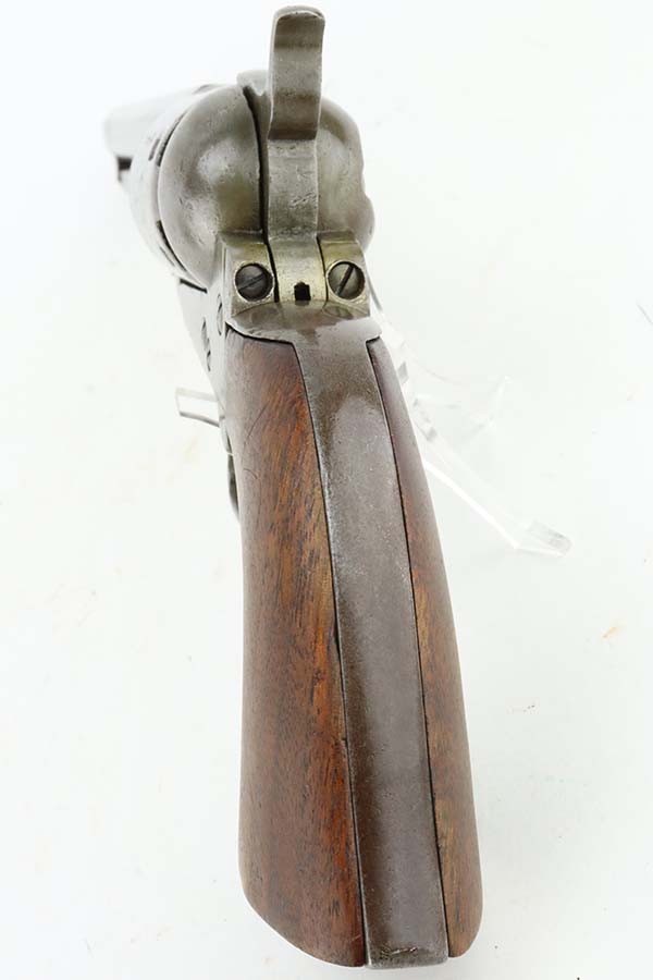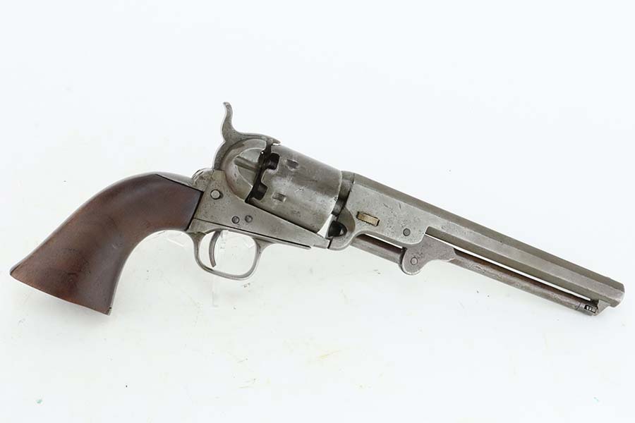 3/13/24 – This is a Colt Model 1851 Navy Revolver, manufactured in 1866 and chambered in .36 Caliber. It is all matching, but the barrel may have been re-numbered to match. The original Naval Engagement scene on the cylinder is entirely worn and not visible. The gun has lost virtually all of its finish with light brown patina and minor pitting throughout. Fitted with nice wood grips. The bore has pretty good rifling, but there is spotty surface rust and oxidation throughout. Fully functional.