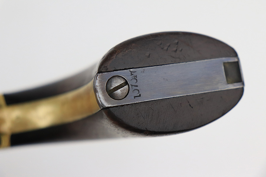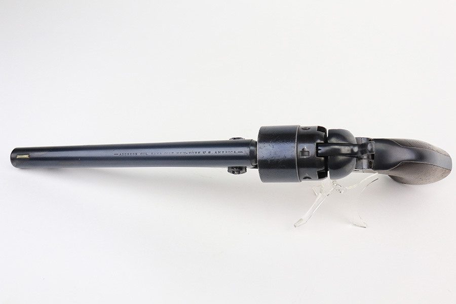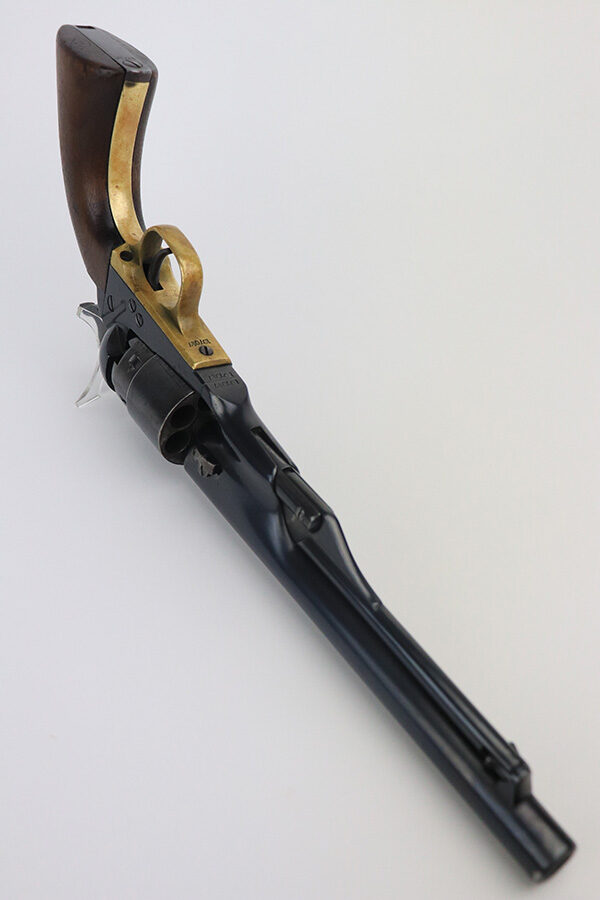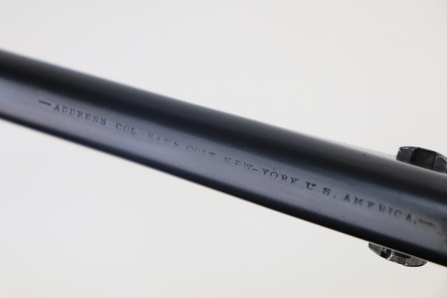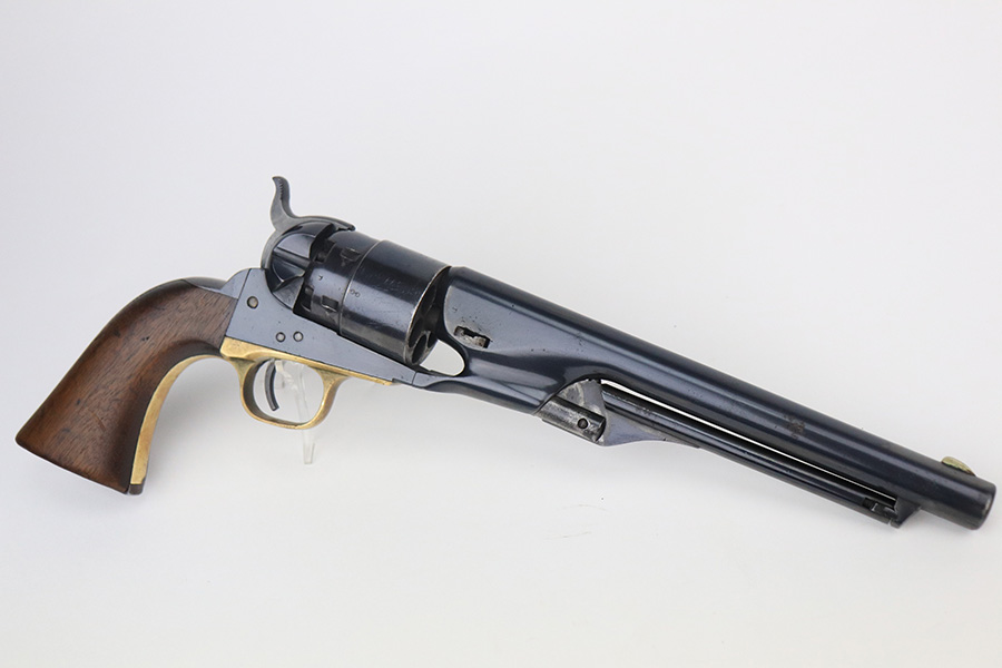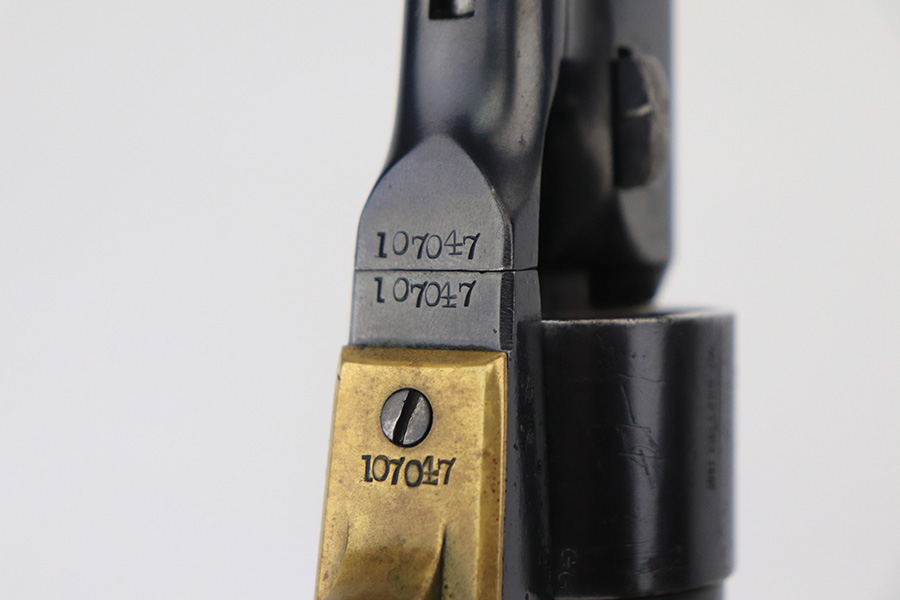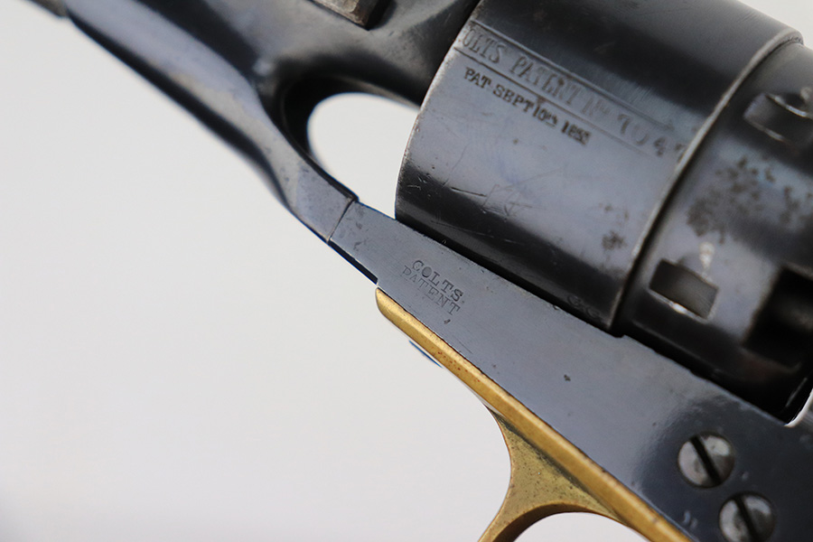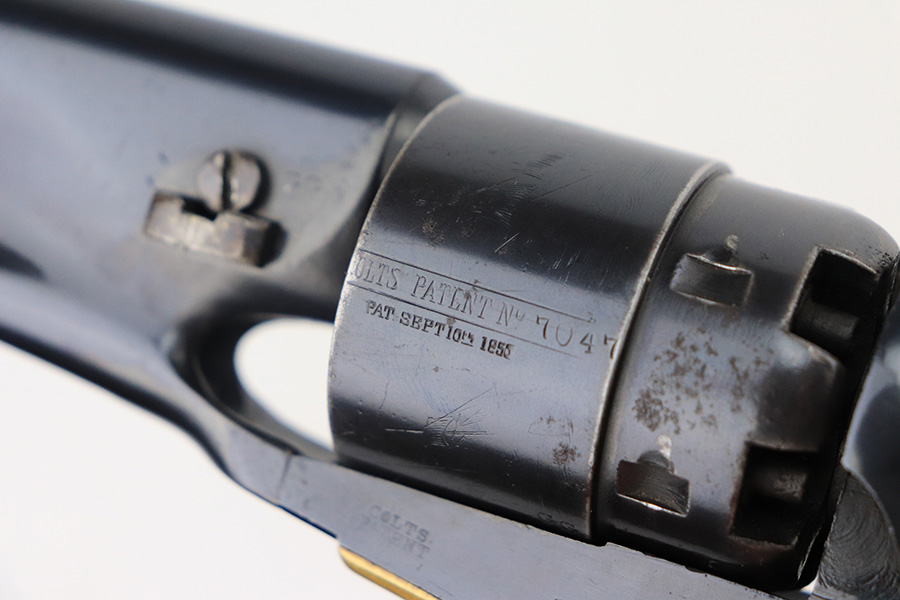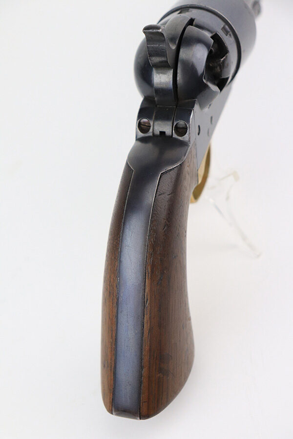 1/26/22 – This is a very nice example of a Colt Model 1860 Army revolver, chambered in .44 Caliber and manufactured in 1863. The gun is all matching and has the iconic Colt Naval engagement scene on the cylinder. There is very little actual finish loss, as we believe the gun has been mostly refinished. There is minor wear around the muzzle and on the high edges of the cylinder. Light roll mark as well. There areas of tiny pits here and there that have been blued-over, most noticeable on the right side the barrel. The scene on the cylinder is faint for the most part. The back strap has been blued. The brass frame has tiny spots of discoloration throughout from age. The cylinder is tight. The barrel wedge is missing the tiny spring, but it does stay in place. The bore has good rifling, but there is spotty oxidation throughout.