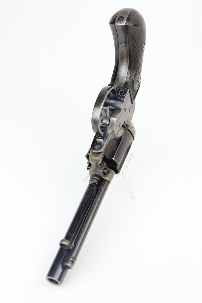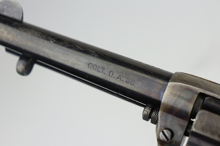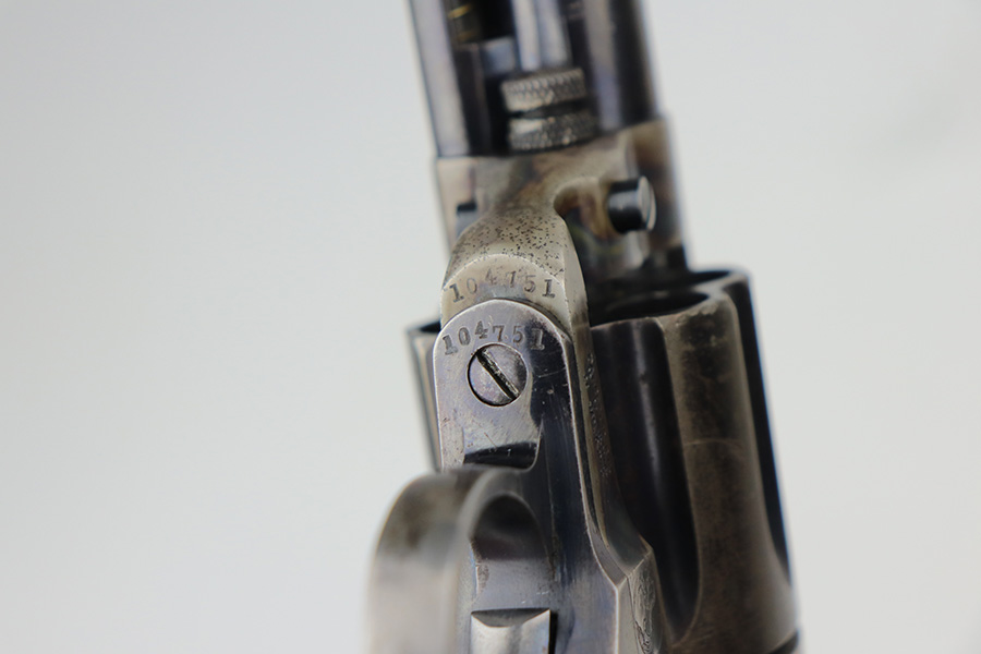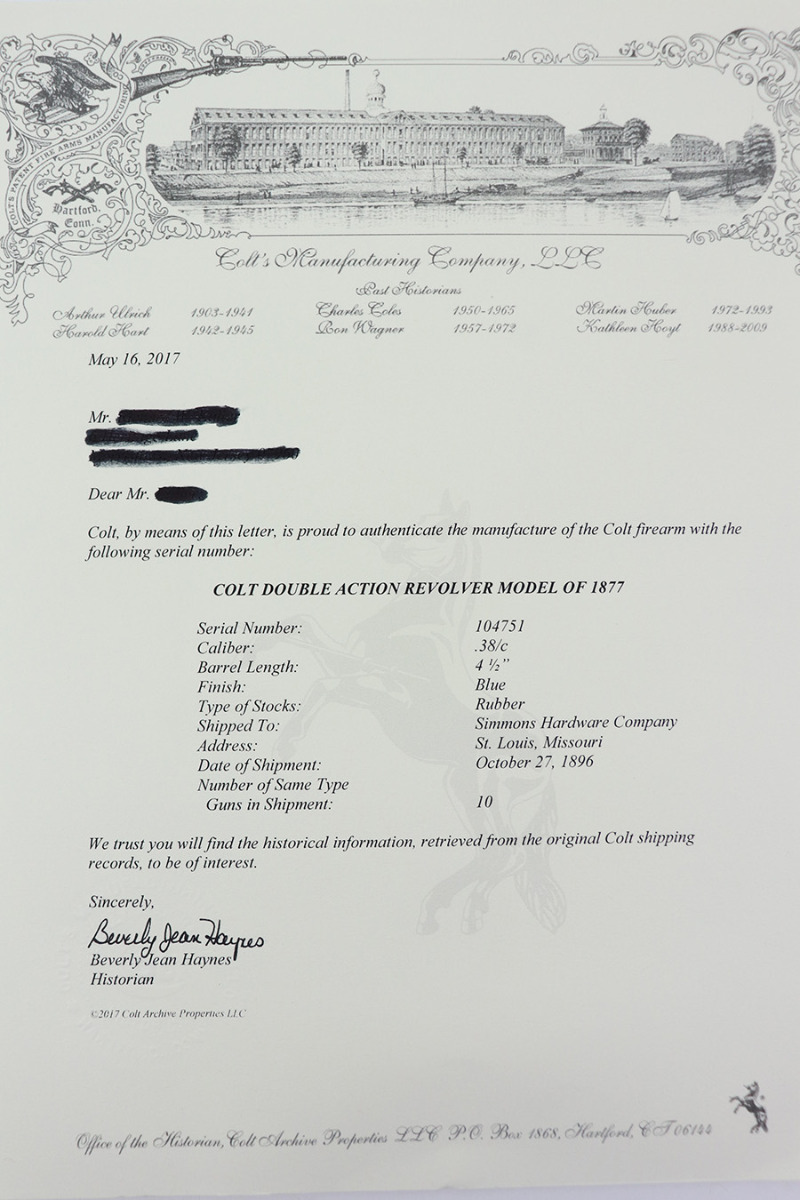 5/12/21 – Here’s a pretty nice old antique Colt Model 1877 “Lightning” revolver. Comes with a Colt archive letter stating it shipped to a hardware company in St. Louis in 1896. The Model 1877 was Colt’s first attempt at a double action revolver and is chambered for the .38 Long Colt cartridge. It has an outward appearance similar to that of the famous Single Action Army with a solid frame and loading gate. This revolver wears a 4-1/2″ barrel with ejector rod. The serial number is matching on frame, trigger guard, backstrap, cylinder and both hard rubber grips. Overall condition is decent and there is quite a bit of the case hardening remaining. Obvious finish loss on cylinder, grip frame and side of barrel, with some pitting along the top of frame. The original hard rubber grips are in good shape with minor smoothing. This revolver functions well in double action, but hammer occasionally doesn’t stay all the way back in single action. Timing is good and lock-up is excellent with the trigger held to the rear. The bore is excellent. Antique so no license required. Also includes 20 rounds of vintage .38 Long Colt ammunition.